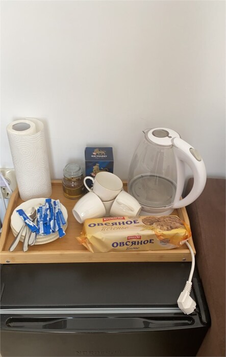 В номере есть чайник, чашки, стаканы, холодильник, телевизор, шкаф.