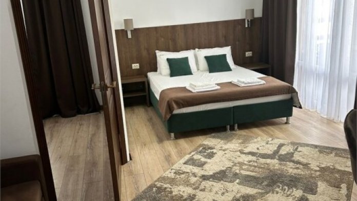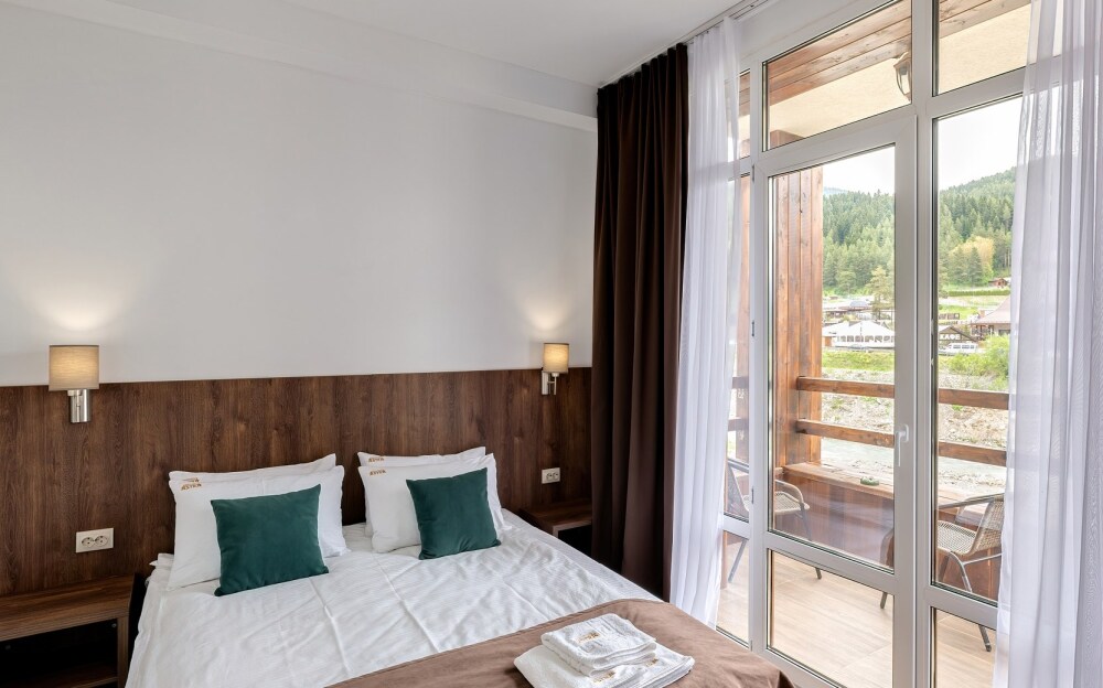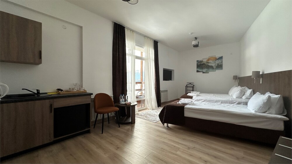 В одной комнате 1 двуспальная кровать и раскладной диван, в другой две односпальные кровати. Шкаф, холодильник, электрический чайник, телевизор, чайный набор, фен, косметические принадлежности, журнальный столик, стул, балкон с видом на горнолыжный курорт, бесплатная парковка.