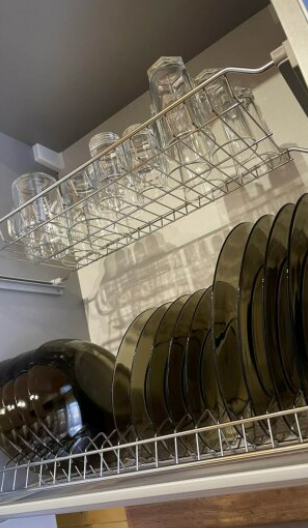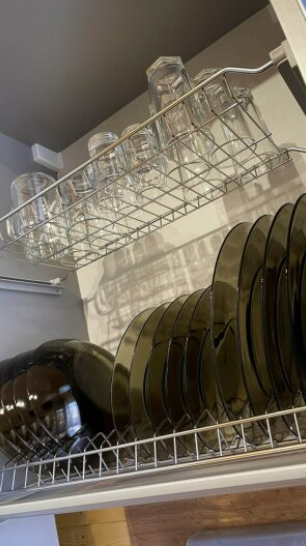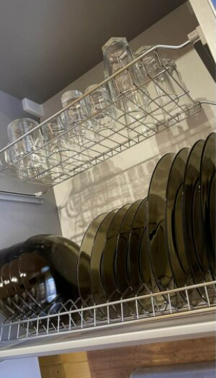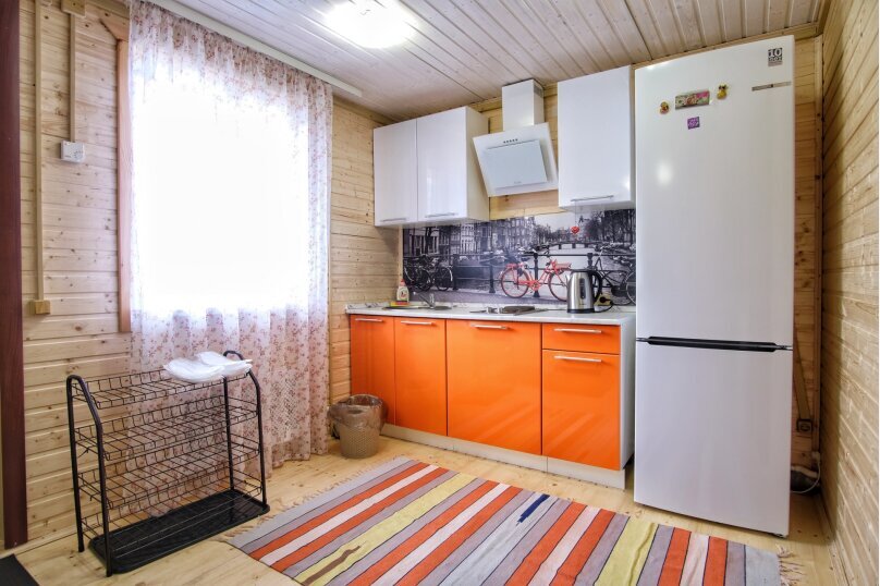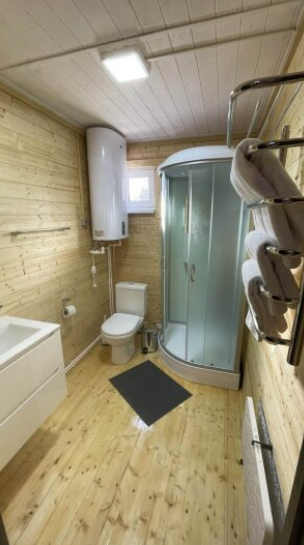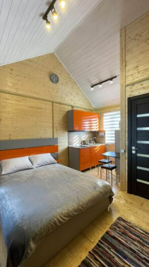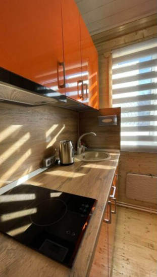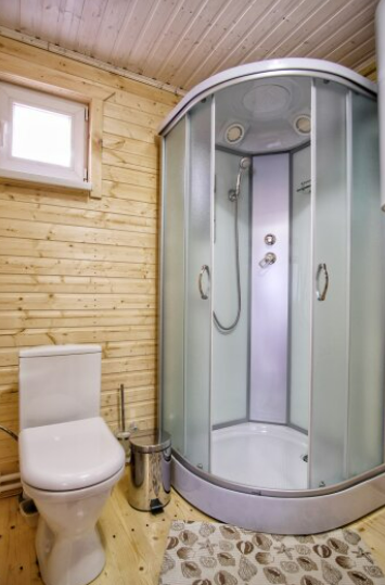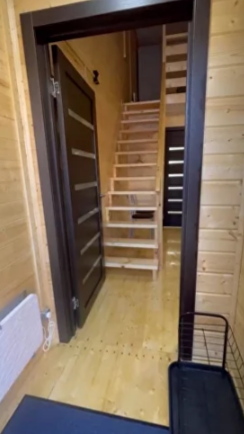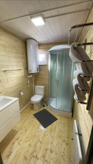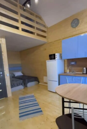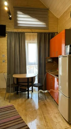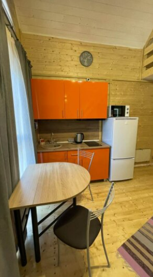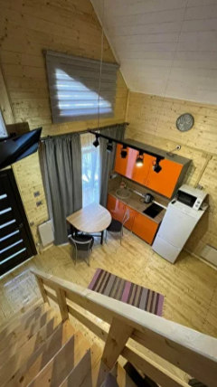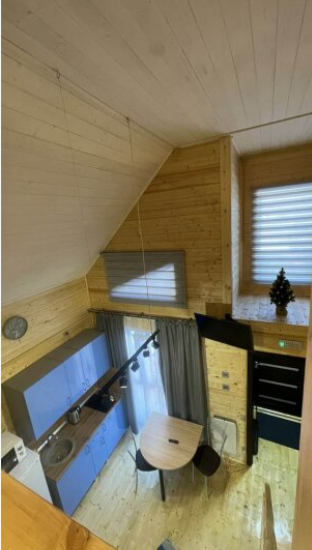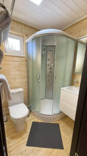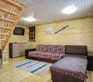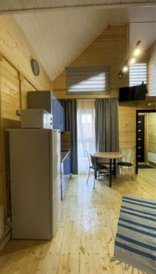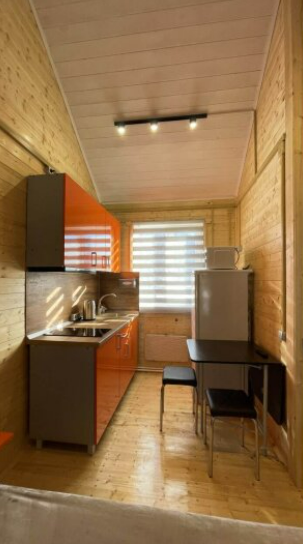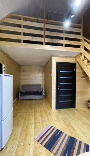На первом этаже дома расположены: прихожая, кухня, комфортный диван для большой компании, санузел с душевой кабиной.