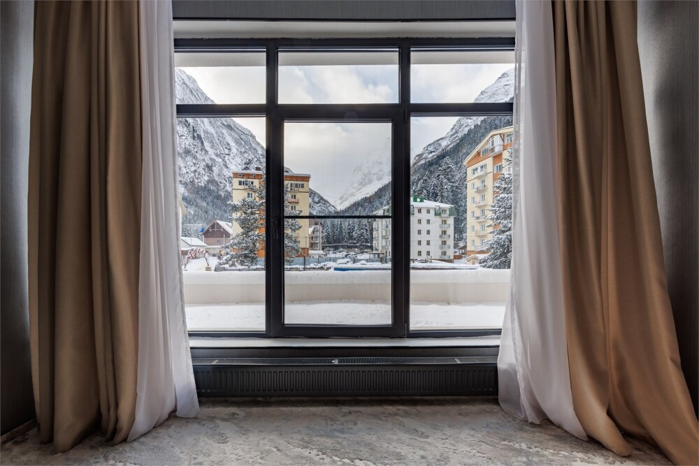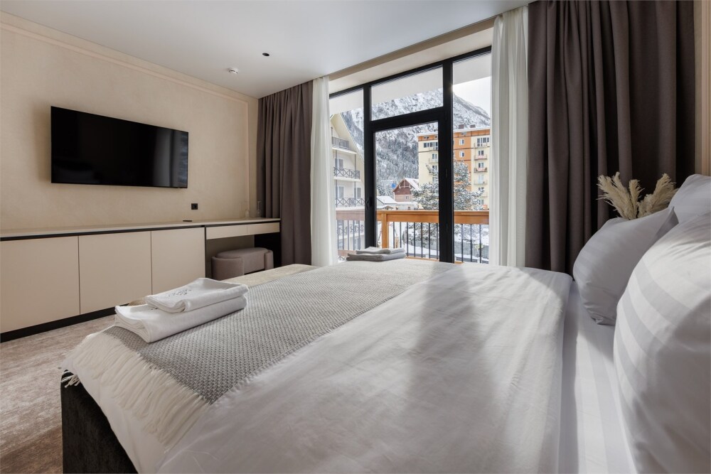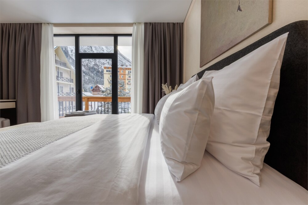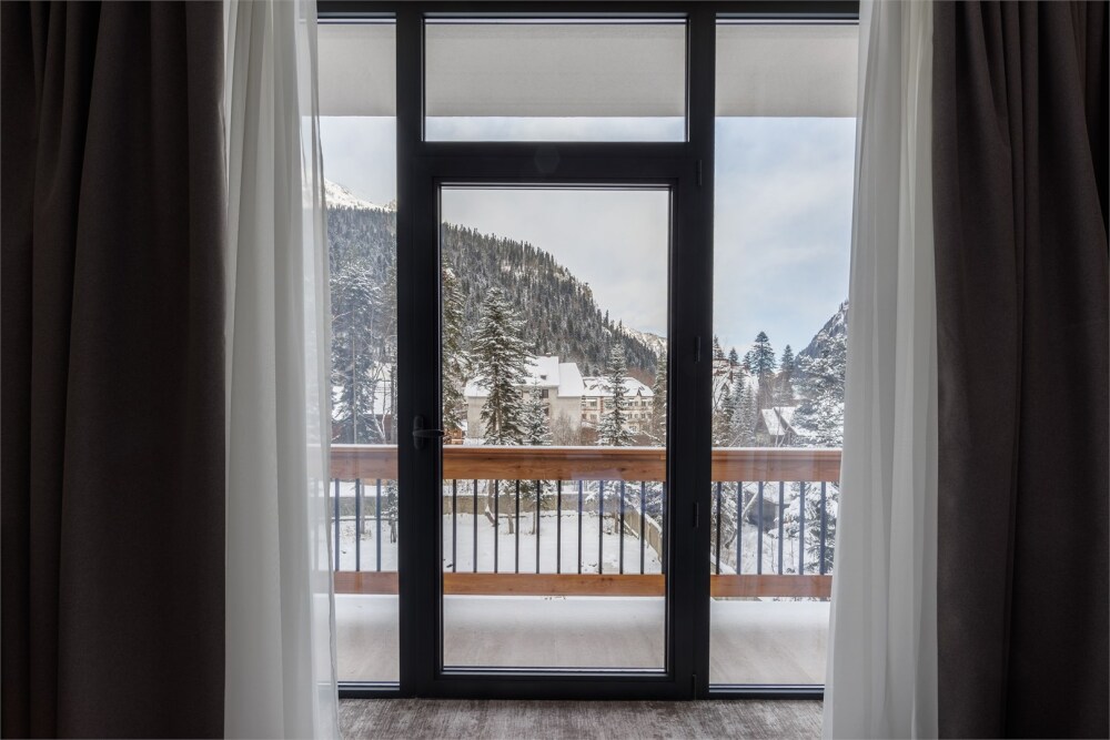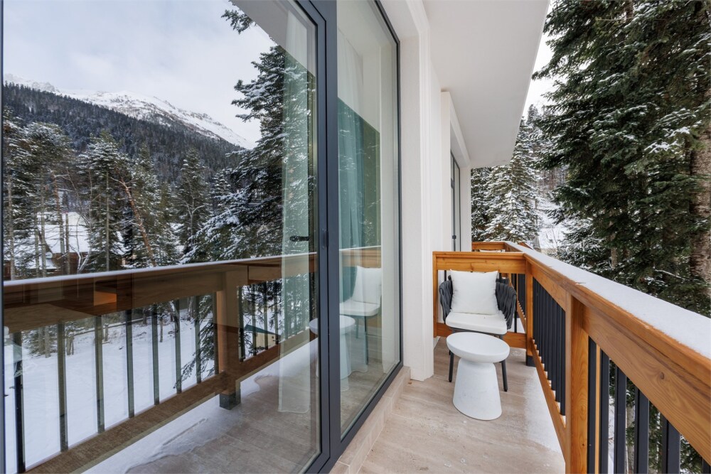 Просыпайтесь среди облаков в номере с панорамными окнами от пола до потолка. Ваша личная терраса открывает захватывающий вид на величественные горные хребты.