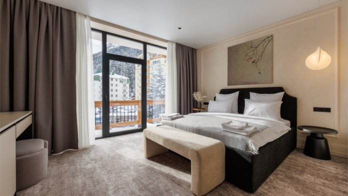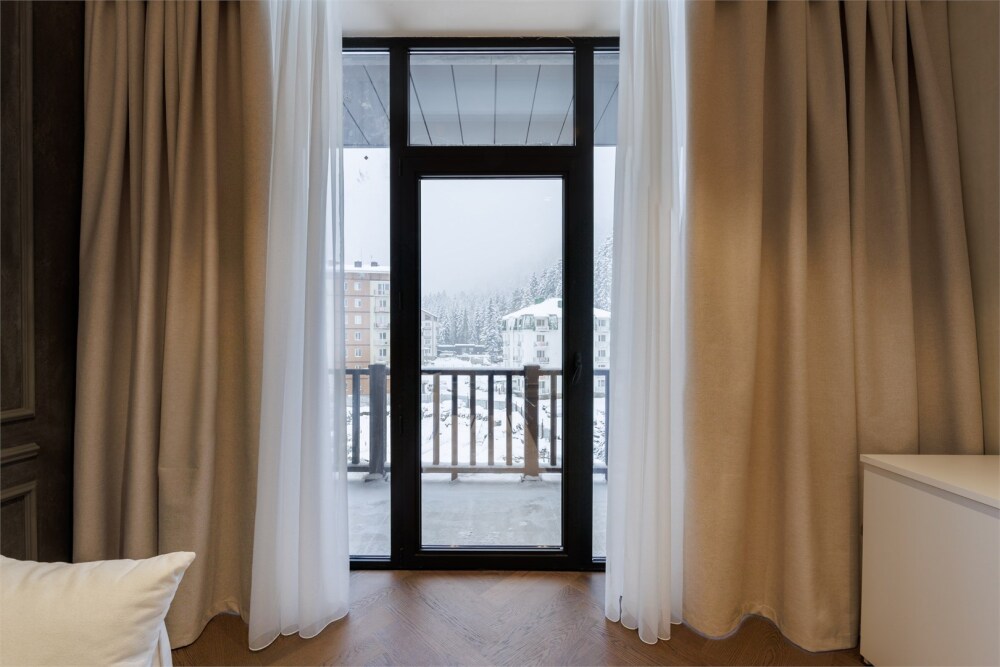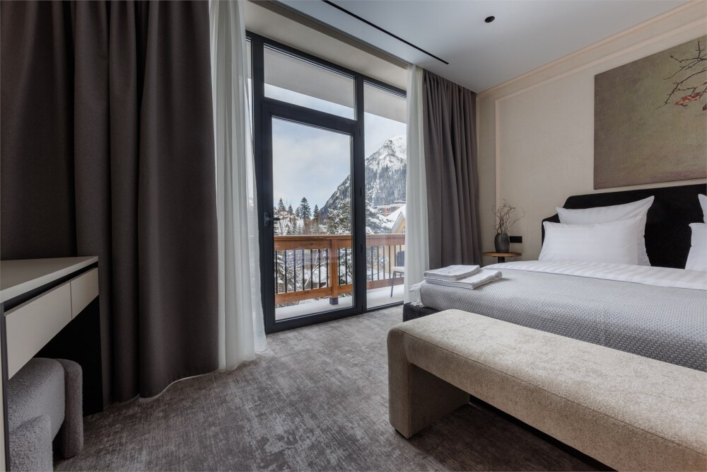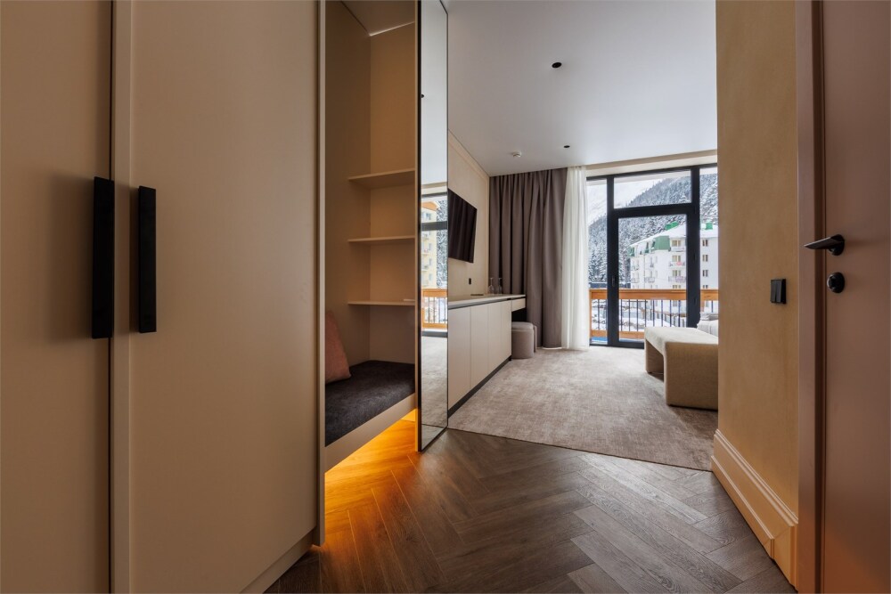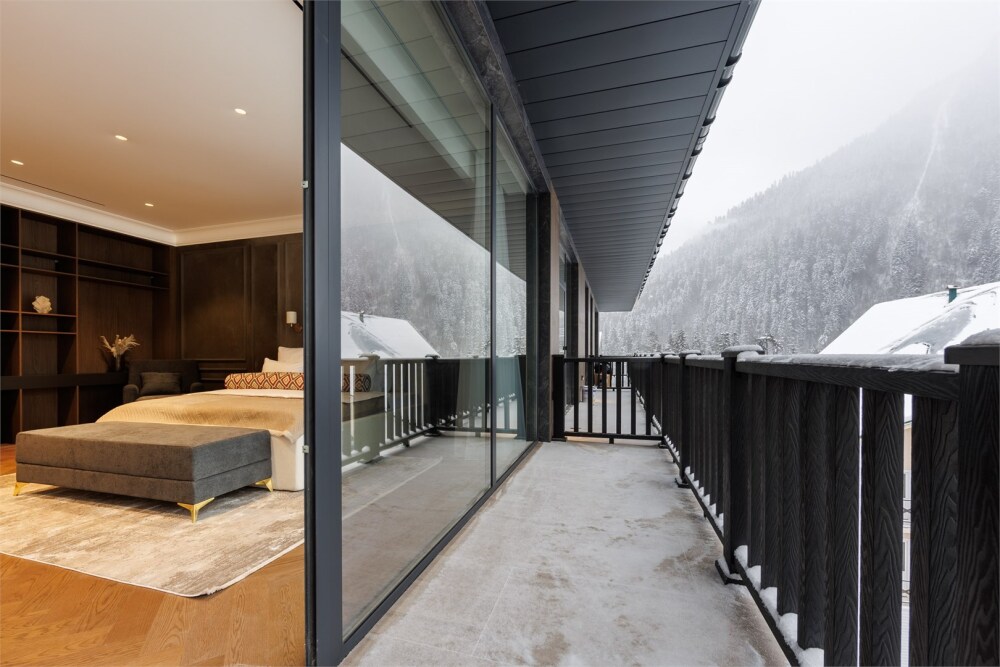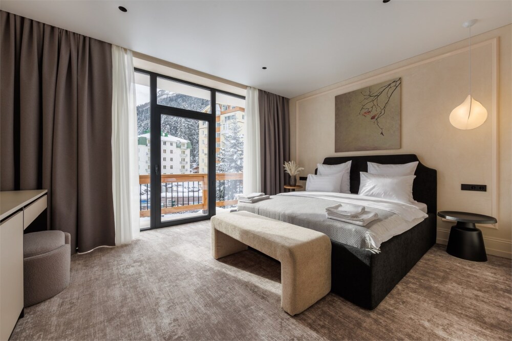 Просыпайтесь среди облаков в номере с панорамными окнами от пола до потолка. Ваша личная терраса открывает захватывающий вид на величественные горные хребты.