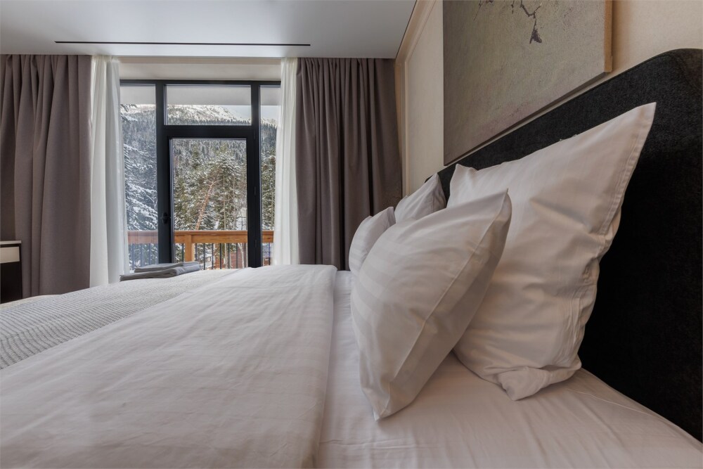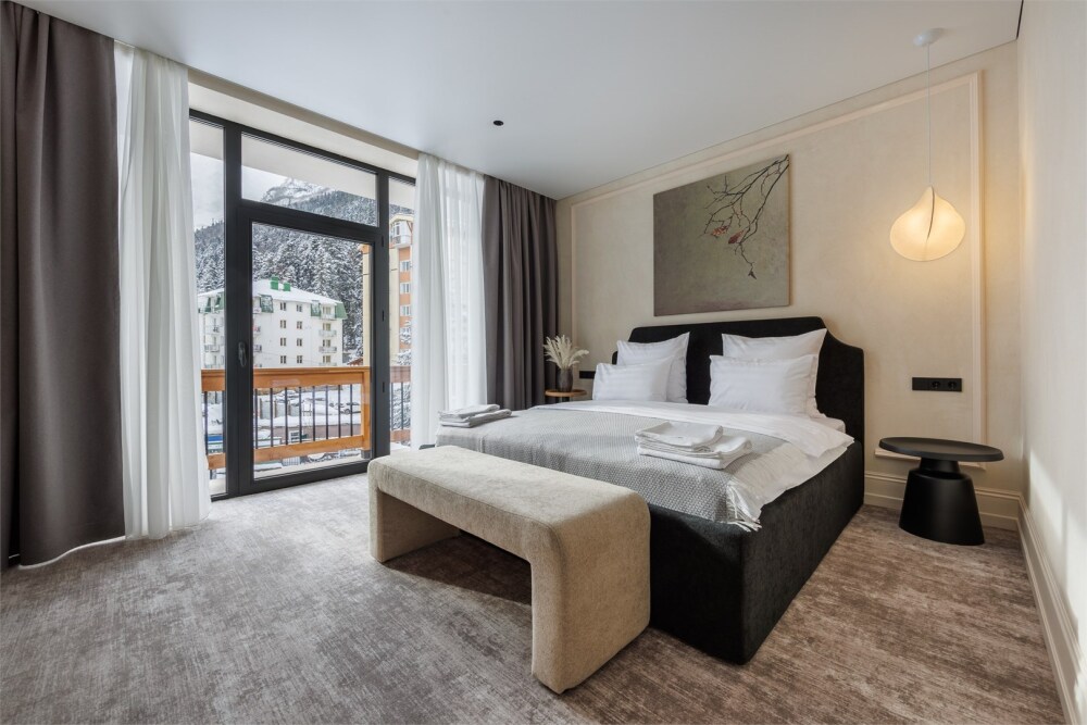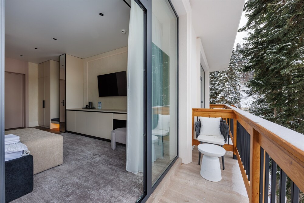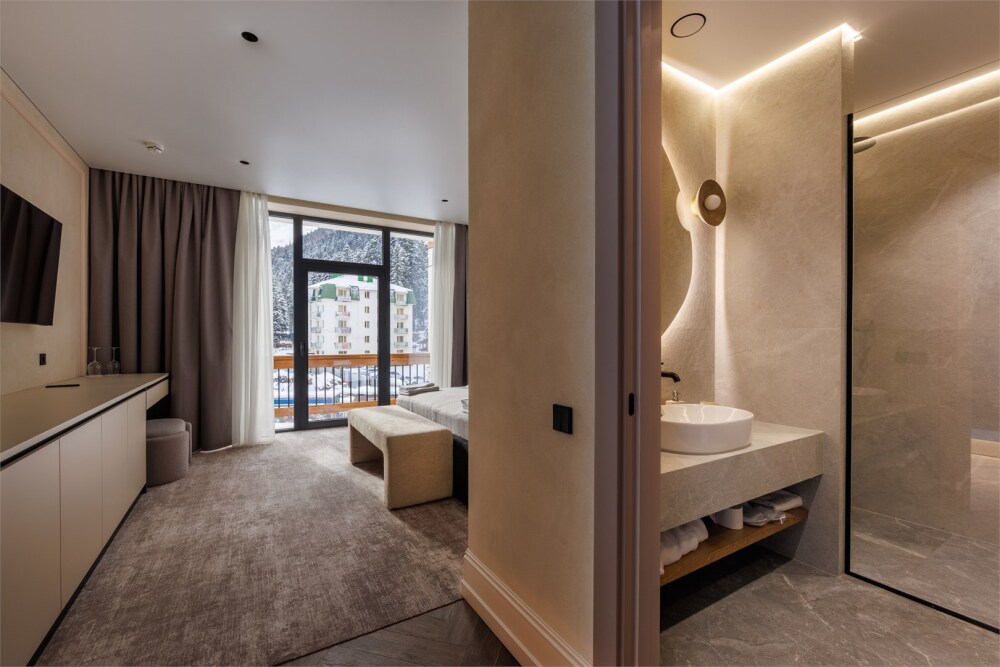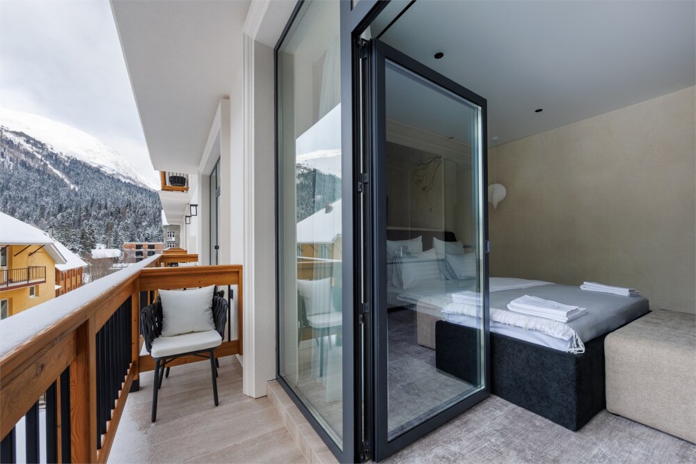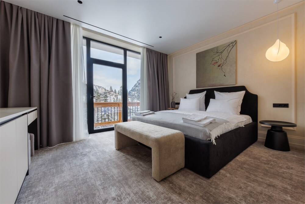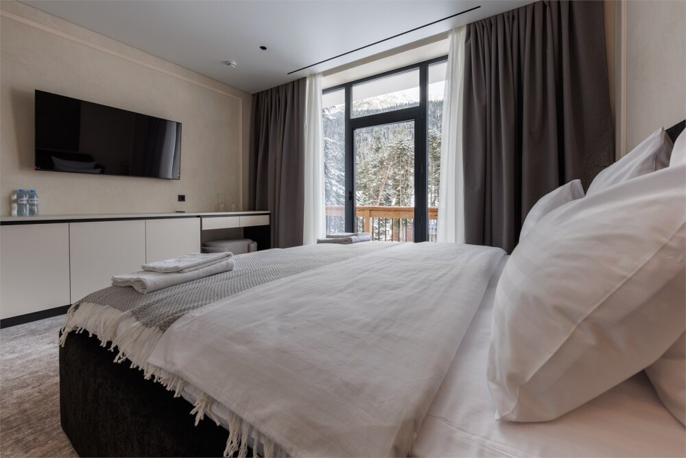 Просторное убежище для тех, кто ценит и личное пространство, и единение с природой. Номер состоит из гостиной с выходом на балкон и отдельной спальни, каждая — с огромными панорамными окнами, открывающими гипнотизирующий вид на горные вершины.