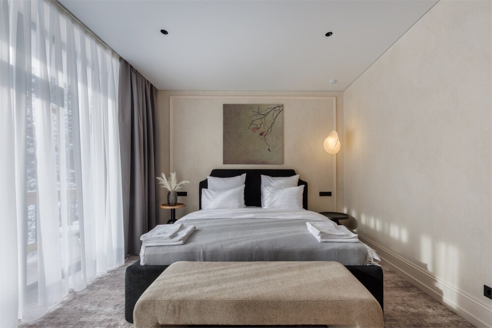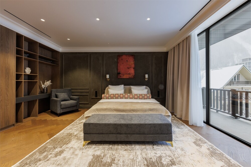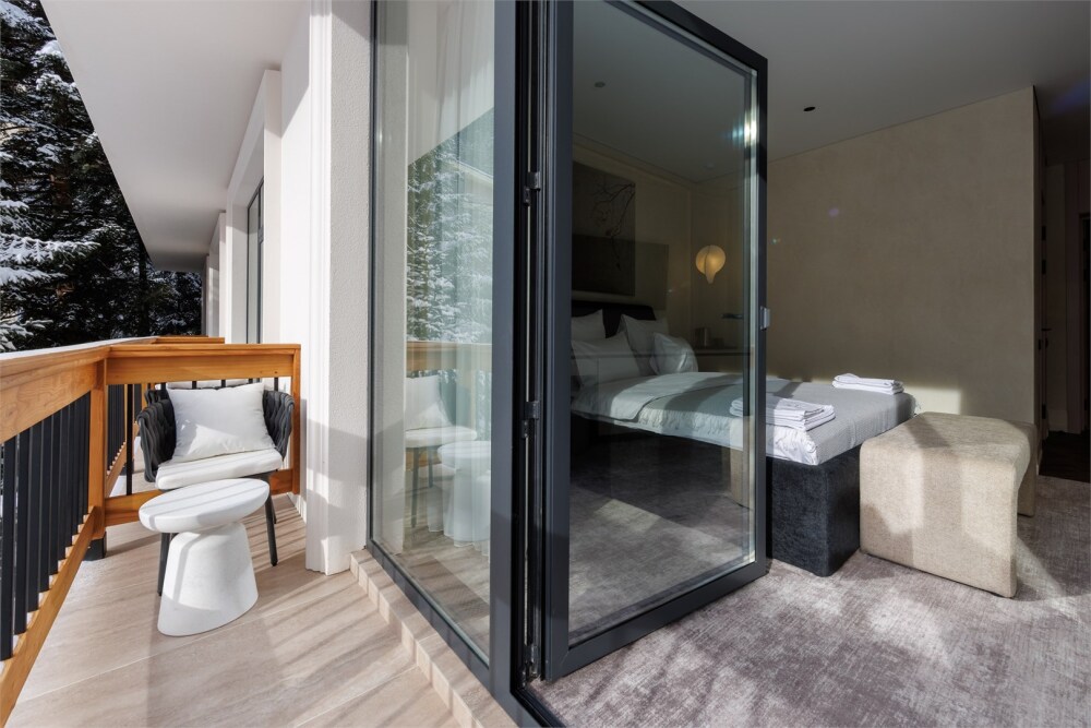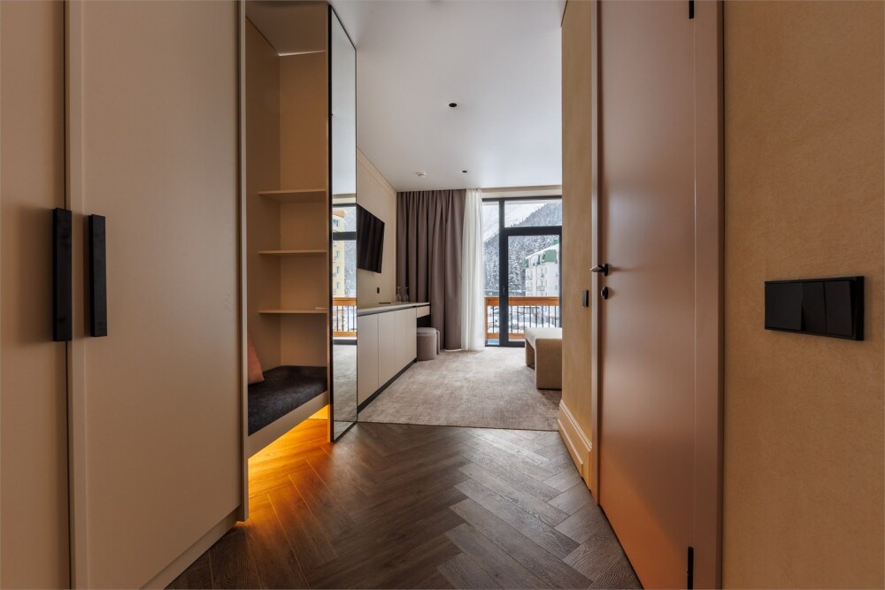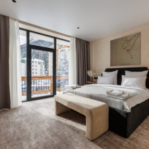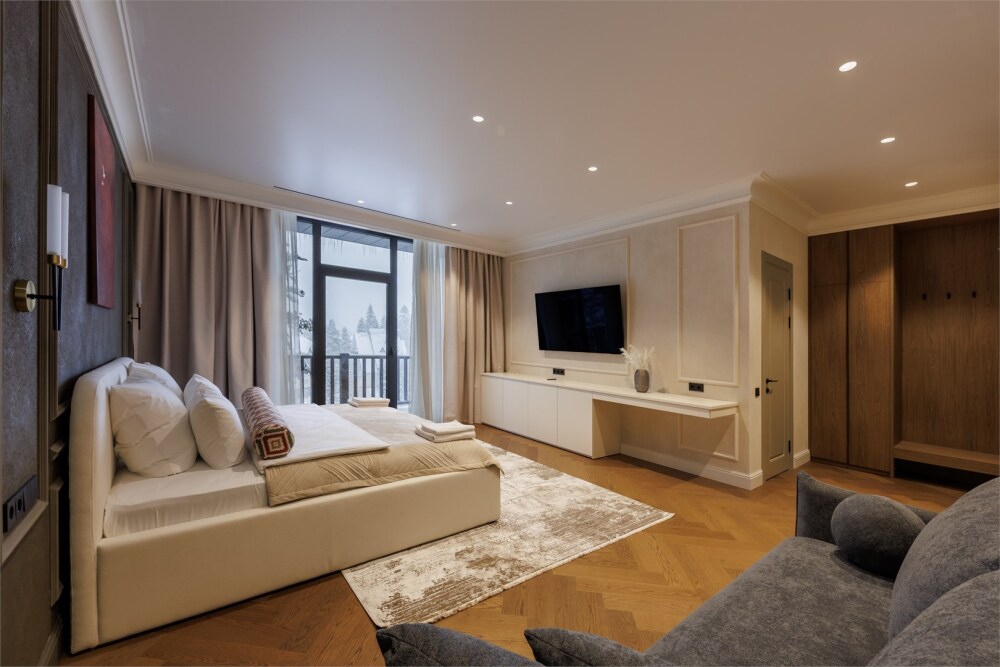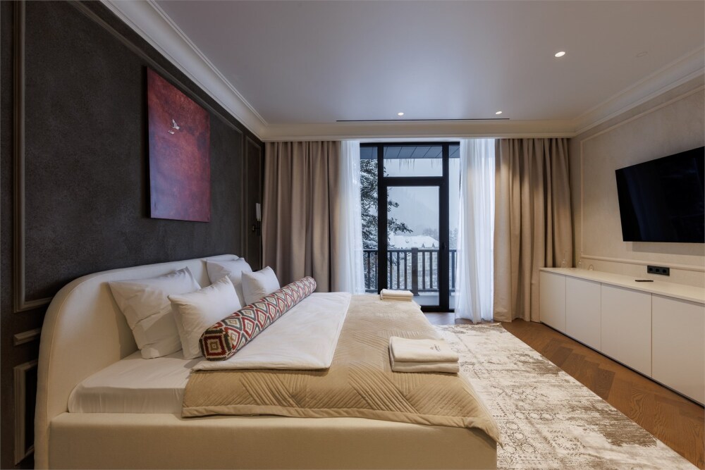 Просторное убежище для тех, кто ценит и личное пространство, и единение с природой. Номер состоит из гостиной с выходом на балкон и отдельной спальни, каждая — с огромными панорамными окнами, открывающими гипнотизирующий вид на горные вершины.