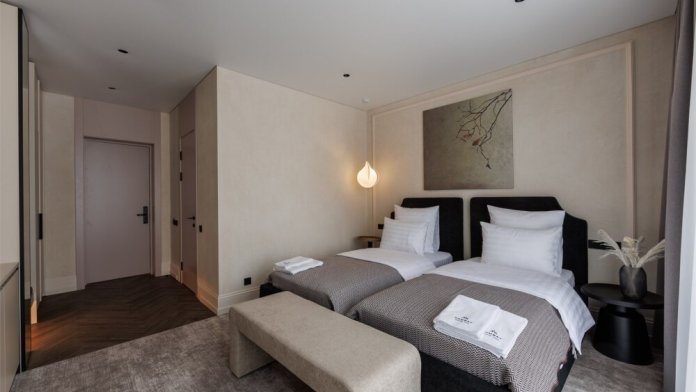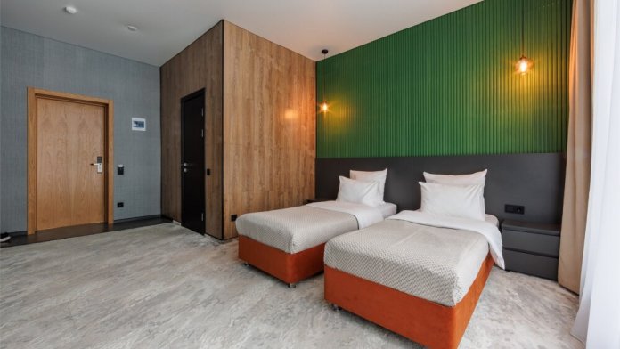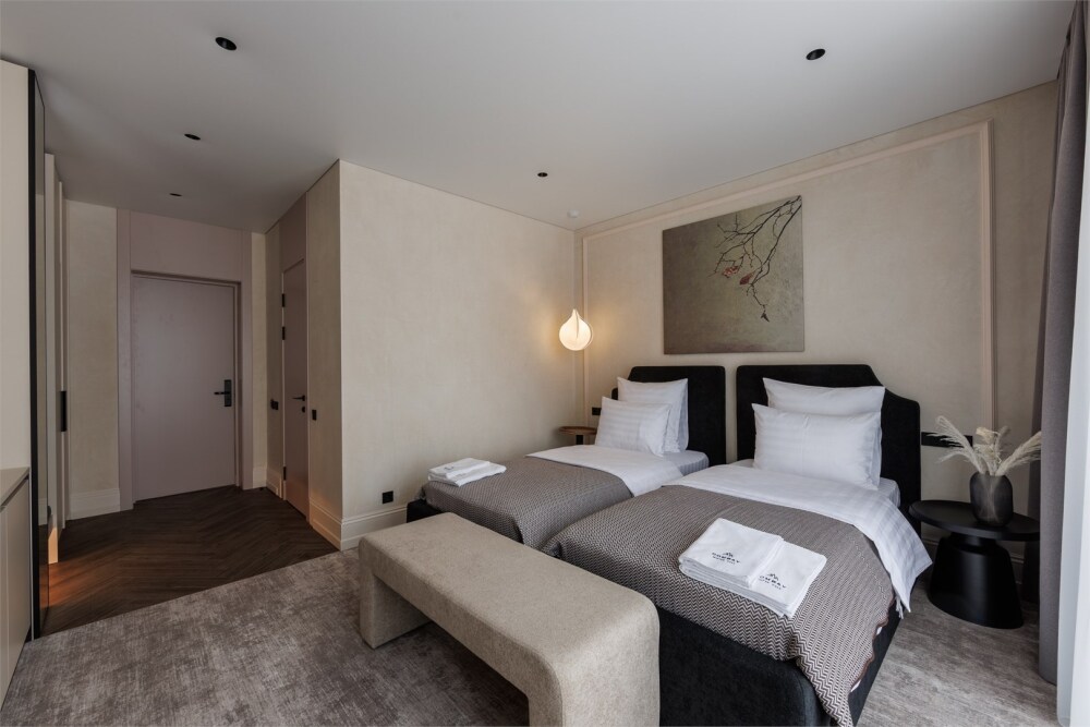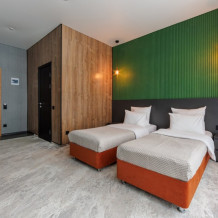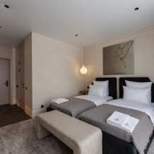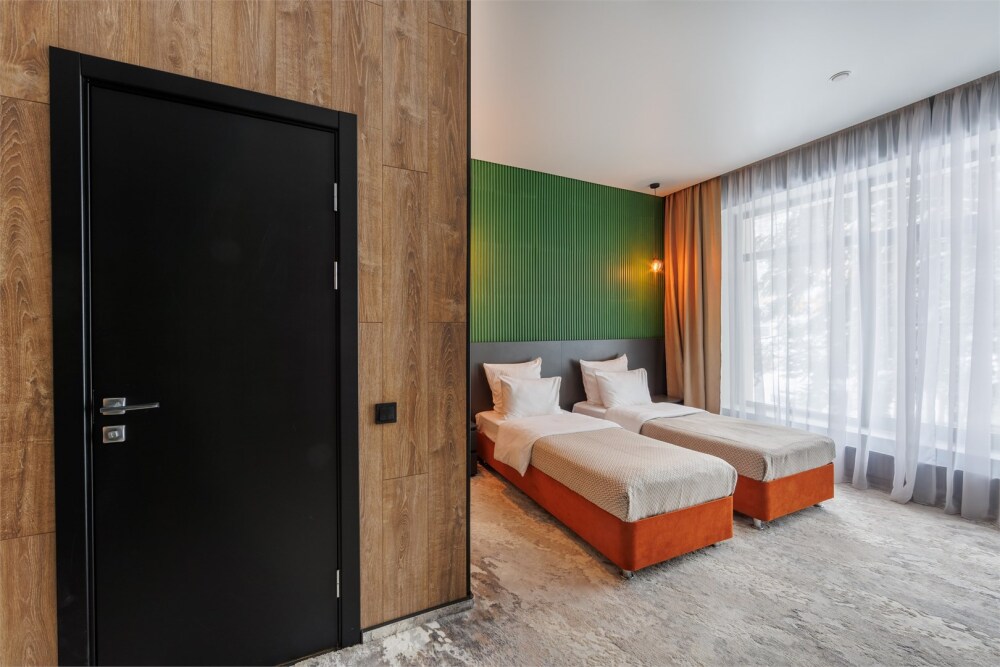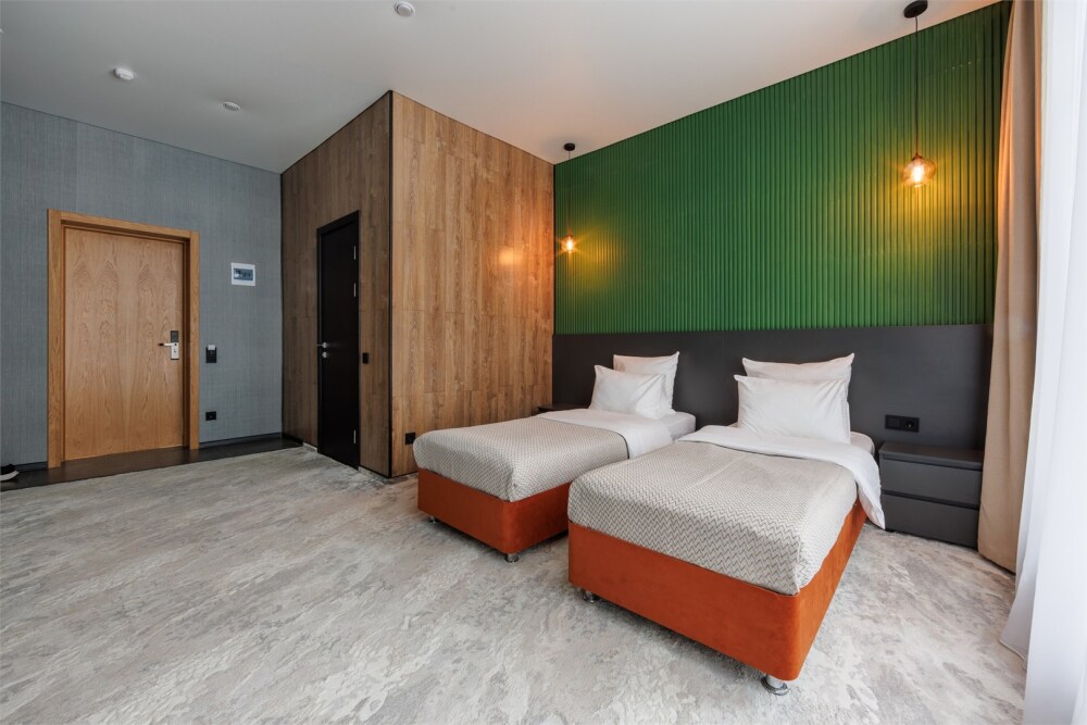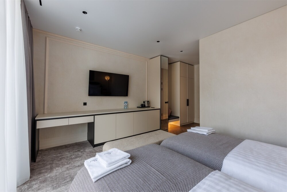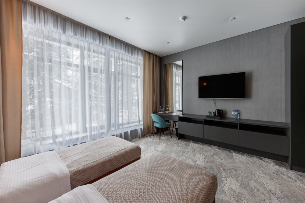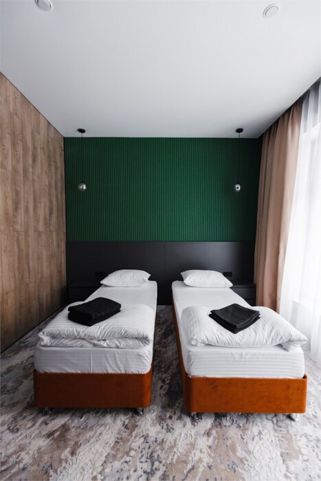 Комфортабельный номер площадью 25 м², идеально подходящий для друзей или коллег. В вашем распоряжении две удобные односпальные кровати, современный телевизор со Smart TV и собственная ванная комната. Мы позаботились о деталях: приготовили для вас мягкие халаты, тапочки и набор полотенец. Наслаждайтесь чаем и создавайте нужную атмосферу с помощью затемнённых штор.
