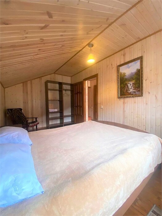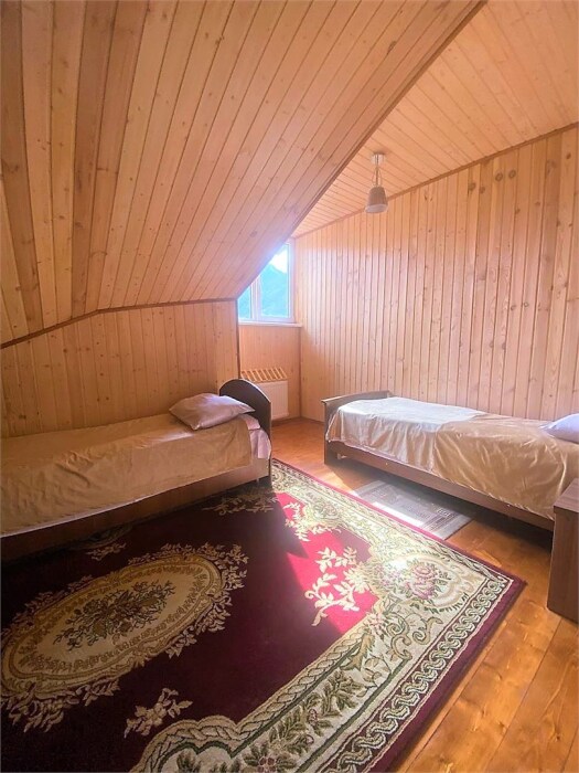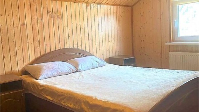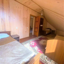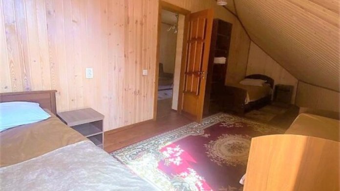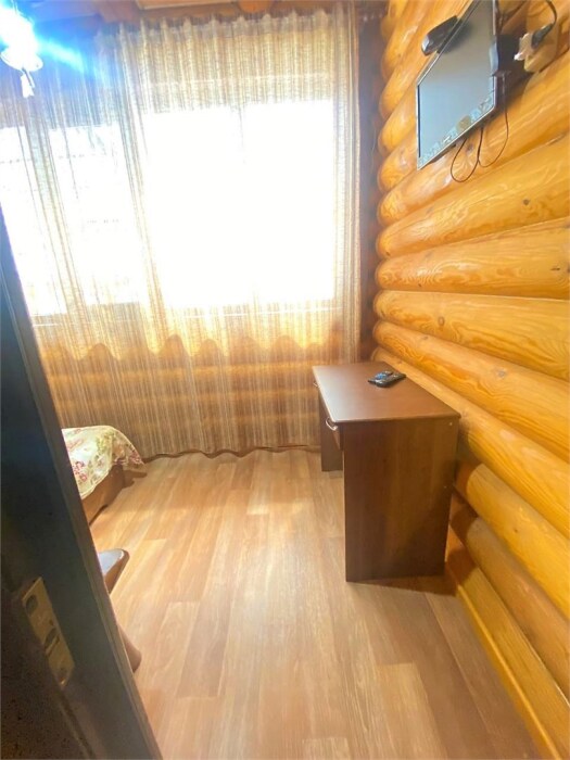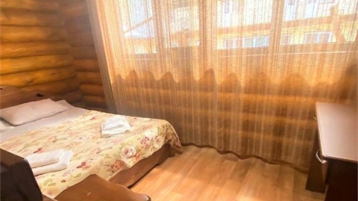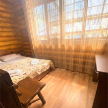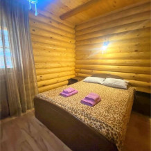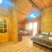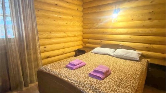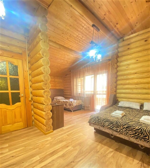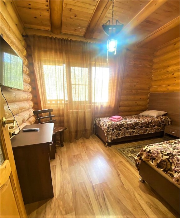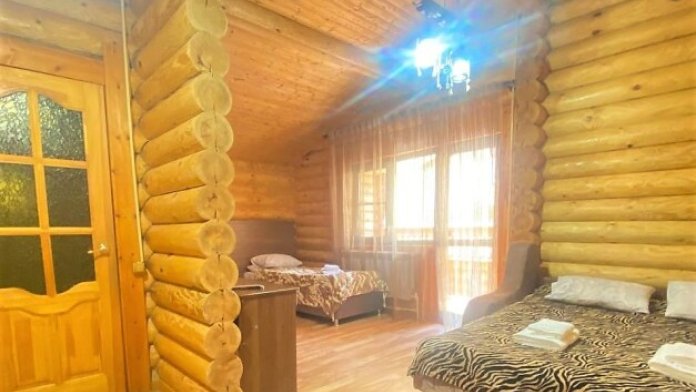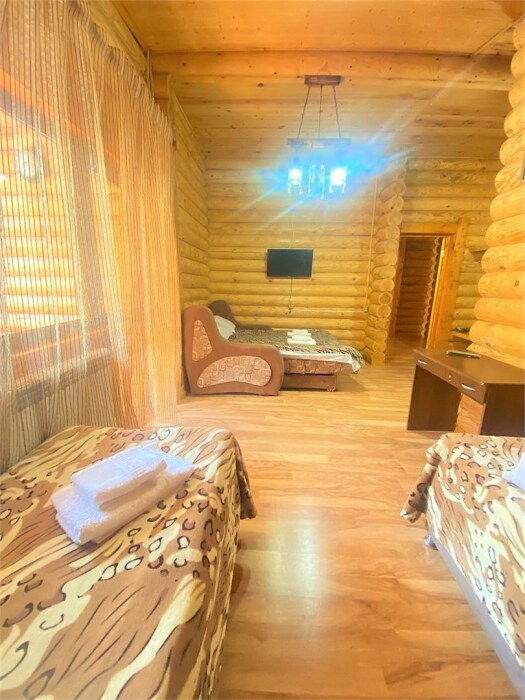 Двухкомнатный номер для семьи из 4 человек в доме из сибирского сруба. Две односпальные кровати и одна двуспальная кровать. В номере есть все удобства для комфортного семейного отдыха.