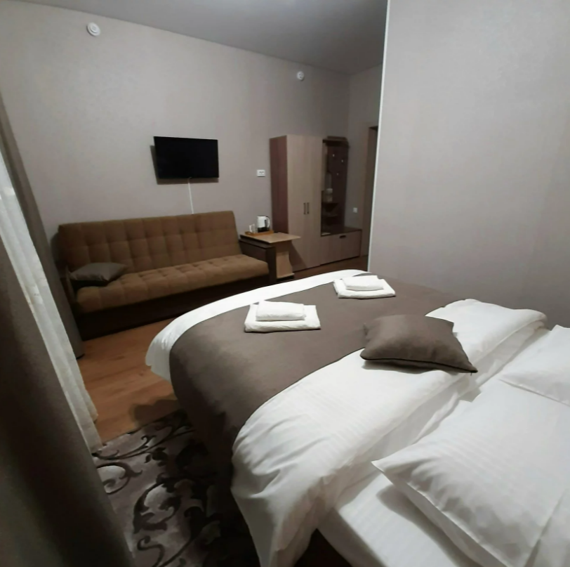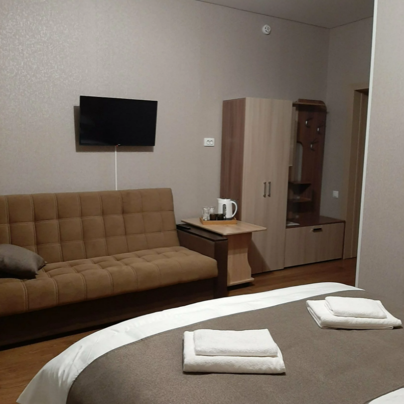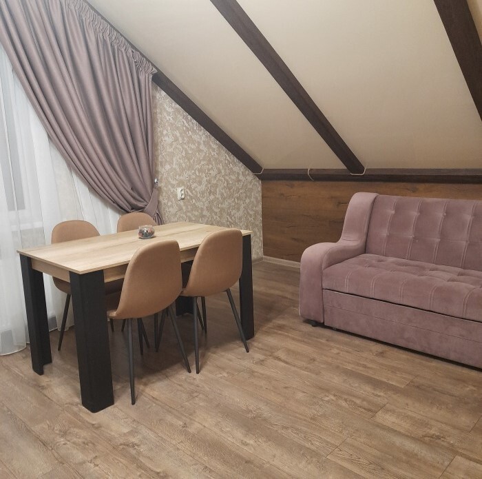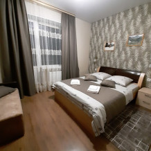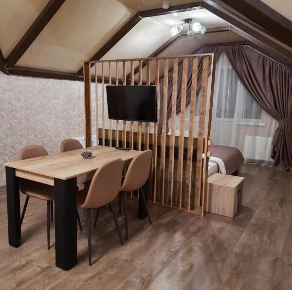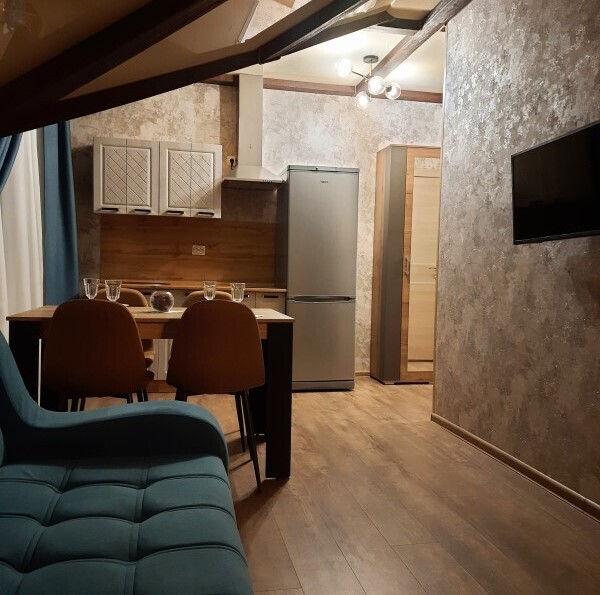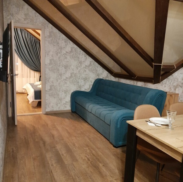 Студия с кухней, расположены на третьем этаже с балконом с шикарным панорамным видом на горы. Состоят из одной большой комнаты, выделены зоны гостиной, кухни и спальни.