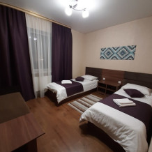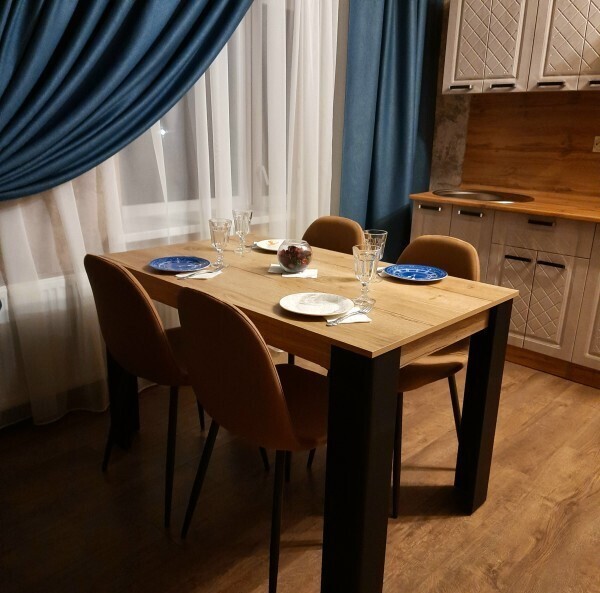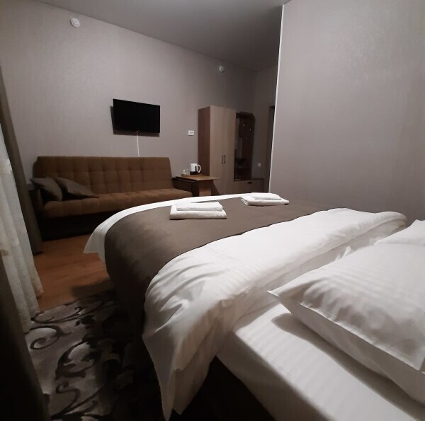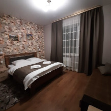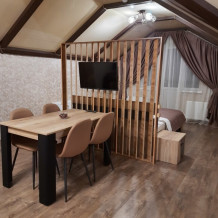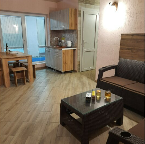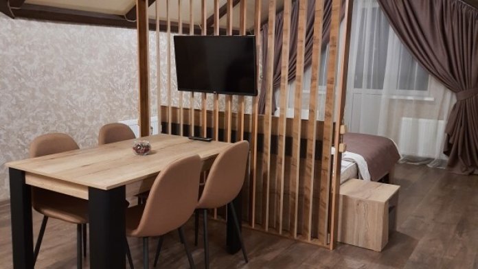 Состоят из двух комнат: гостиной и спальни. В гостиной есть кухонная зона с большим обеденным столом, и зона отдыха с большим диваном и телевизором. В спальне большая двуспальная кровать с ортопедическим матрасом, шкаф для одежды.