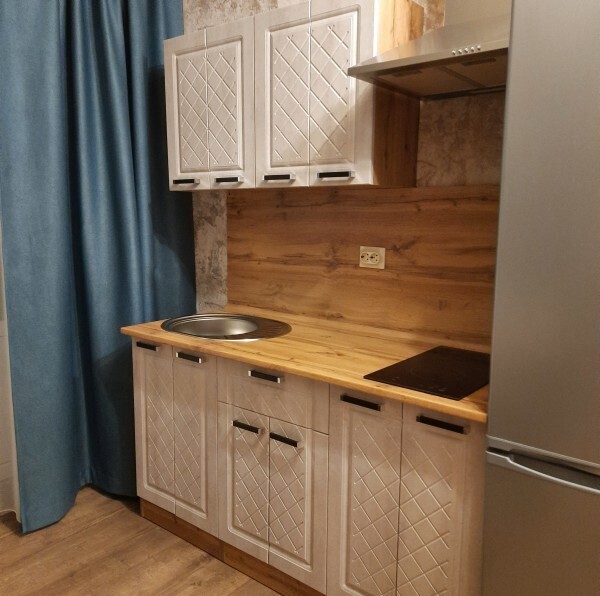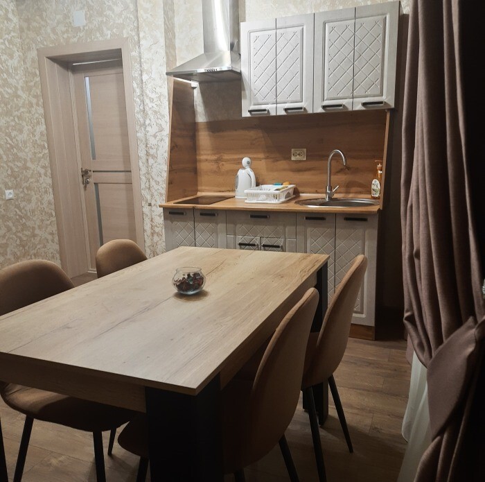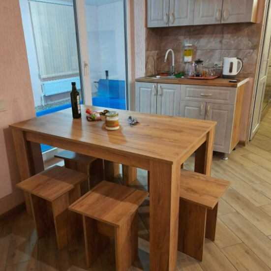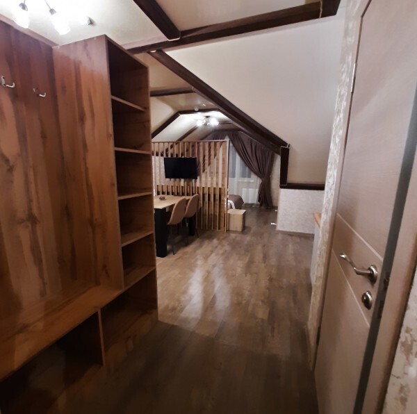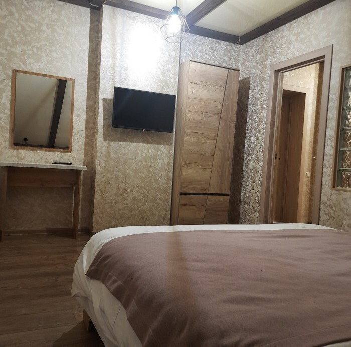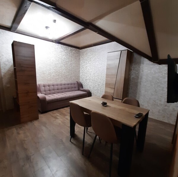 В зоне гостиной есть кухонная зона с обеденным столом, и зона отдыха с диваном и телевизором. В зоне спальне большая двуспальная кровать с ортопедическим матрасом, шкаф для одежды.