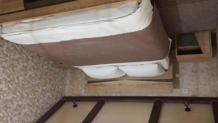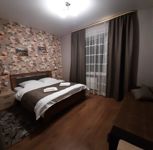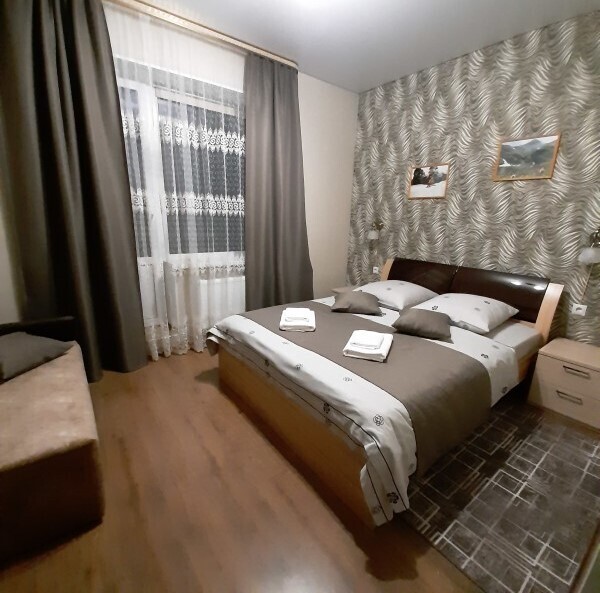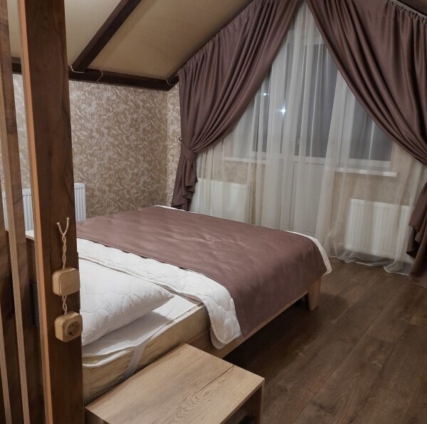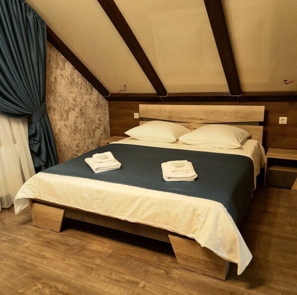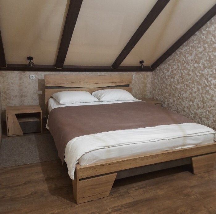 - Большая двуспальная кровать с ортопедическим матрасом и качественным постельным бельем;