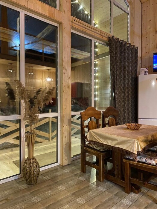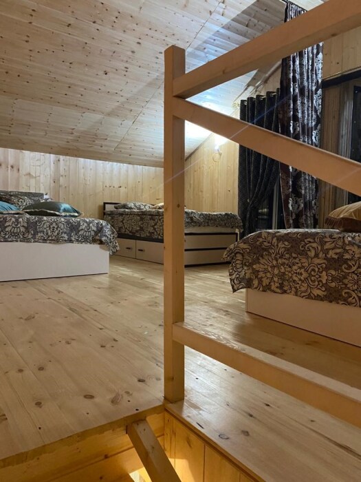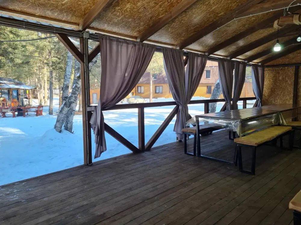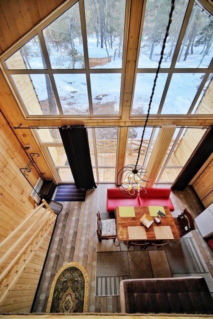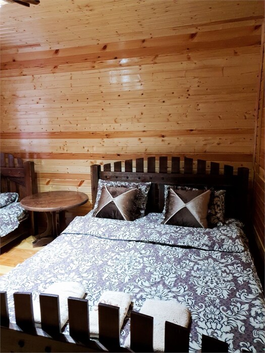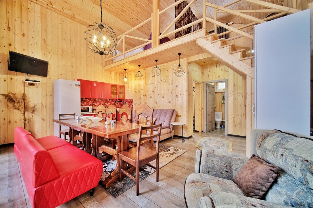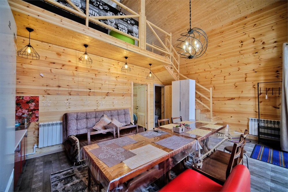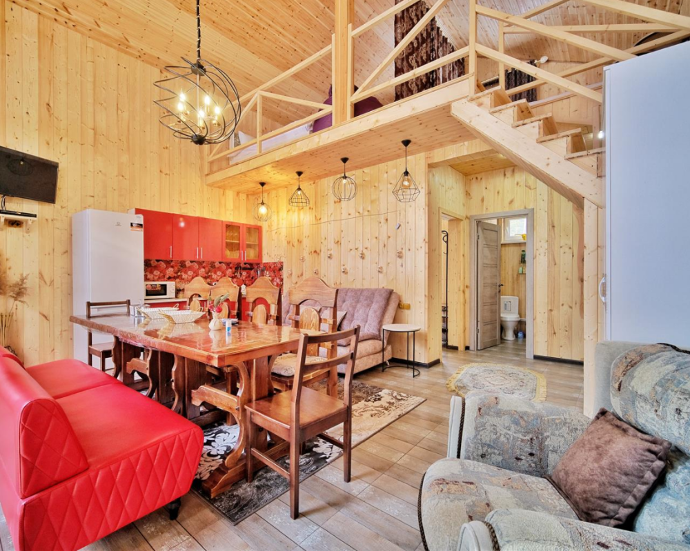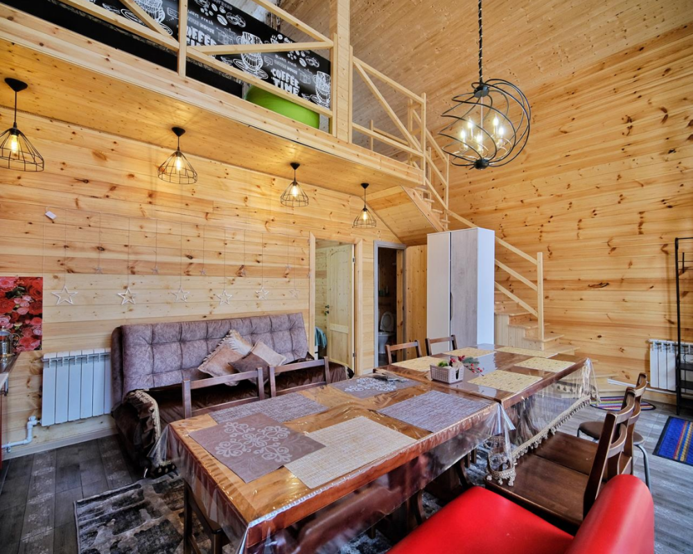 База отдыха состоит из вилл, шале и номеров 2 типов. Виллы Барнхаус вмещают от 7 до 11 человек. Мини-кухня включает электрический чайник, микроволновую печь, варочную панель, набор посуды и холодильник. Перед каждым домиком терраса и свой мангал. Это 3 новых двухэтажных коттеджа, полностью из натуральных и безопасных для здоровья и окружающей среды хвойных пород дерева, что обеспечивает отличный микроклимат. Дома отличаются стильным декором с минимальным количеством стен, благодаря чему воздух в доме свободно циркулирует, оборудованы всем необходимым для комфортного проживания. Завораживает необыкновенный панорамный вид из окна на горы и хвойный лес. Эко-виллы с террасой, оборудованы спальнями, залом и ванной комнатой.