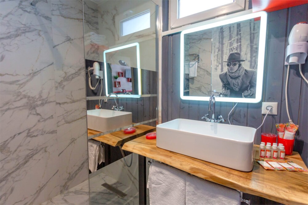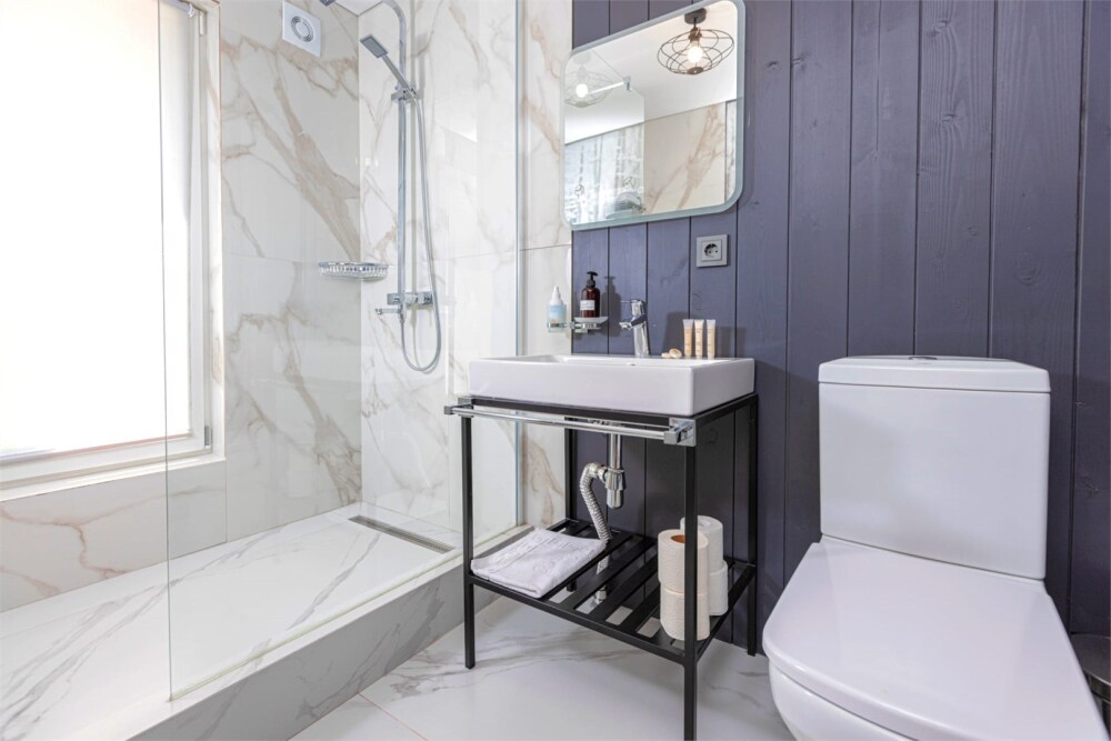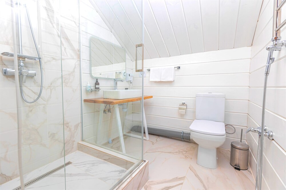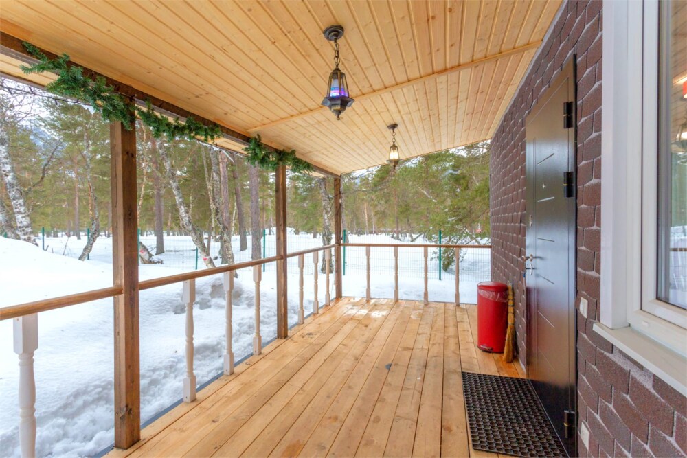Двухэтажный дом с террасой общей площадью 112 м2. На первом этаже расположена просторная кухня-гостиная с камином, диваном и обеденной зоной и светлый, совмещенный санузел. На втором этаже расположены две изолированные спальни с кроватями размера King size и дополнительным местом, а также дополнительный санузел.