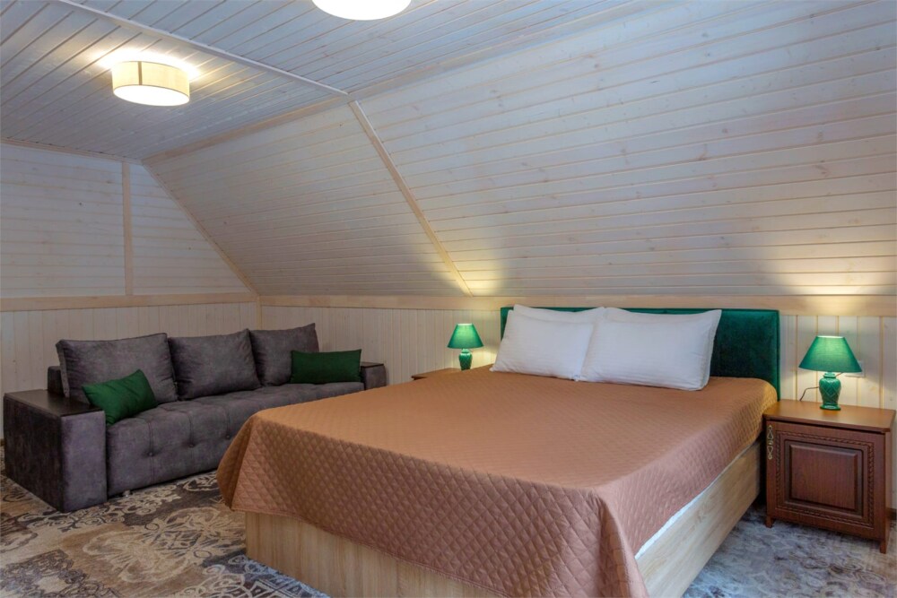 Двухэтажный дом с террасой общей площадью 90 м2. На первом этаже расположена кухня с обеденной зоной, изолированная спальня с двуспальной кроватью и дополнительным местом, а также совмещенный санузел. Весь второй этаж занимает просторная спальня с двуспальной кроватью и раскладывающимся диваном. Возможно размещение животных по согласованию и за дополнительную плату.