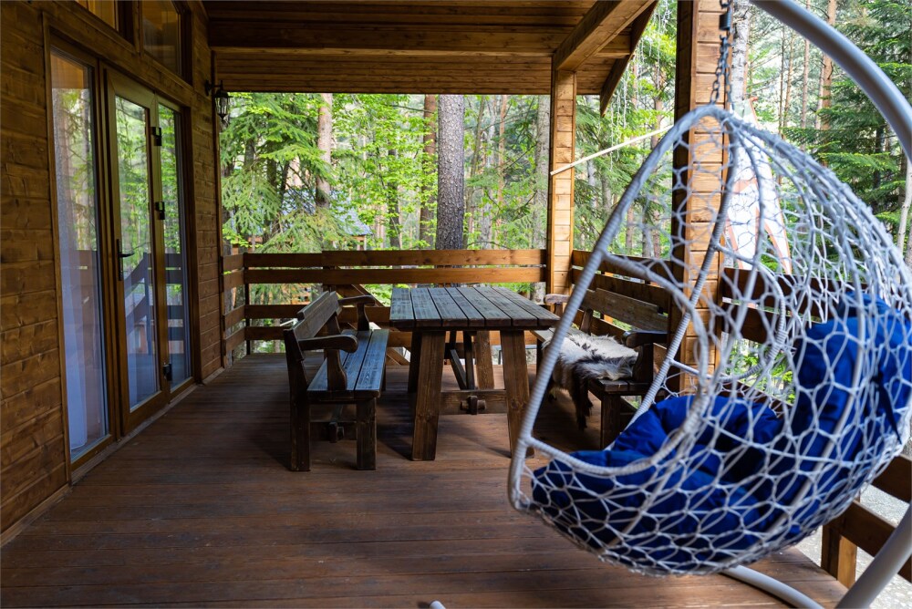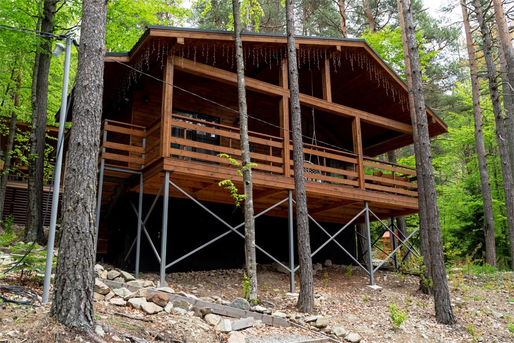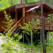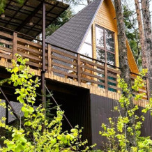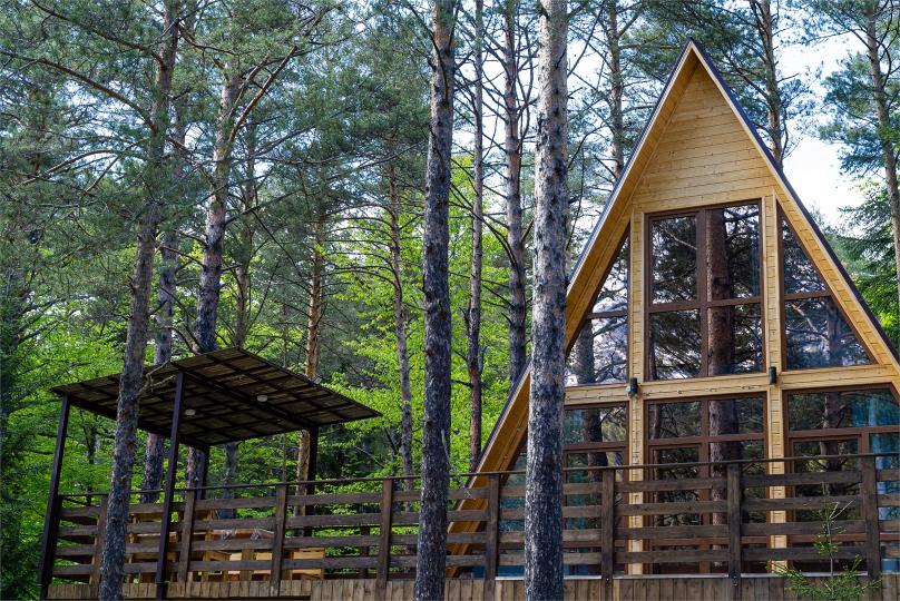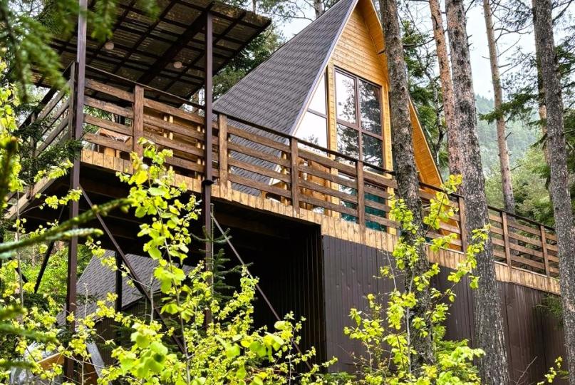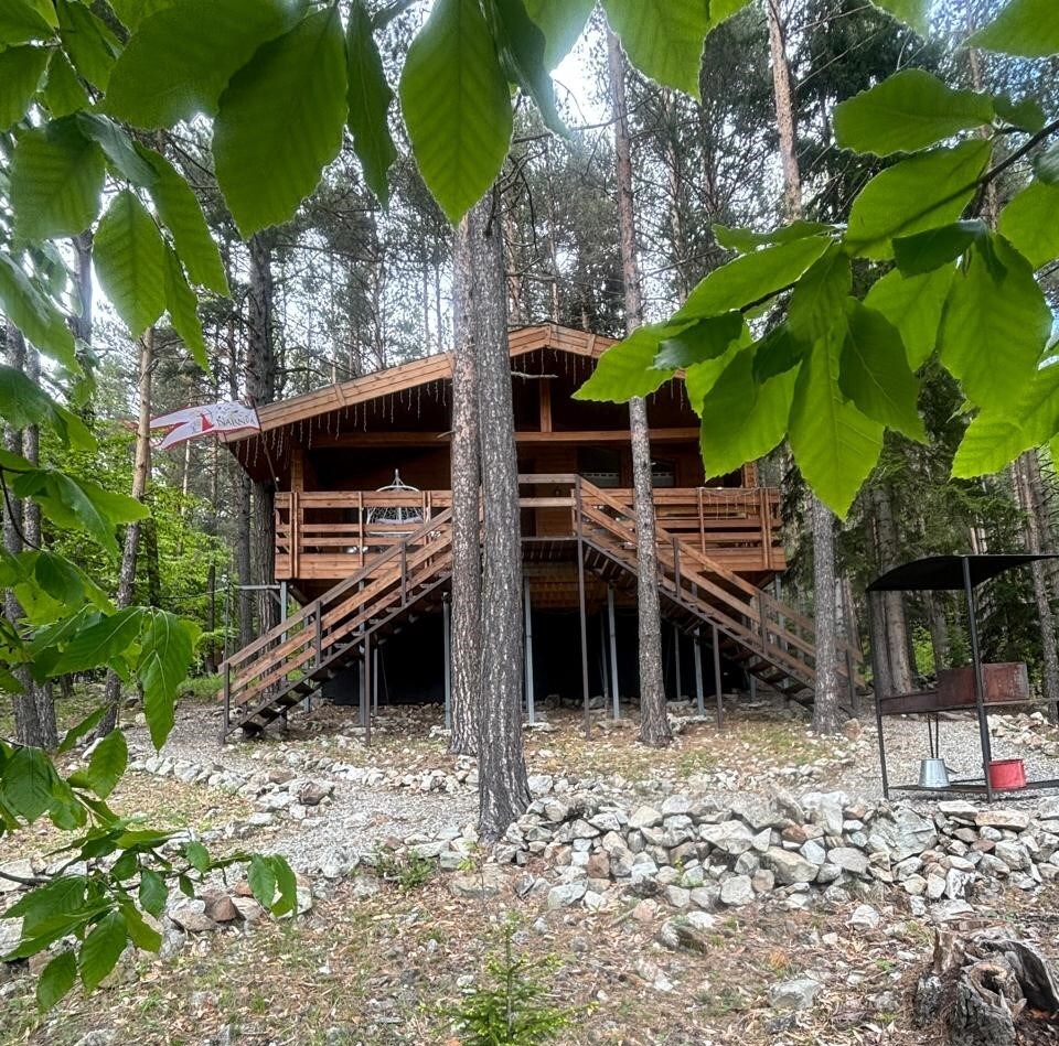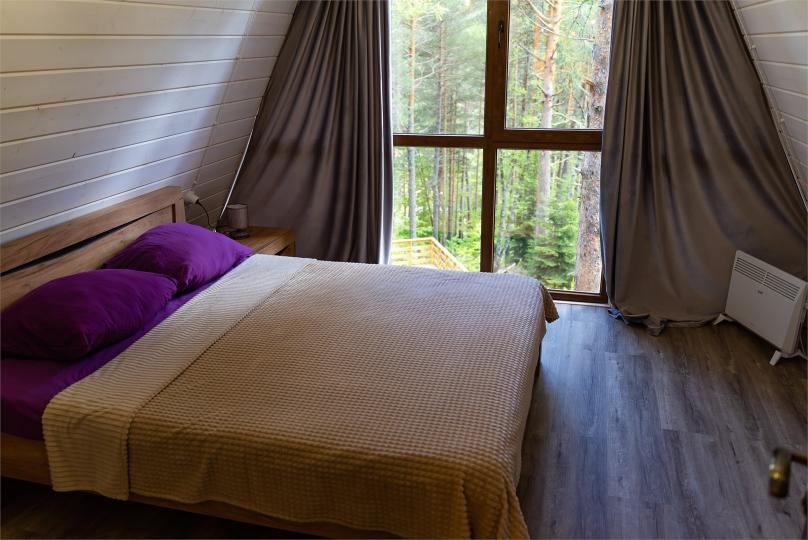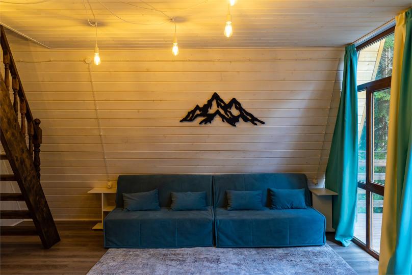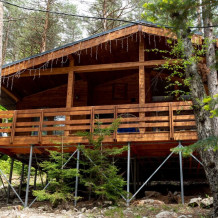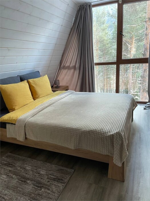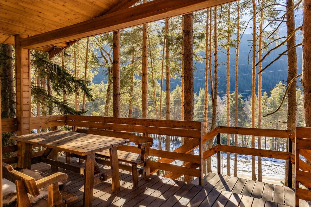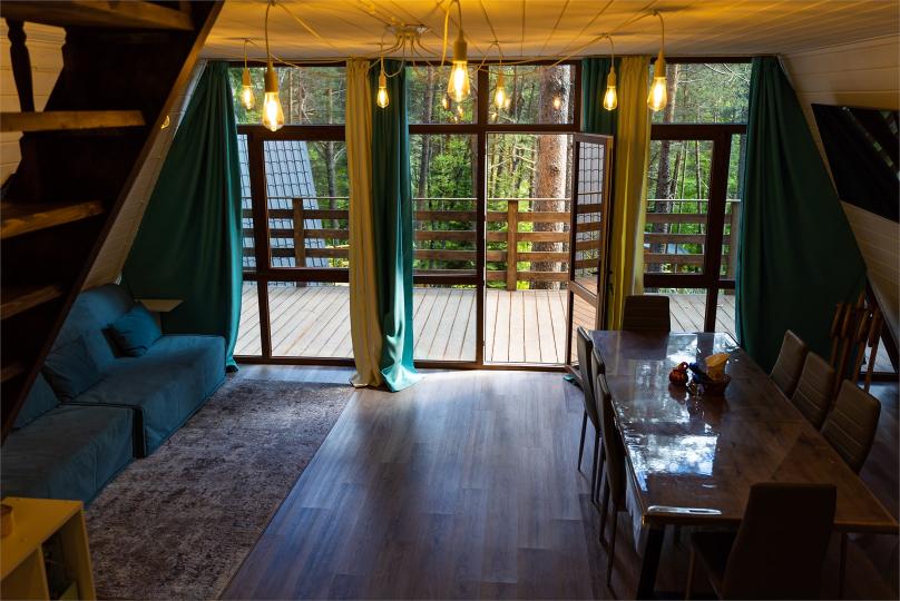 Просторный дом-шалаш с 2-я спальнями на 2 этаже и просторной гостиной на первом площадью 70 м2. В доме: обогреватель, теплый пол, тапочки. С большой террасы открываются невероятные по красоте виды на горы и лес. А удаленность от остальных шале позволит погрузиться в тишину и красоту окружающей природы.