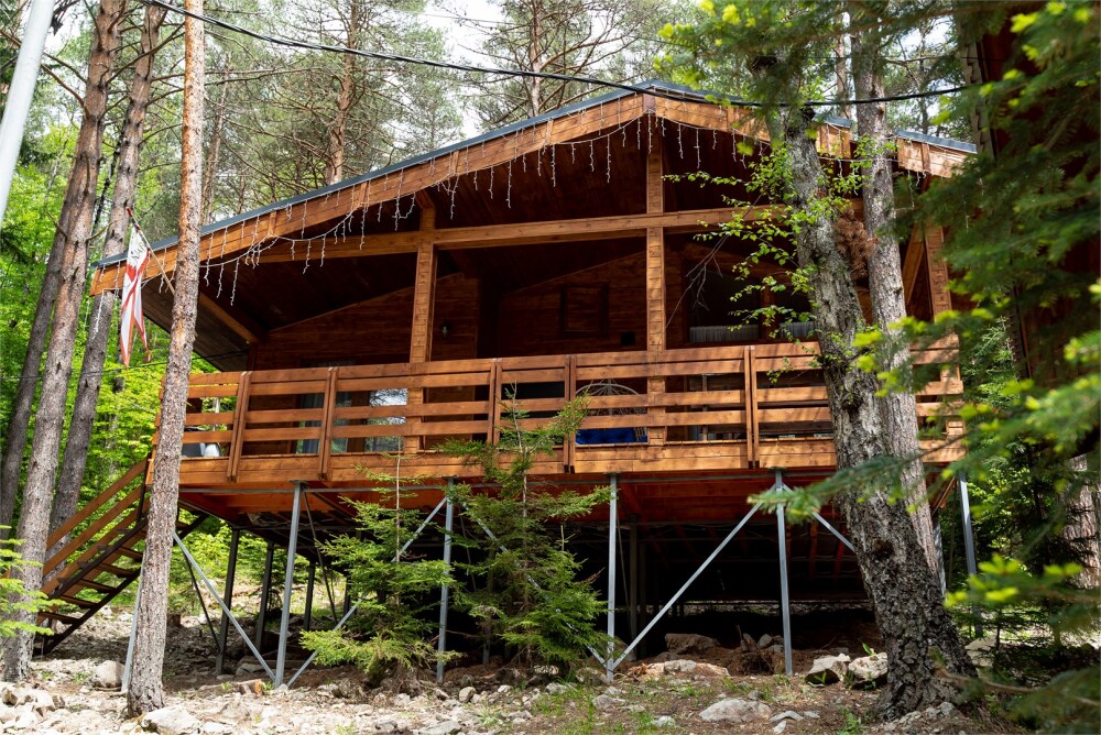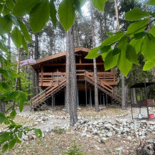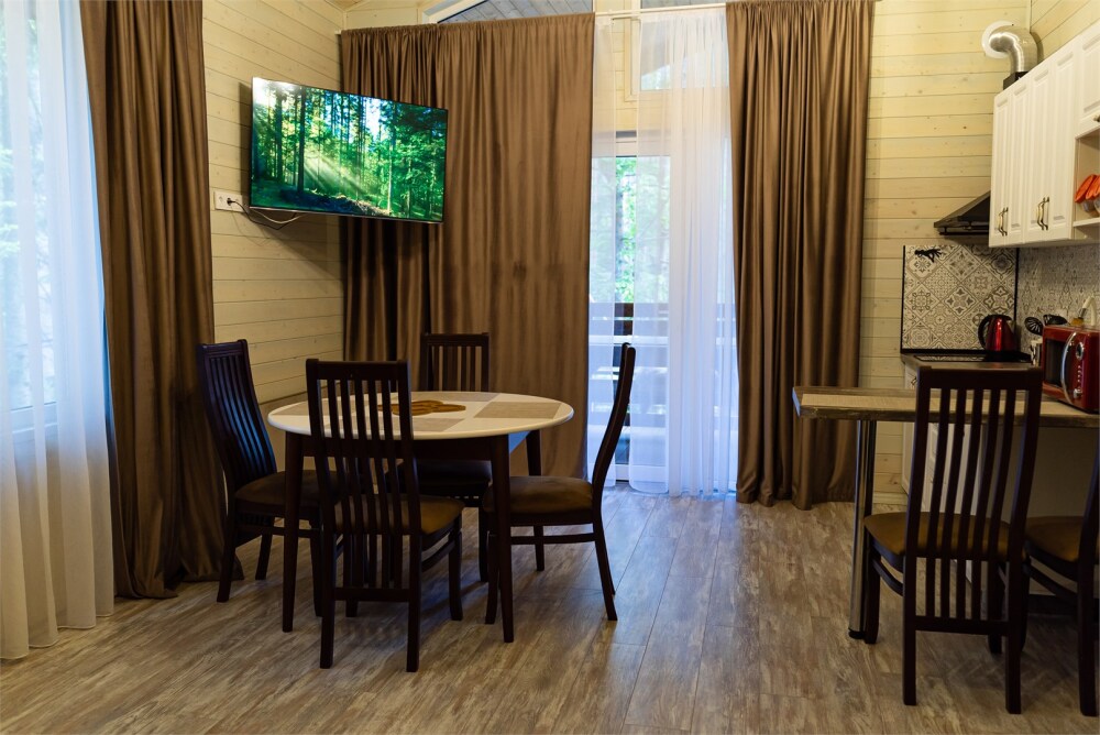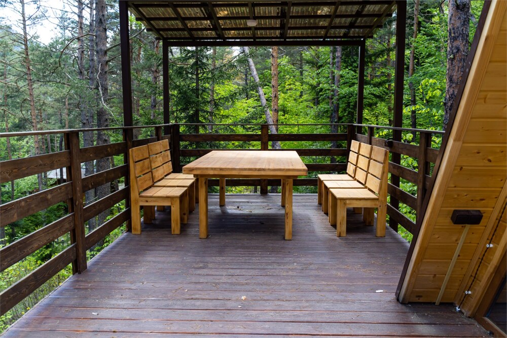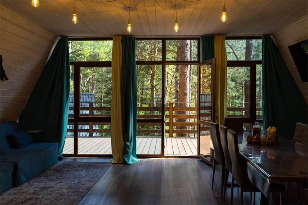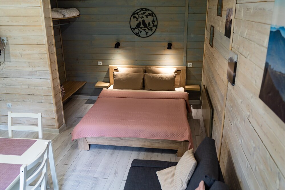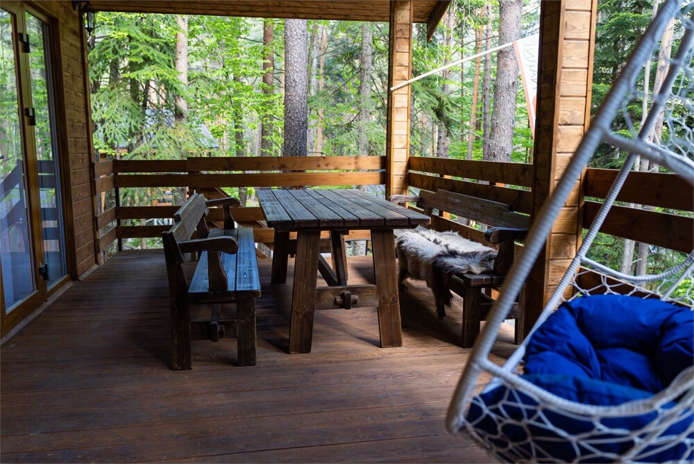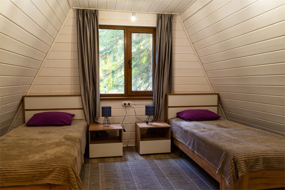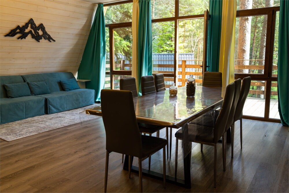 Просторный дом-шалаш с 2-я спальнями на 2 этаже и просторной гостиной на первом площадью 70 м2. В доме: обогреватель, теплый пол, тапочки. С большой террасы открываются невероятные по красоте виды на горы и лес. А удаленность от остальных шале позволит погрузиться в тишину и красоту окружающей природы.