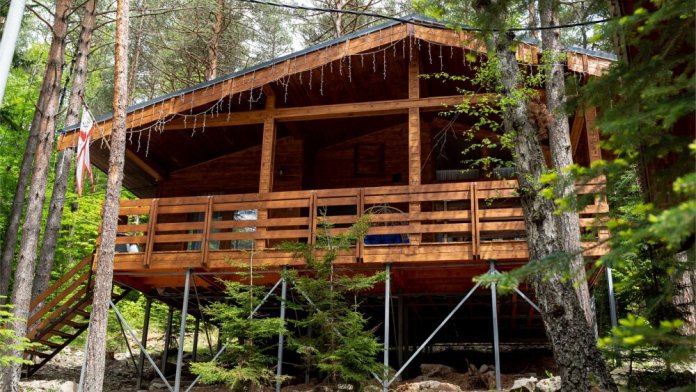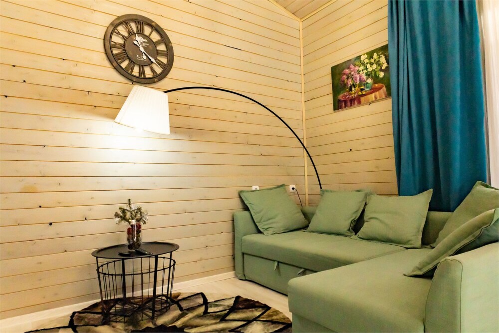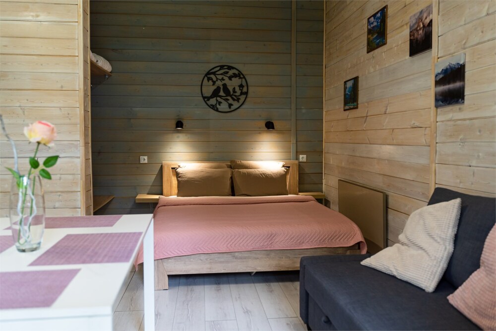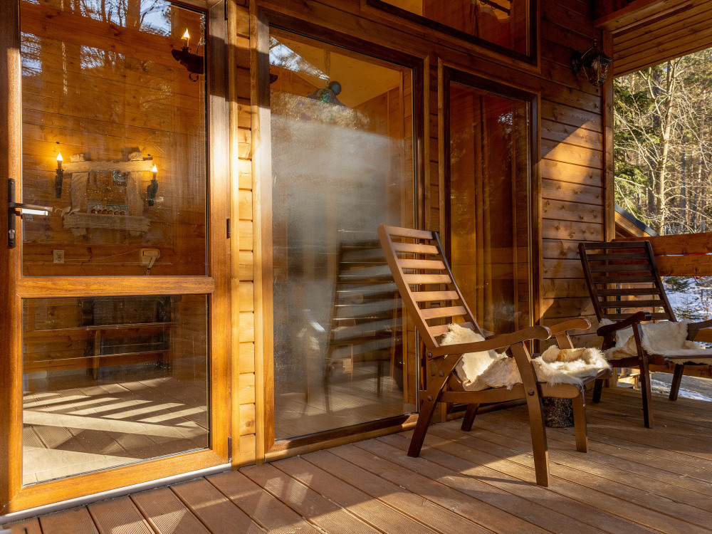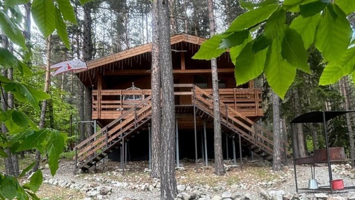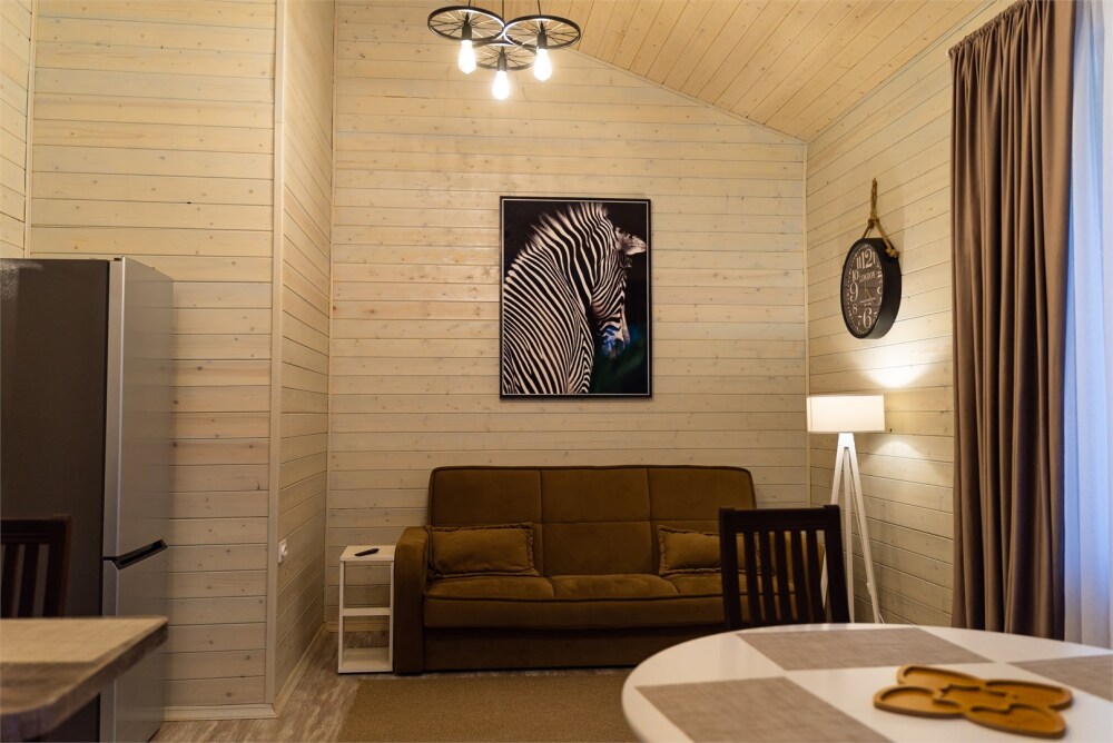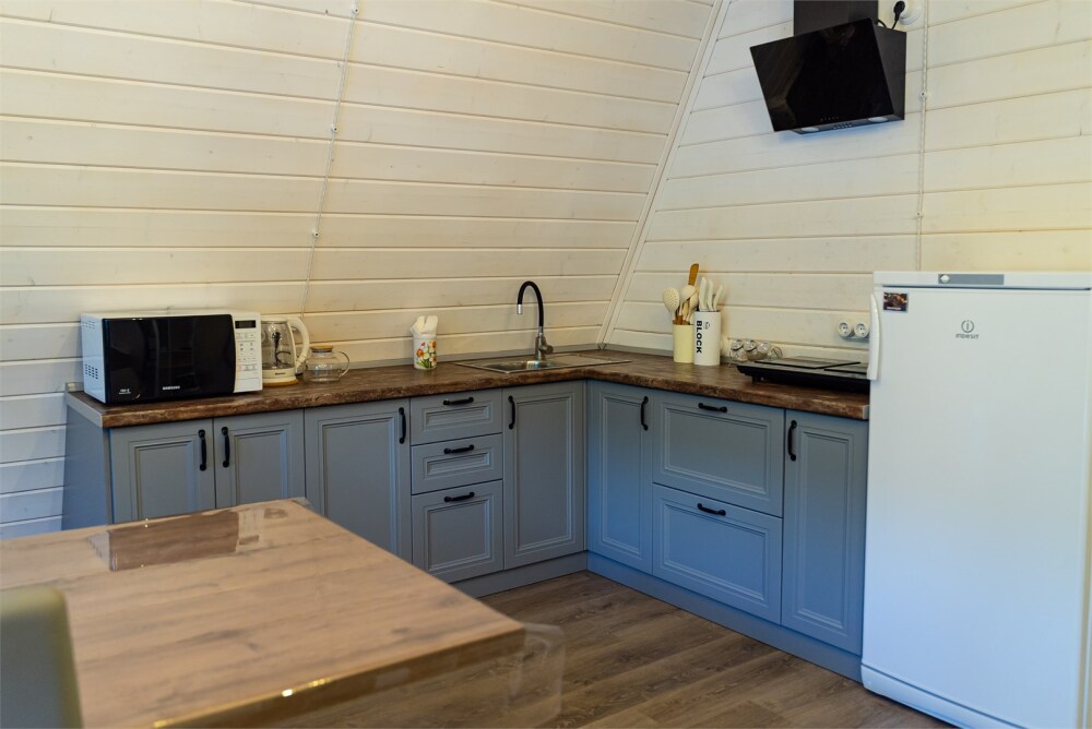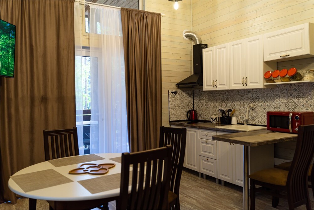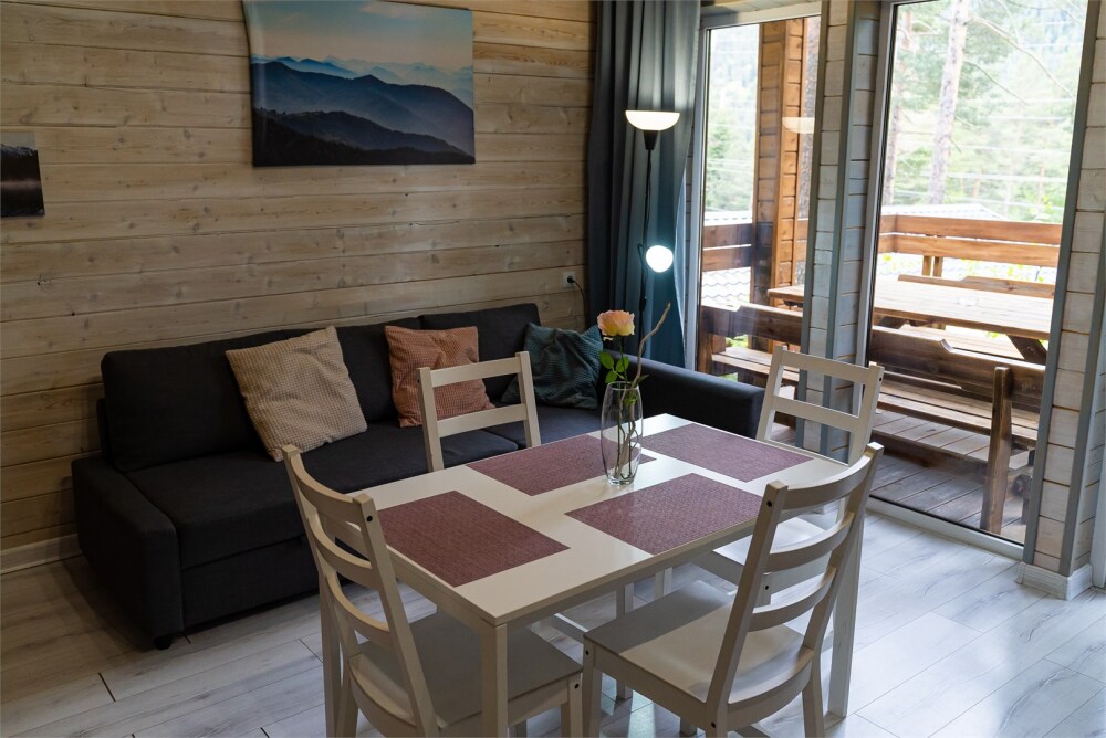 Просторный дом-шалаш с 2-я спальнями на 2 этаже и просторной гостиной на первом площадью 70 м2. В доме: обогреватель, теплый пол, тапочки. С большой террасы открываются невероятные по красоте виды на горы и лес. А удаленность от остальных шале позволит погрузиться в тишину и красоту окружающей природы.
