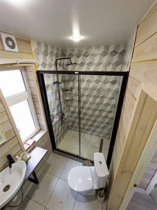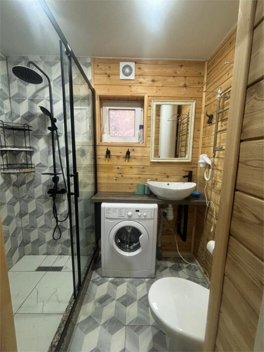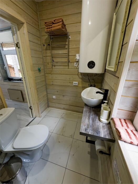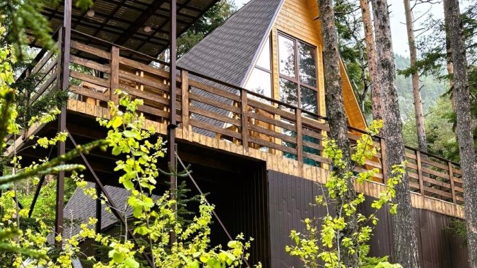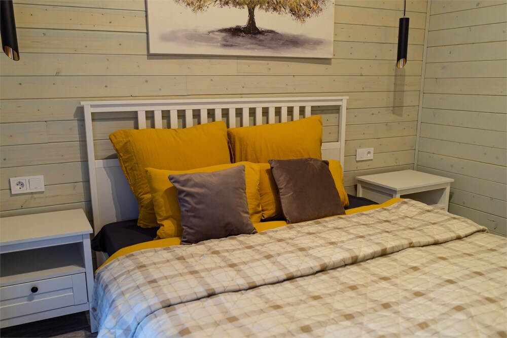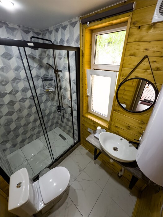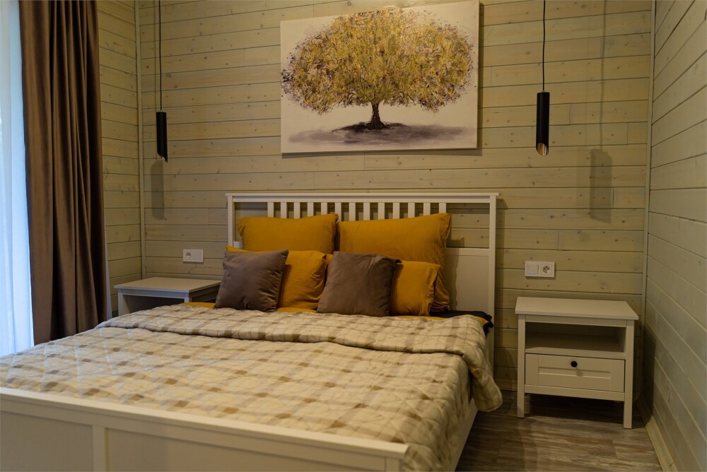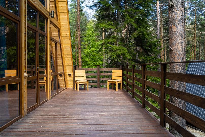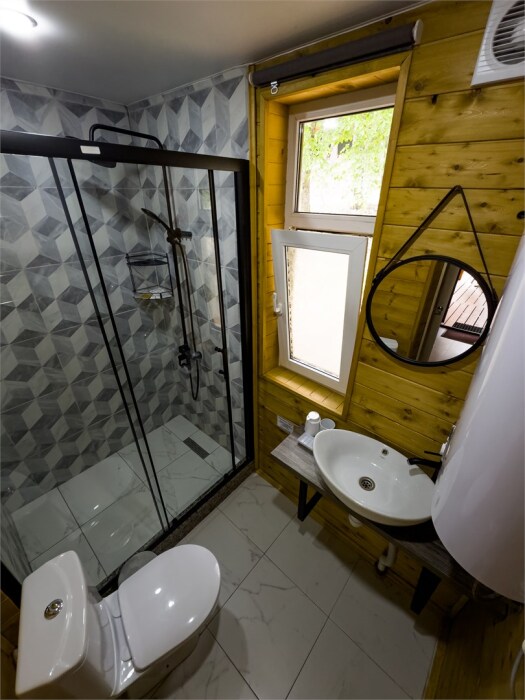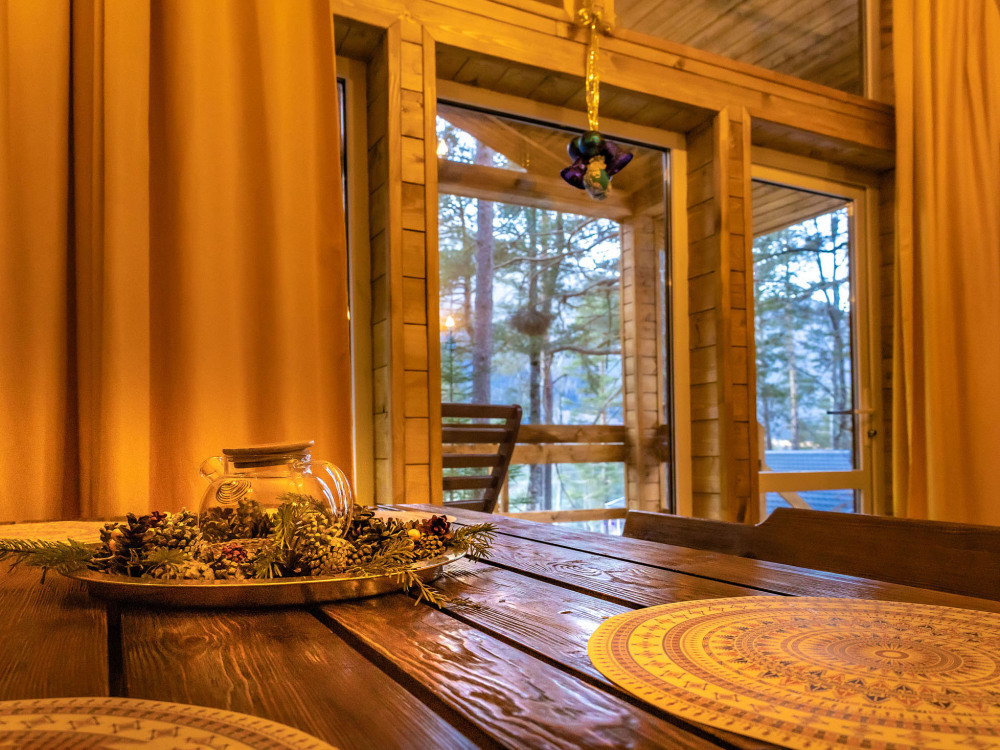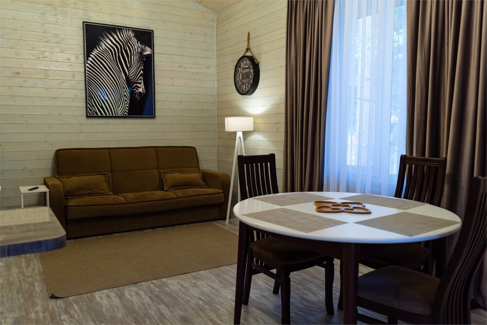 Просторный дом-шалаш с 2-я спальнями на 2 этаже и просторной гостиной на первом площадью 70 м2. В доме: обогреватель, теплый пол, тапочки. С большой террасы открываются невероятные по красоте виды на горы и лес. А удаленность от остальных шале позволит погрузиться в тишину и красоту окружающей природы.
