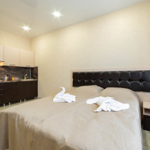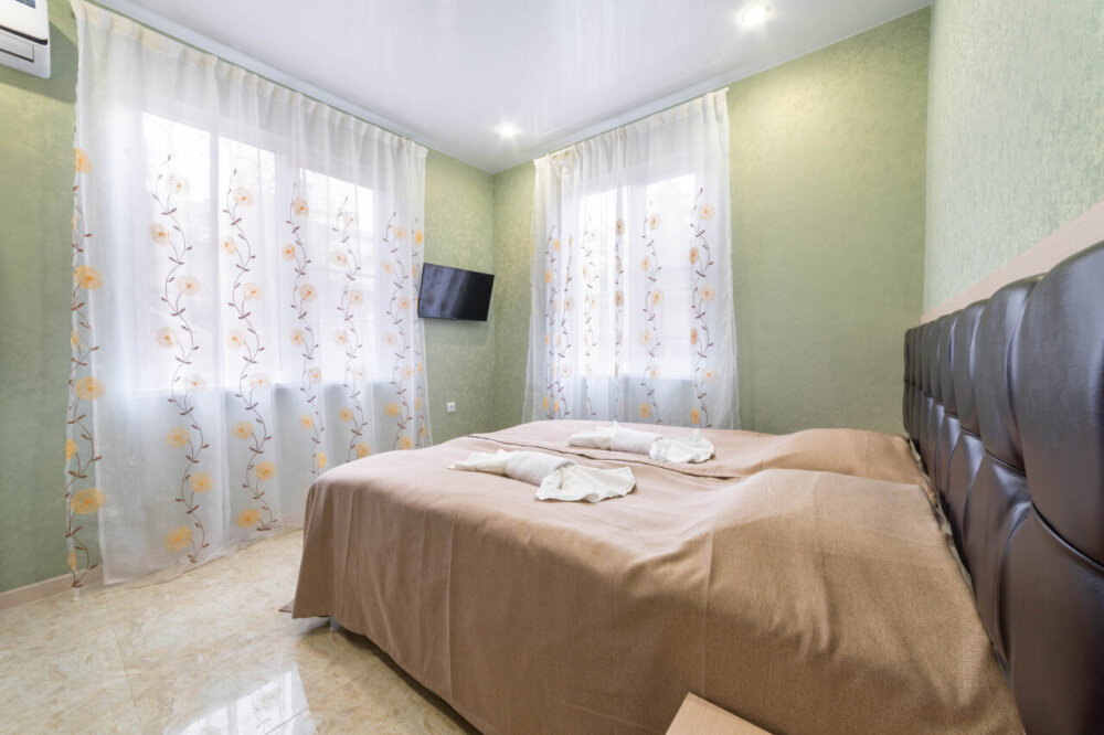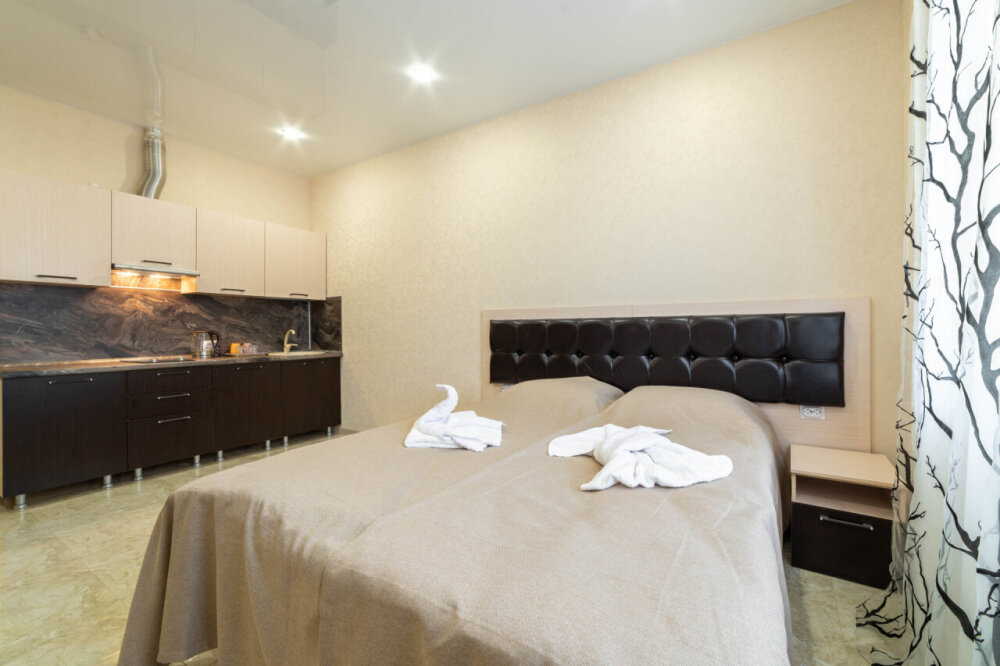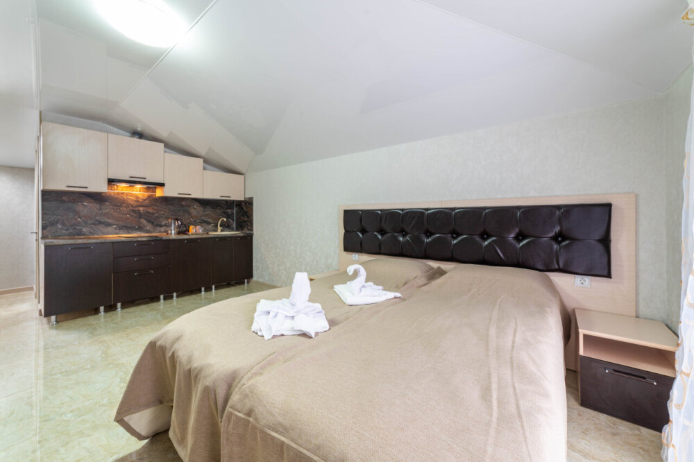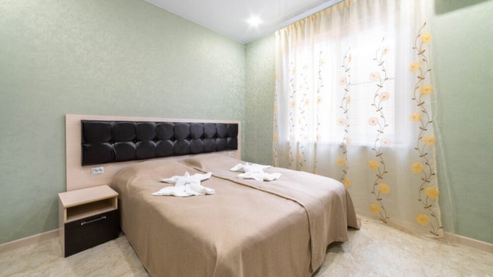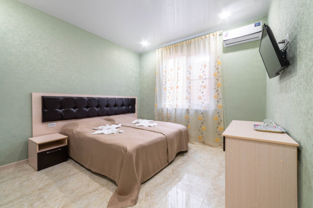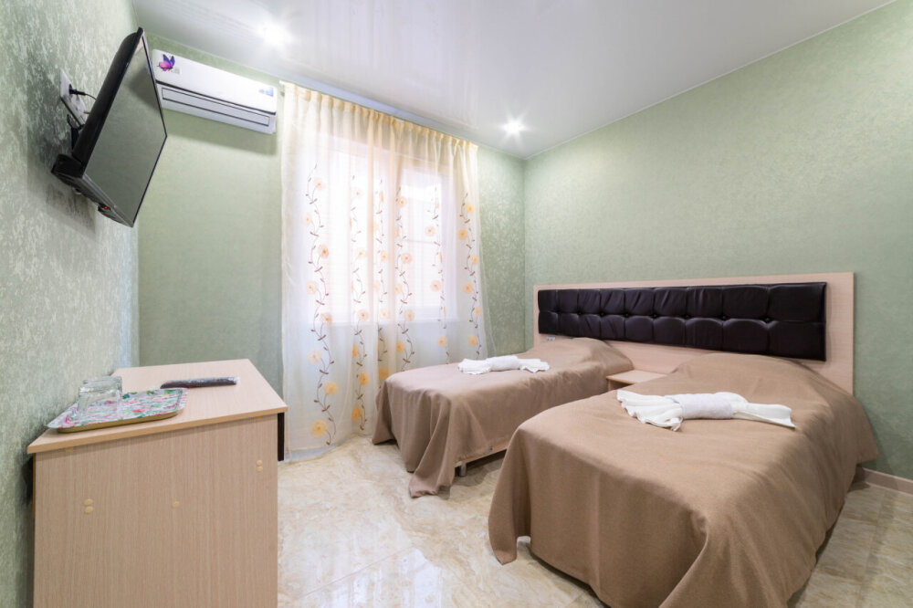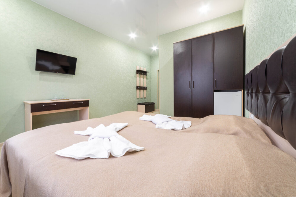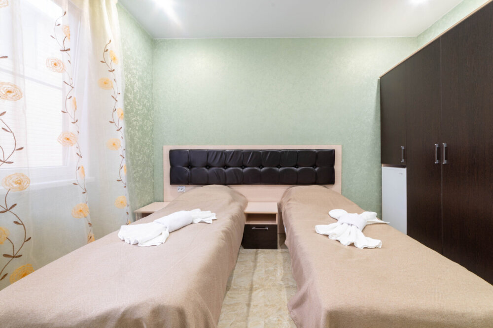 В номере 1 двуспальная или 2 односпальные кровати. Дополнительное место - раскладная кровать.