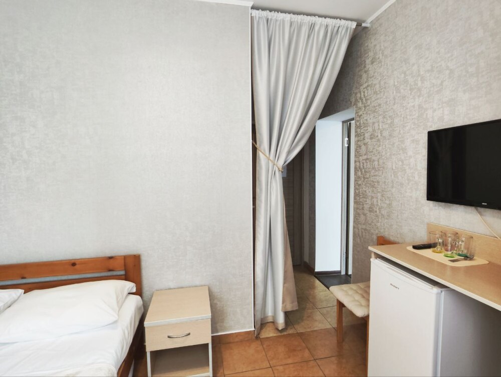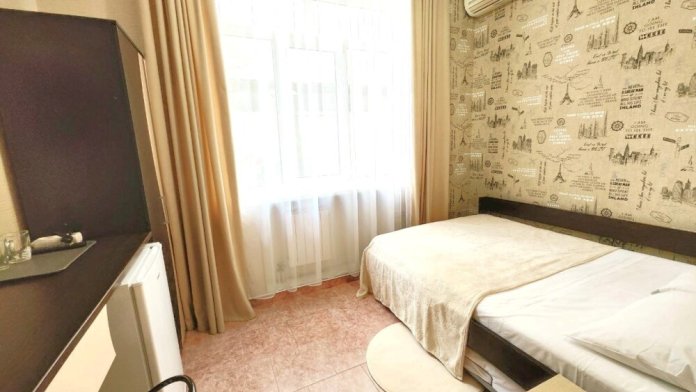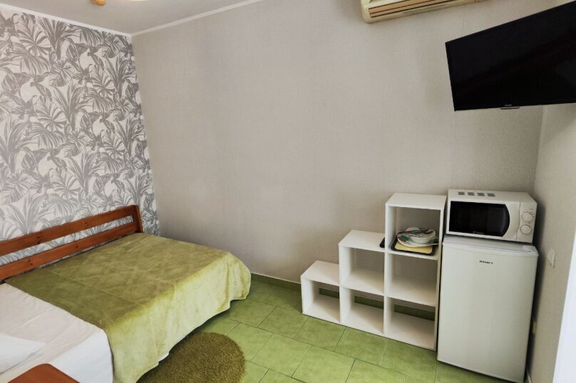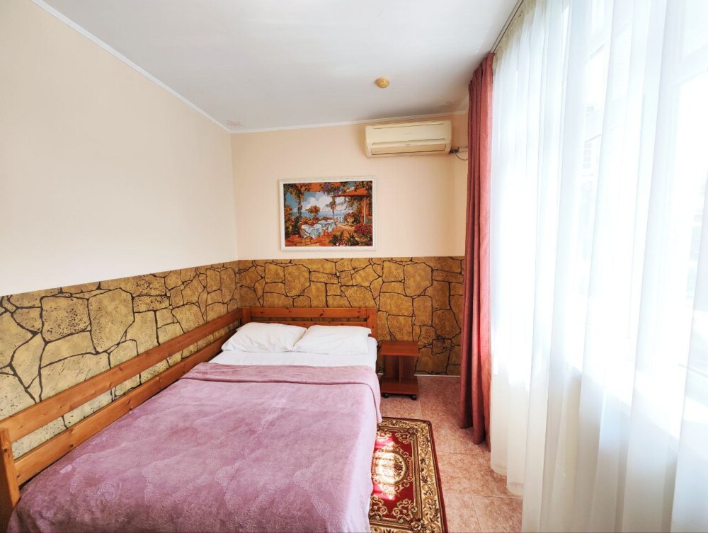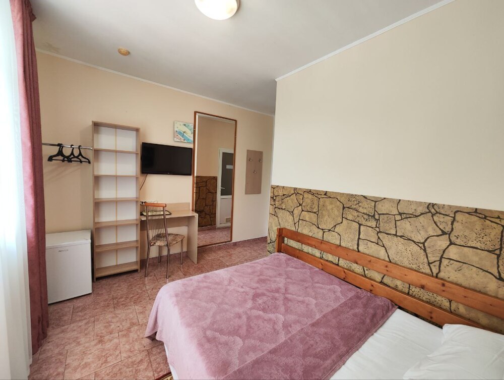Двуспальная кровать 1.40, выдвижное дополнительное спальное место 0.80, телевизор, холодильник, кондиционер, индивидуальный санузел.