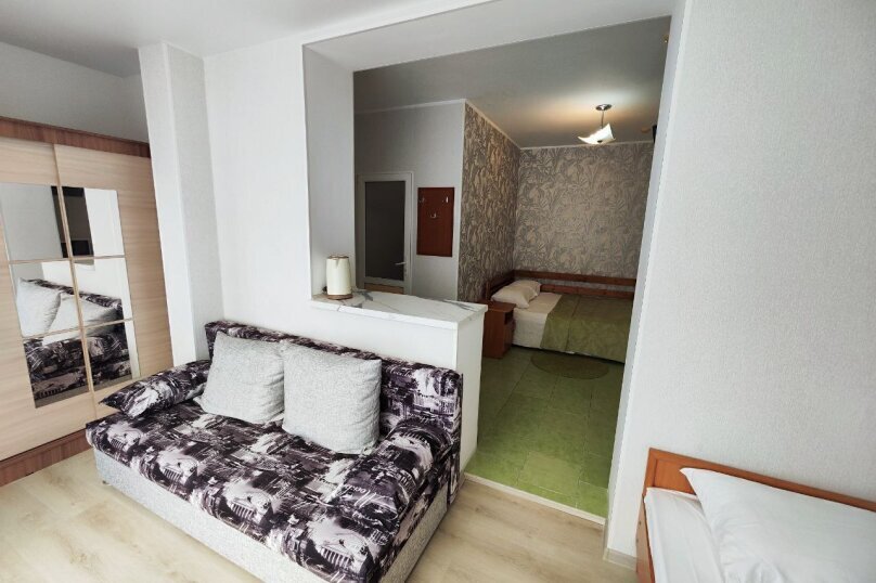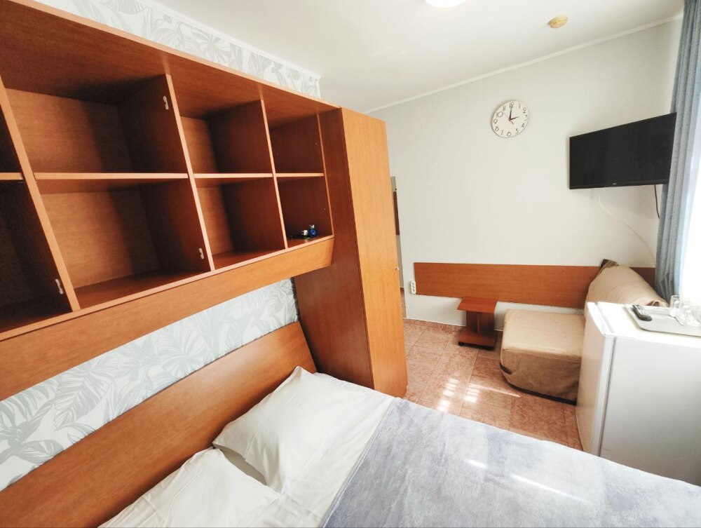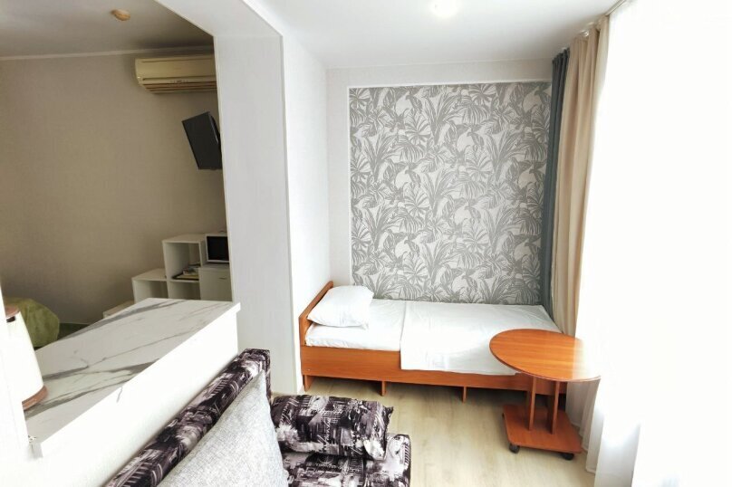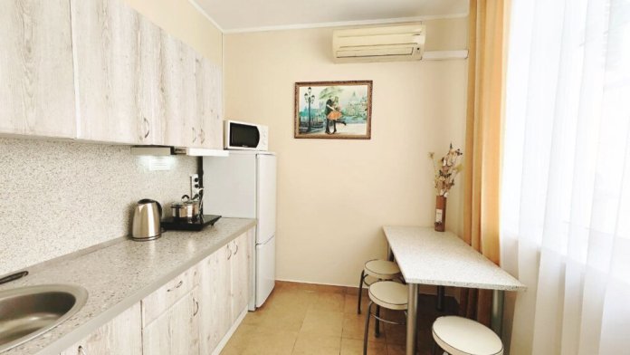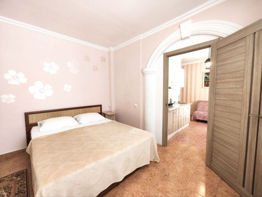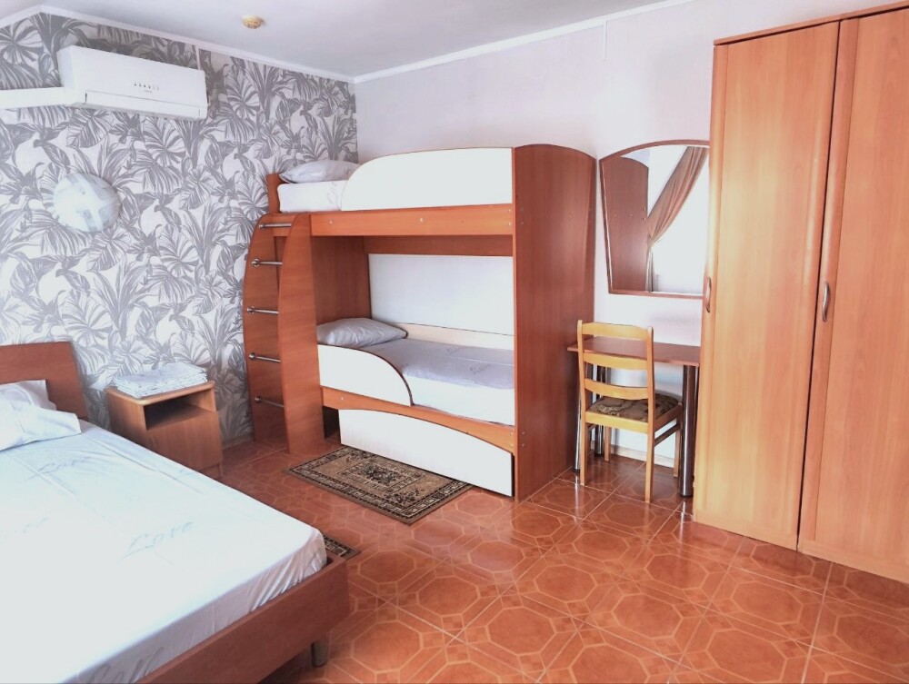 Двуспальная кровать 1.40, выдвижное дополнительное спальное место 0.80, телевизор, холодильник, кондиционер, индивидуальный санузел.