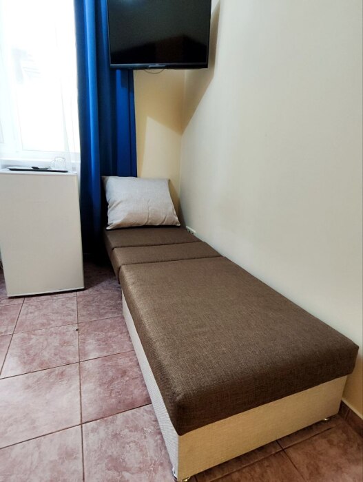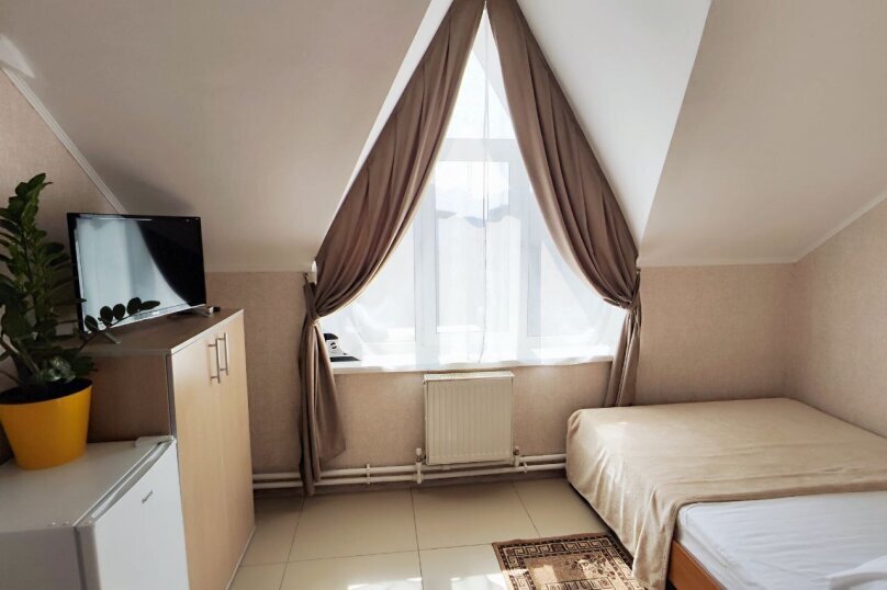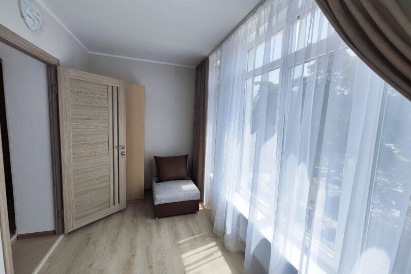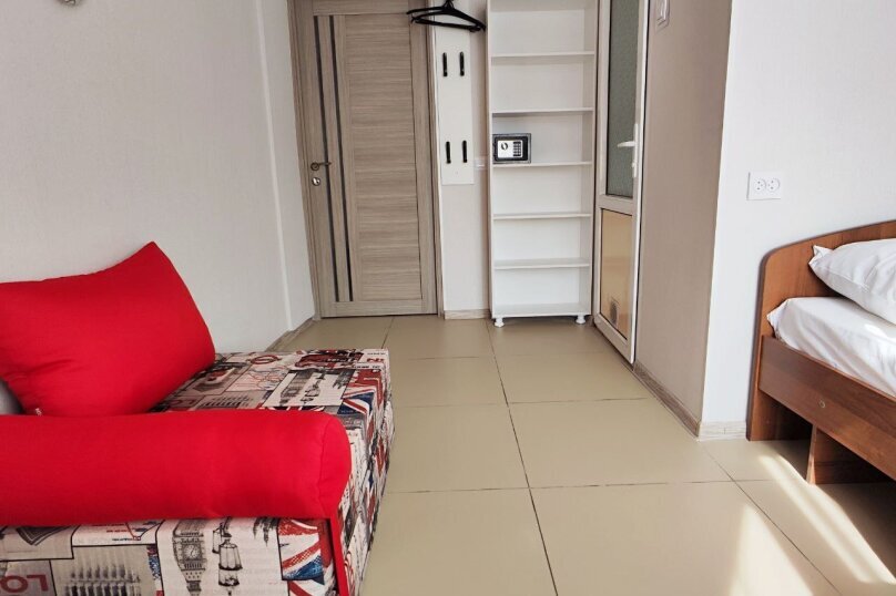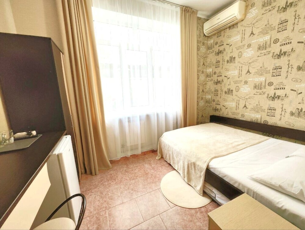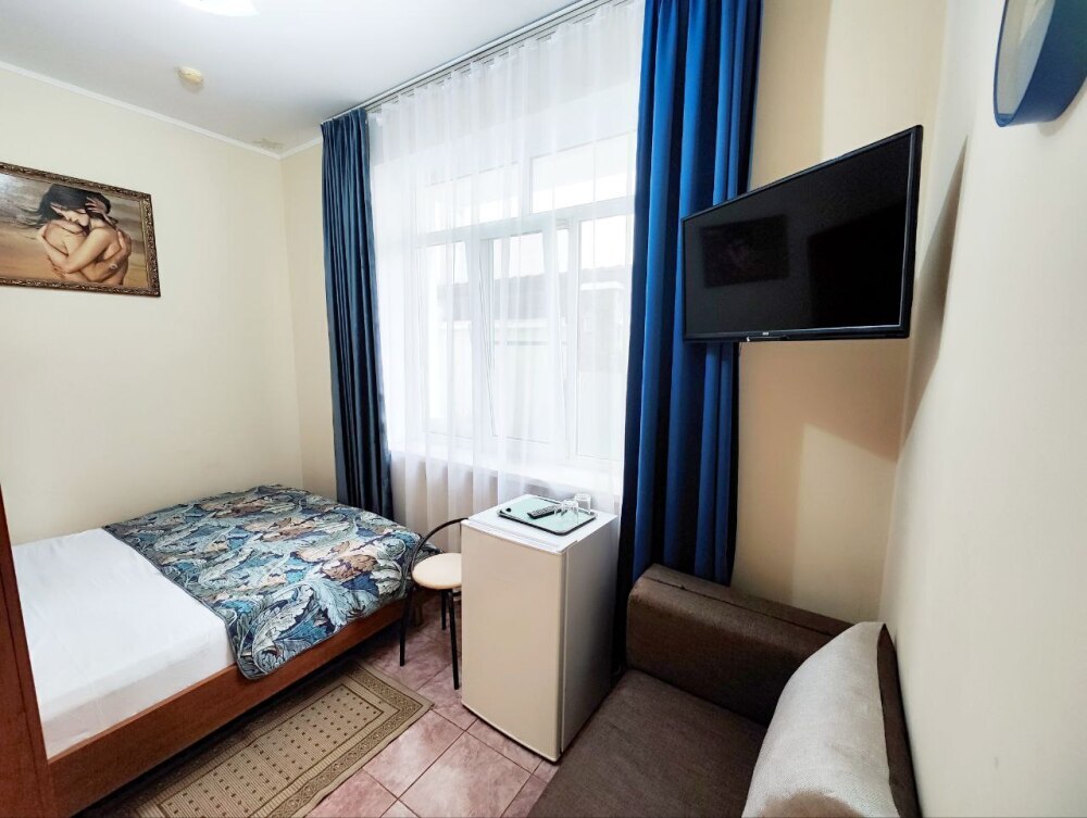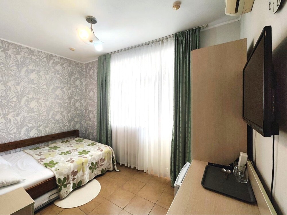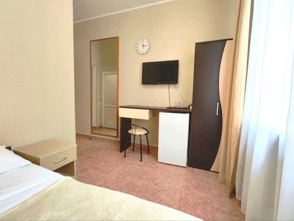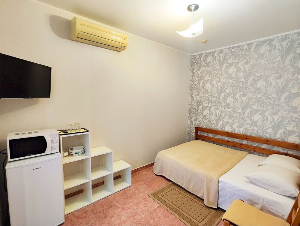 Двуспальная кровать 1.40, бескаркасное кресло как дополнительное спальное место, телевизор, холодильник, кондиционер, индивидуальный санузел, фен, сейф