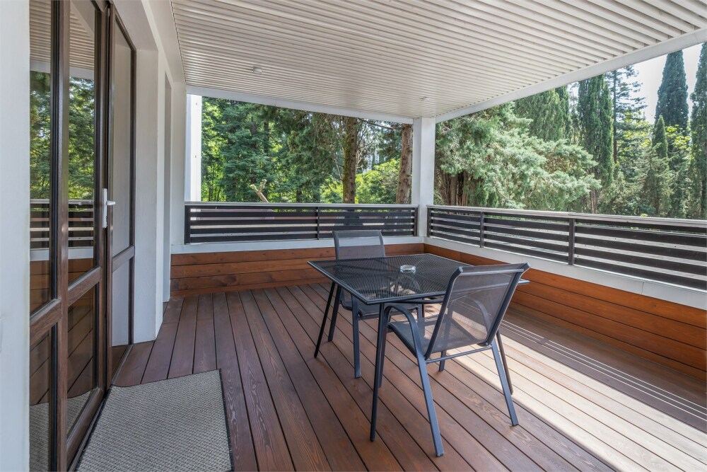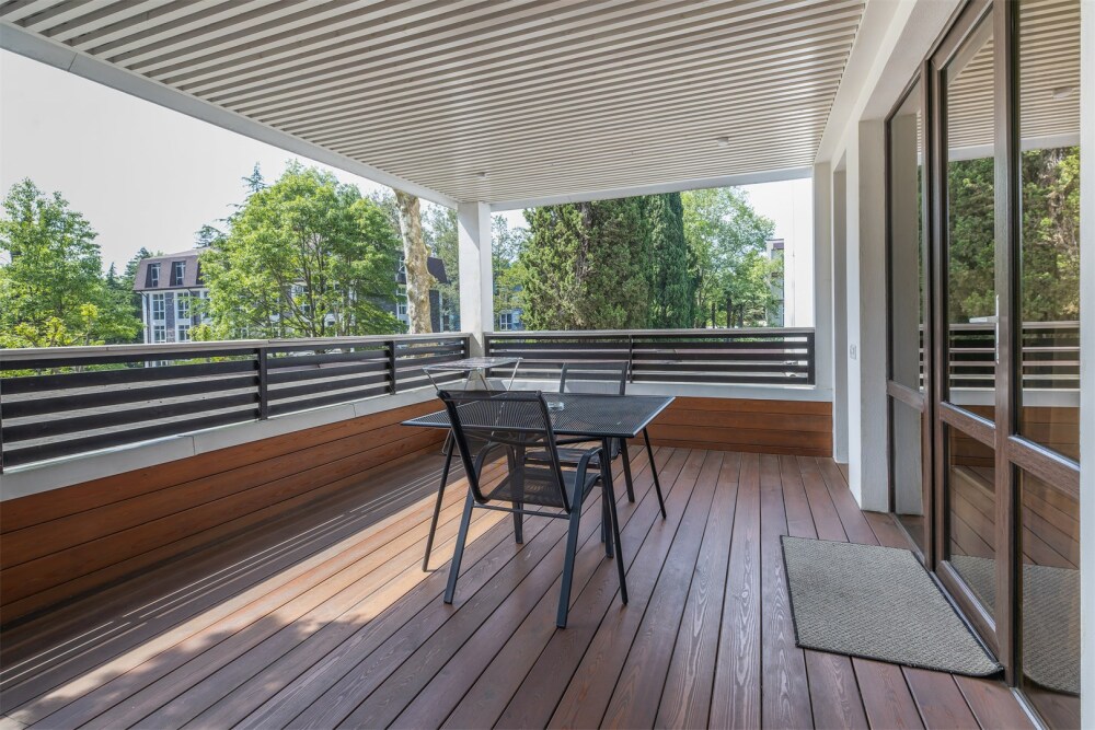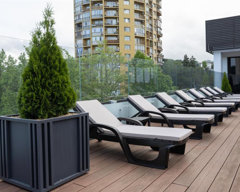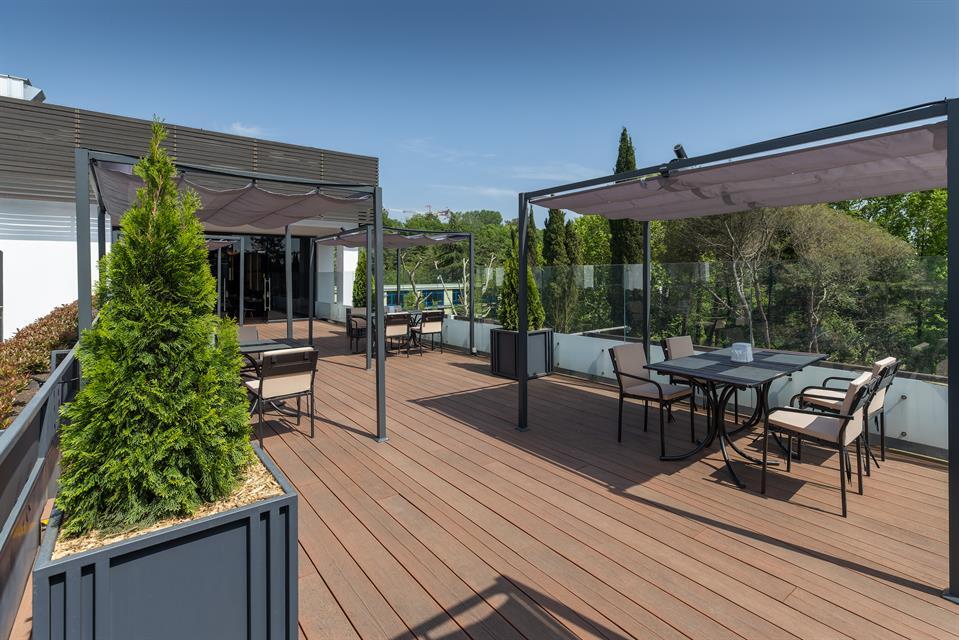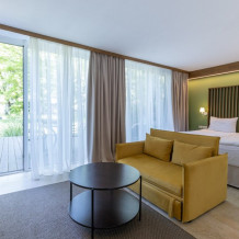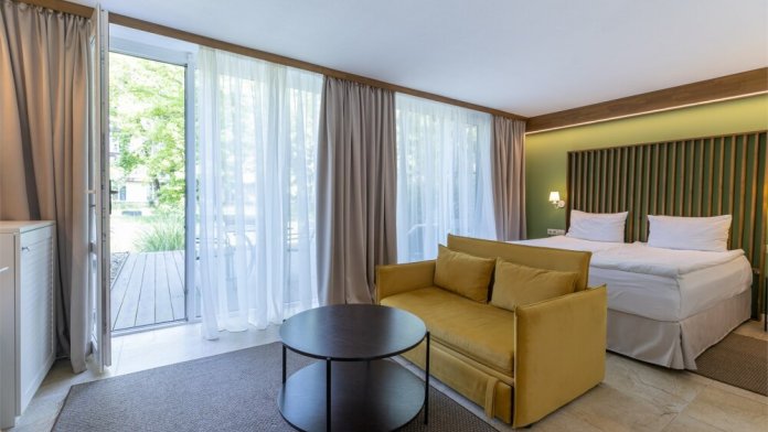 Стильный и современный однокомнатный номер с собственной оборудованной, столом и стульями, террасой 30 кв/м. В номере одна двуспальная или две односпальных кровати, раскладной диван, телевизор, кондиционер, холодильник, рабочий стол, ванная комната с душевой и косметическими средствами, фен, тапочки, халат.