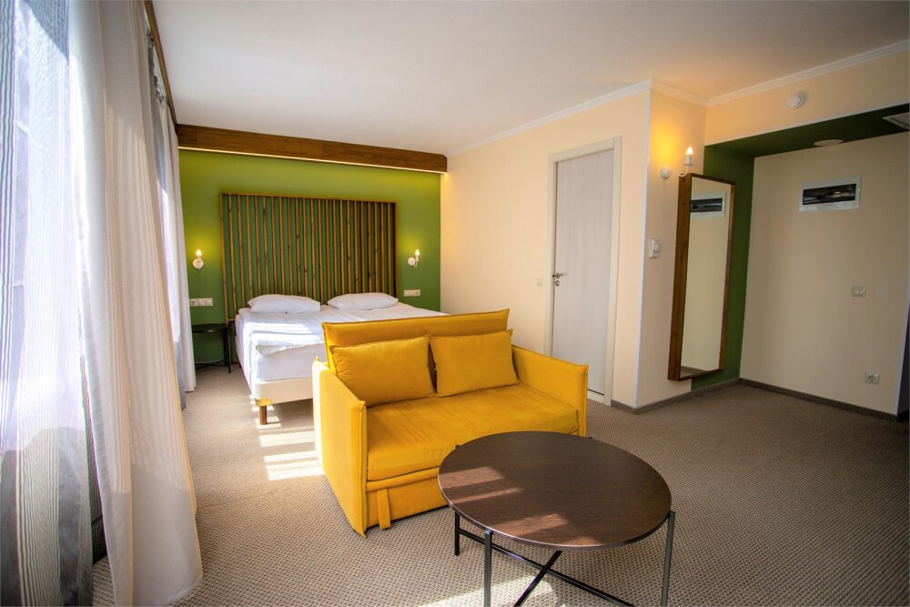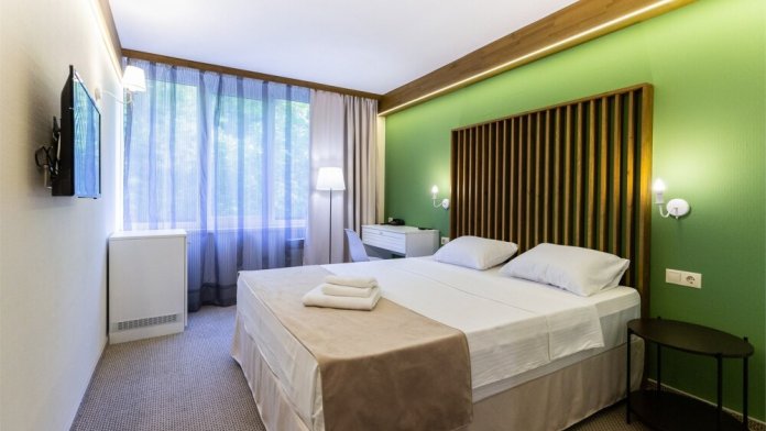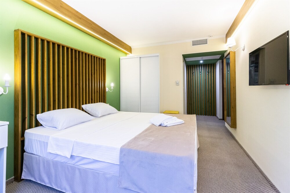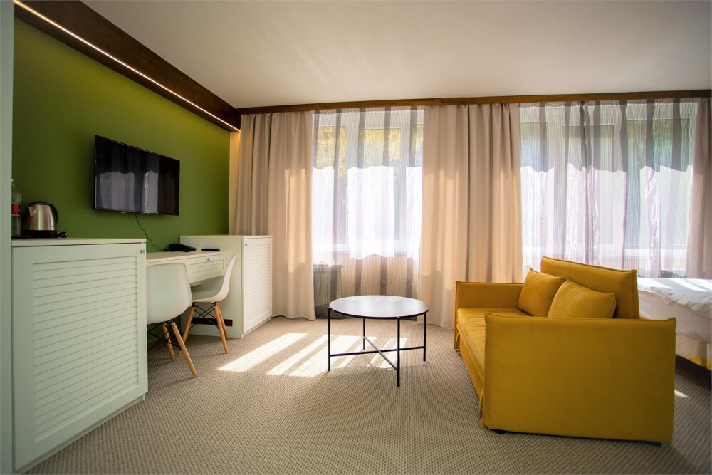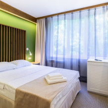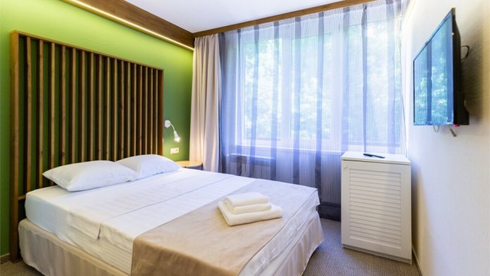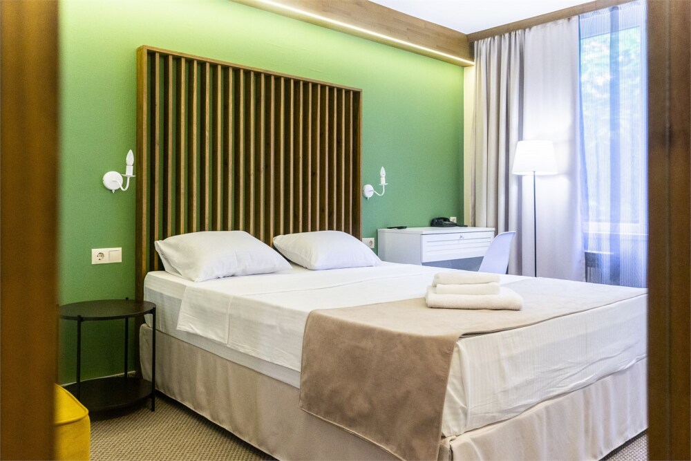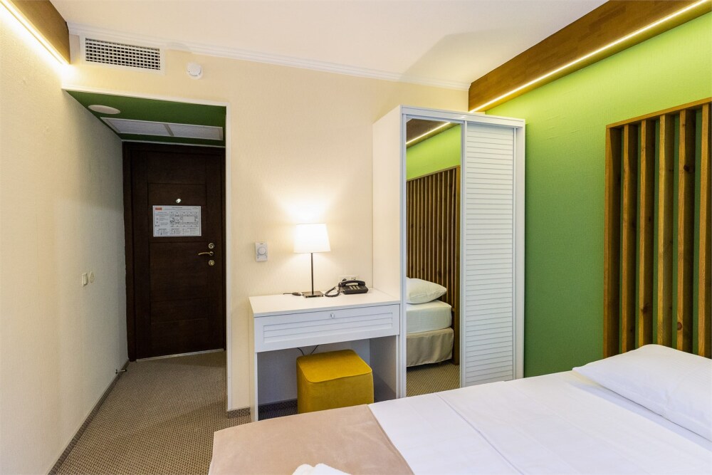 Стильный и современный однокомнатный номер. В номере одна двуспальная или две односпальных кровати, раскладной диван, телевизор, кондиционер, холодильник, рабочий стол, ванная комната с душевой и косметическими средствами, фен, тапочки, халат.