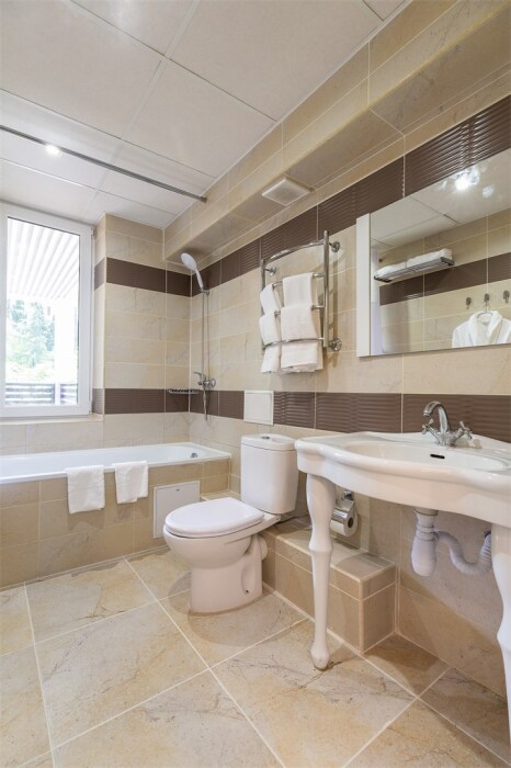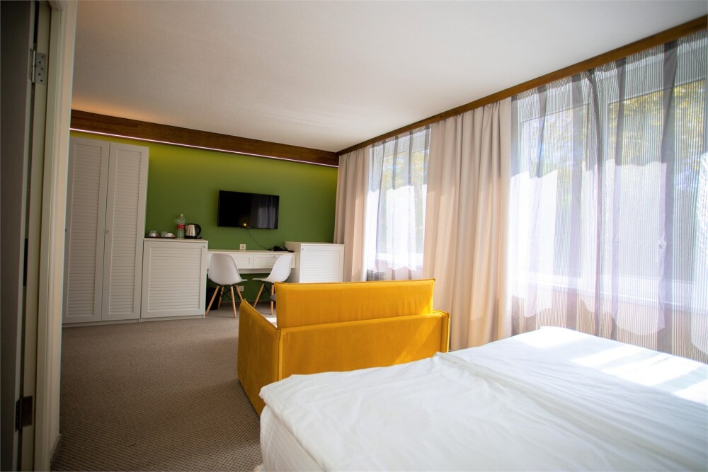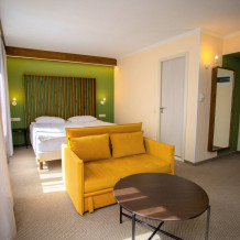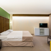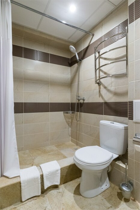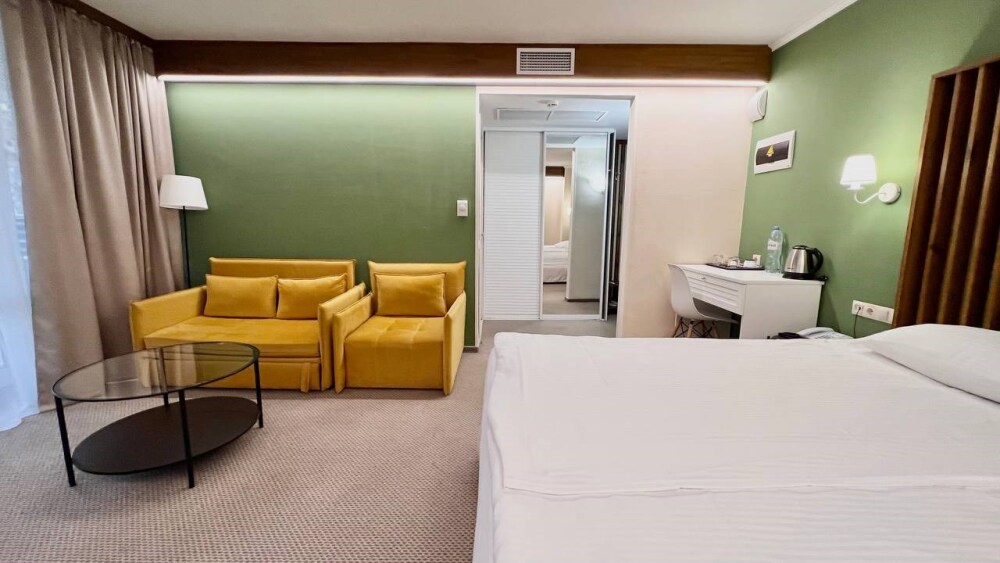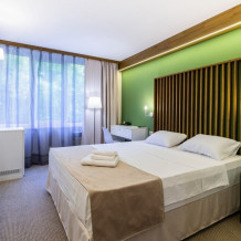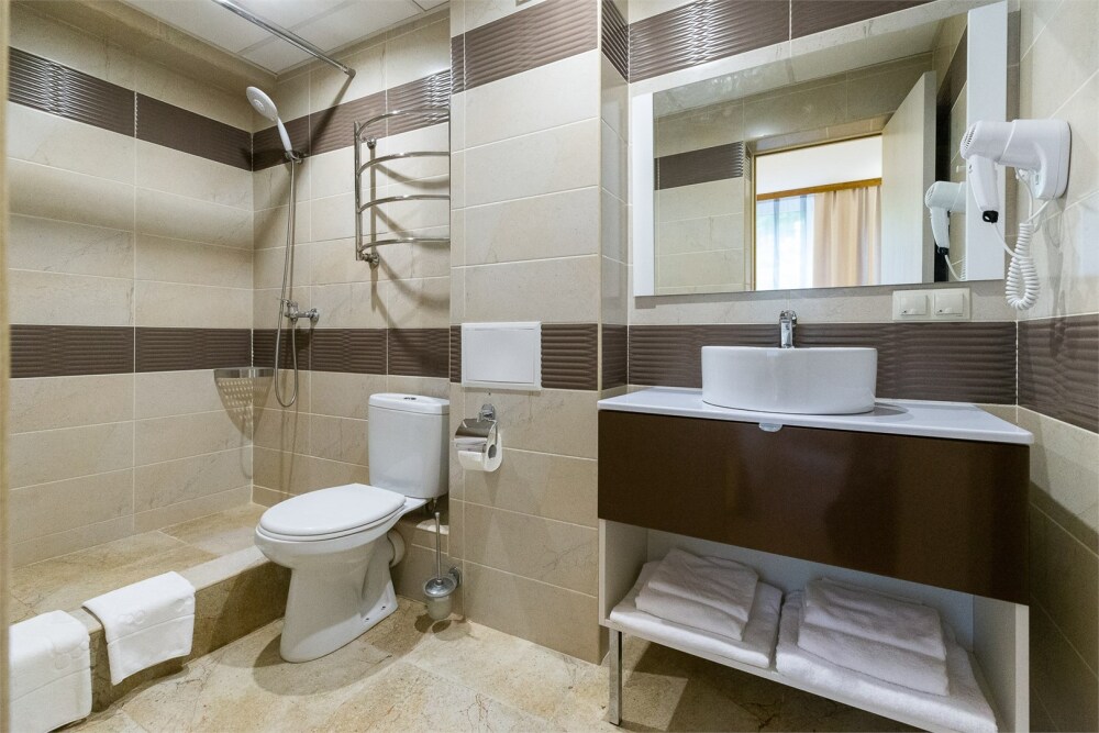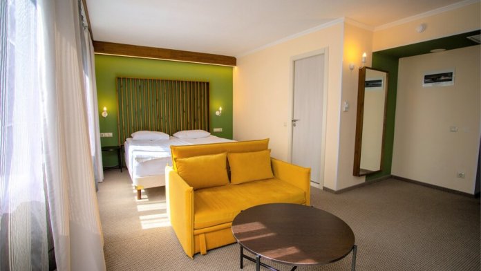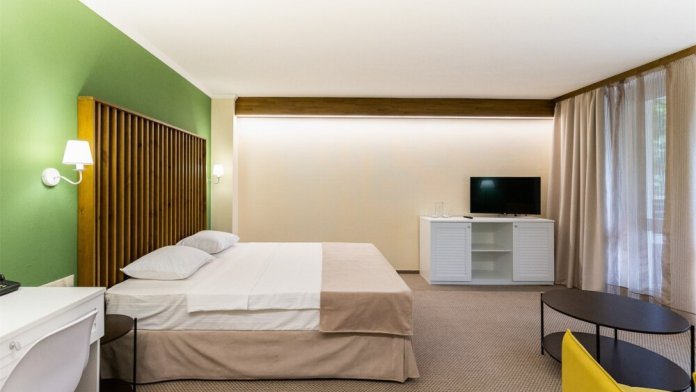 Стильный и современный однокомнатный номер. В номере одна двуспальная или две односпальных кровати, раскладной диван, телевизор, кондиционер, холодильник, рабочий стол, ванная комната с душевой и косметическими средствами, фен, тапочки, халат.