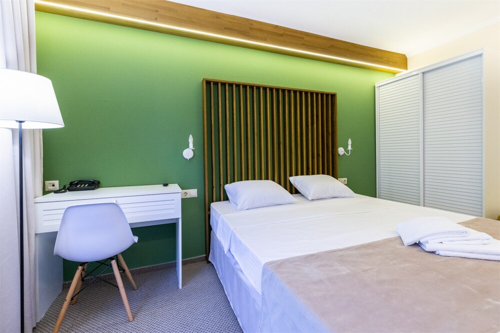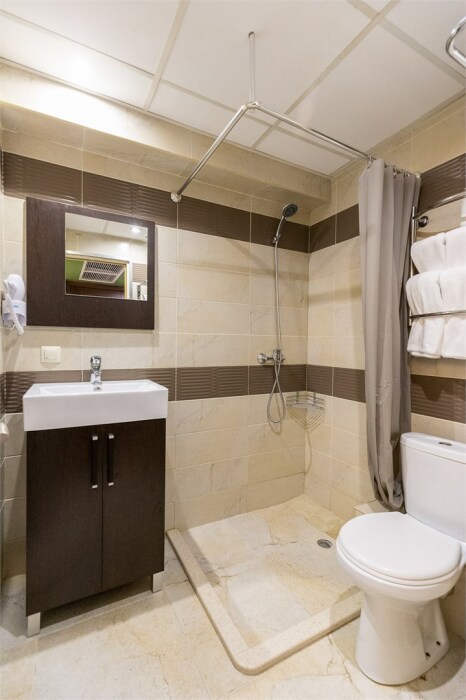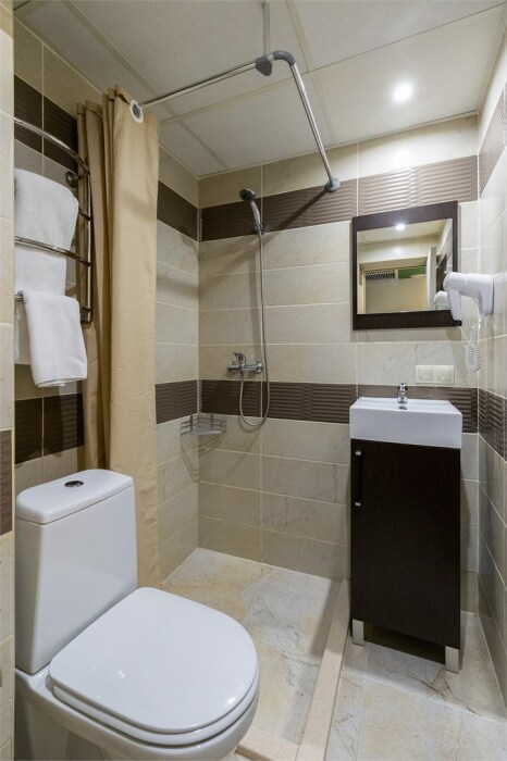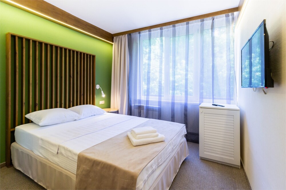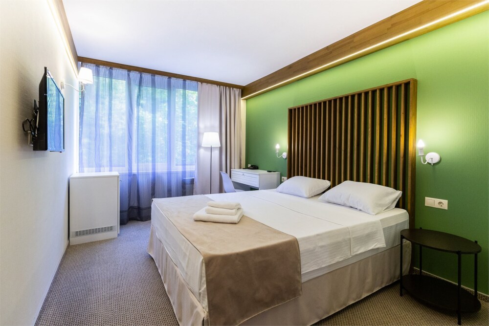 Стильный и современный однокомнатный номер. В номере одна двуспальная или две односпальных кровати, телевизор, кондиционер, холодильник, рабочий стол, ванная комната с душевой и косметическими средствами, фен, тапочки, халат.