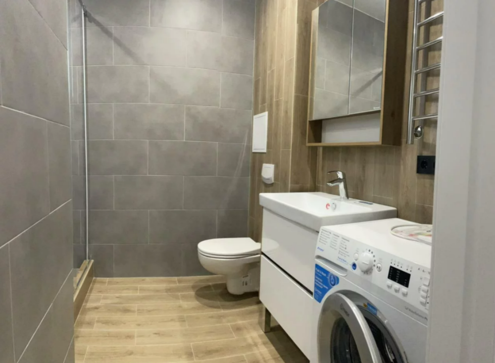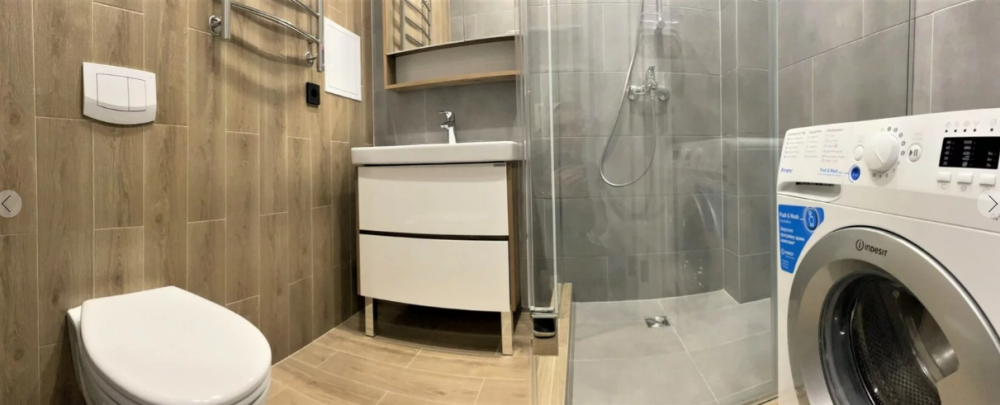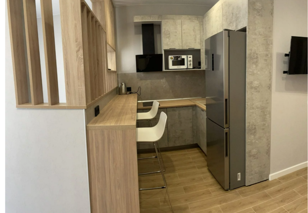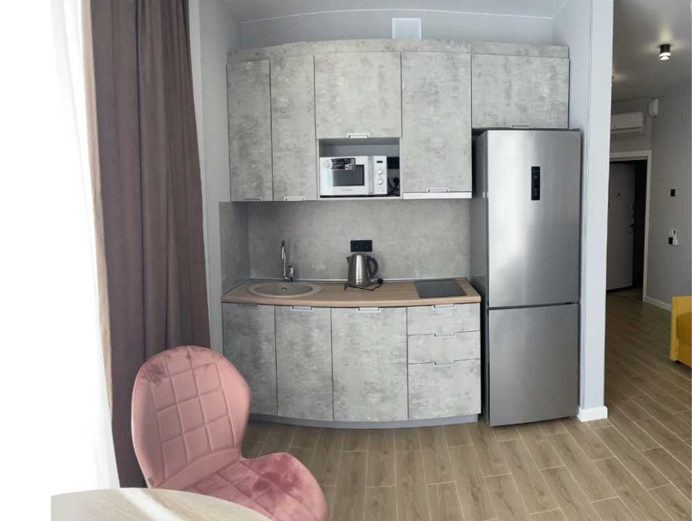 В номере: ванная комната (душ, туалет, раковина, стиральная машинка, фен, халаты, тапочки), телевизор, кондиционер, двуспальная кровать, тумбы, шкаф-купе, двуспальный раскладной диван, кухня (холодильник, посудомоечная машина, микроволновая печь, чайник, посуда, плита).