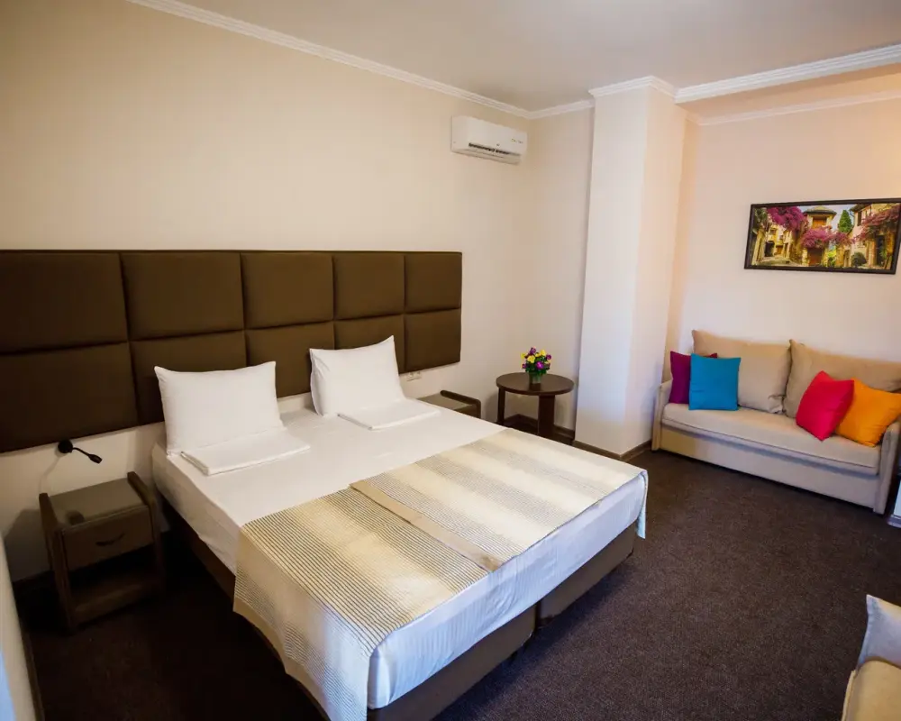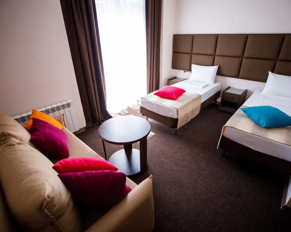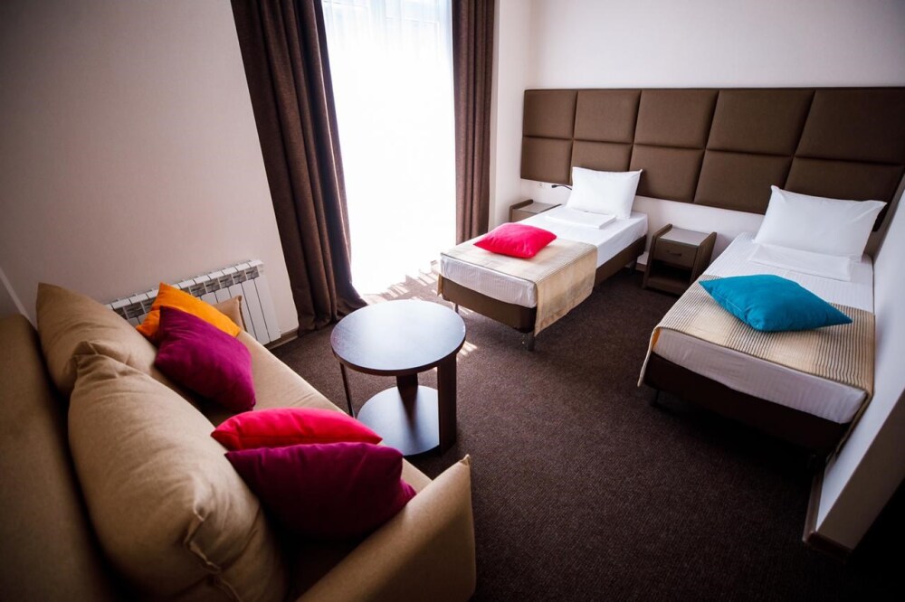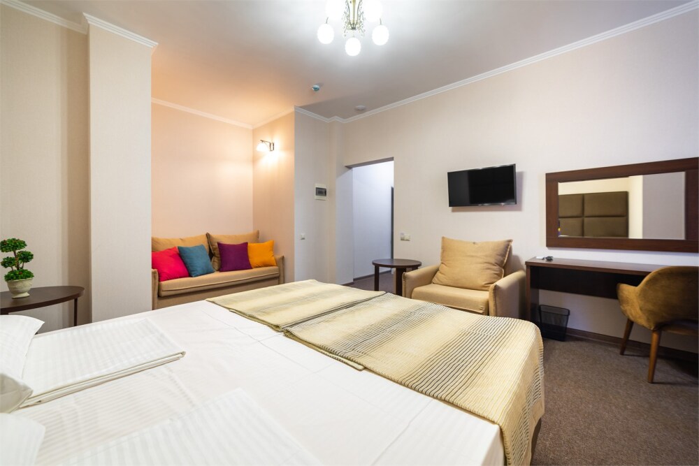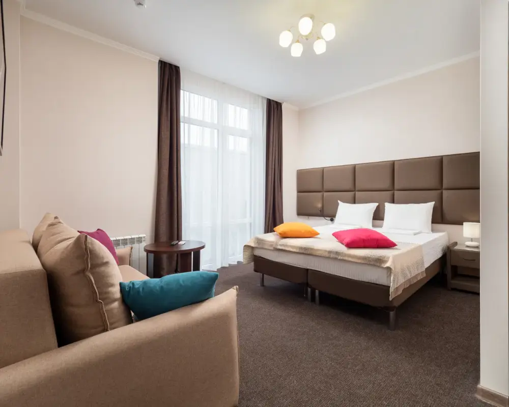 В номере: 1 двуспальная кровать или 2 односпальных кровати, 1 двуспальный диван.