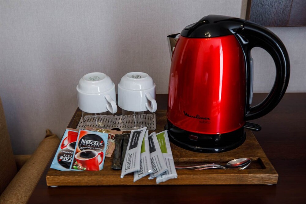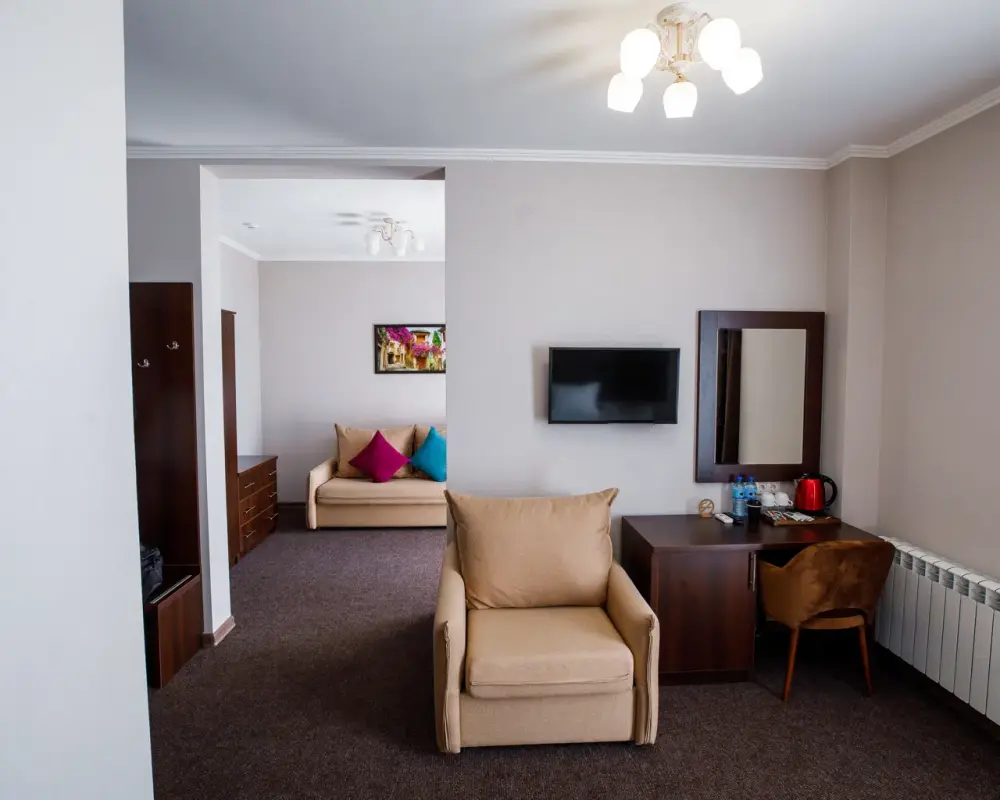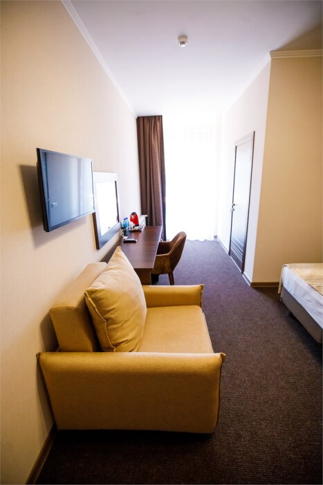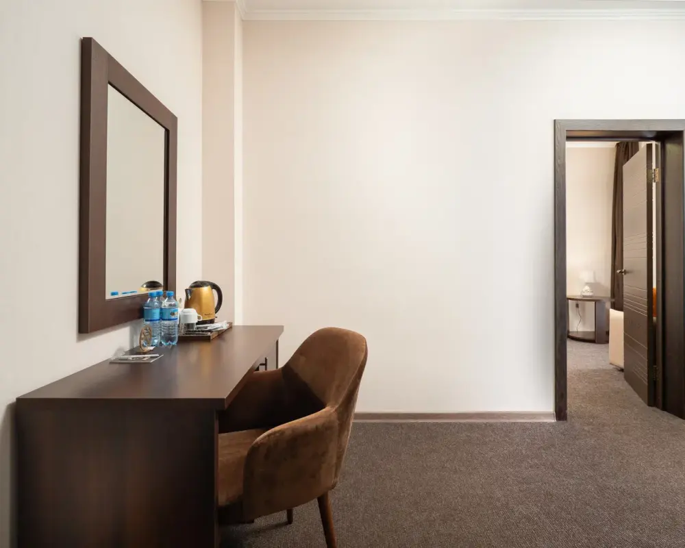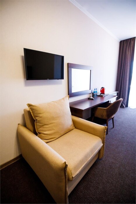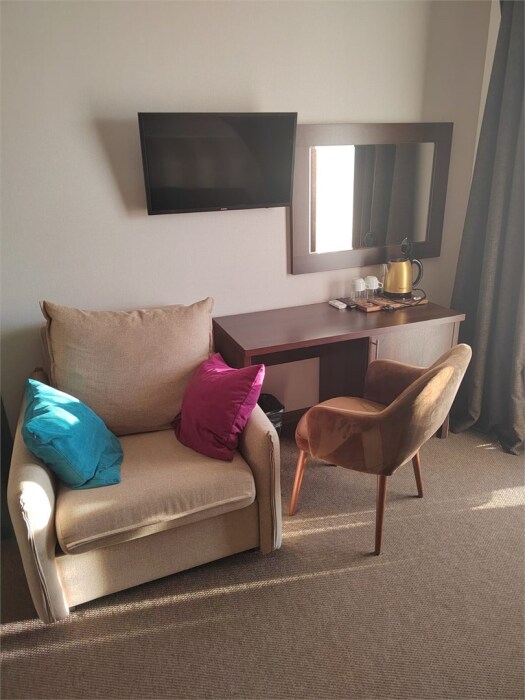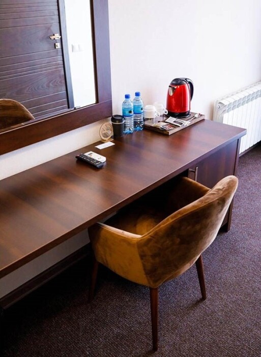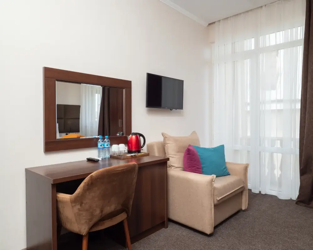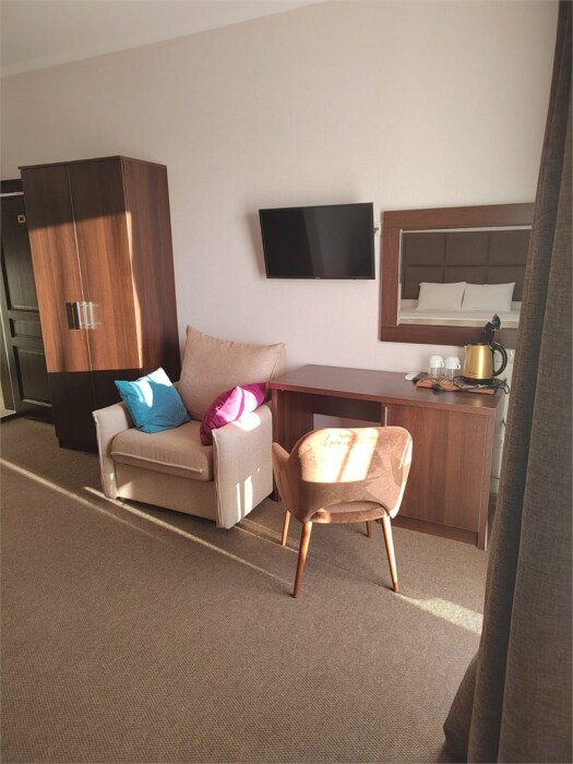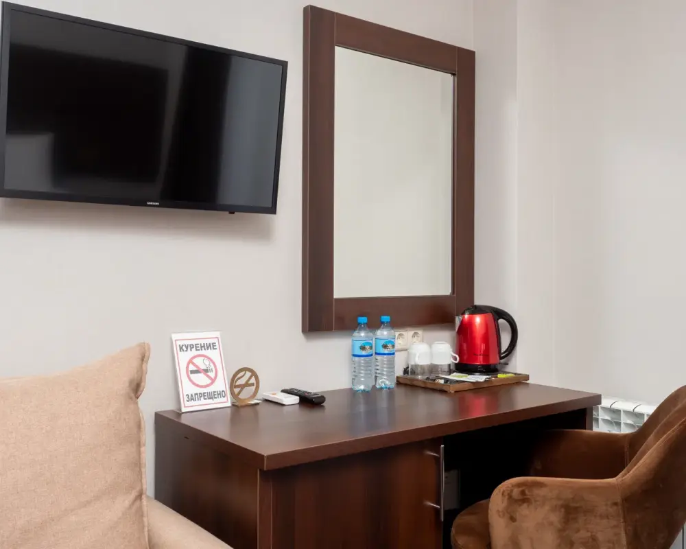 В номере имеется телевизор, кондиционер, шкаф, вешалки, зеркало, туалетный столик, холодильник, рабочий стол, стулья, чайник.