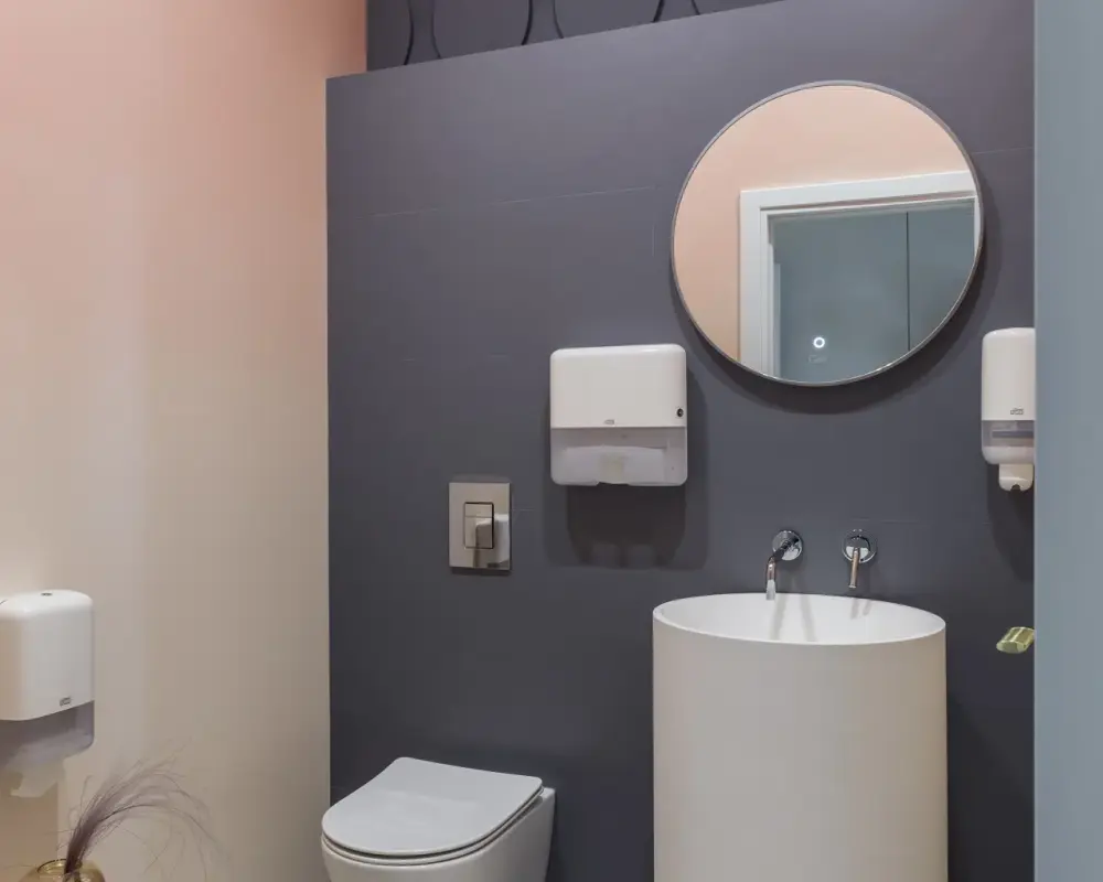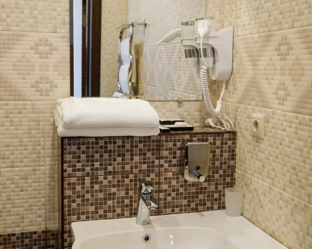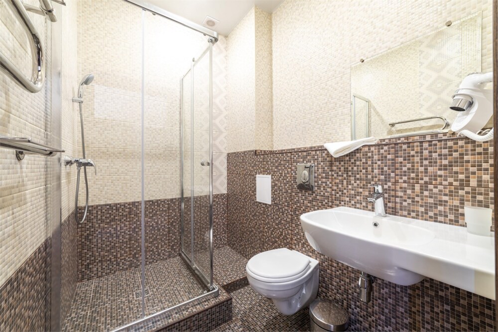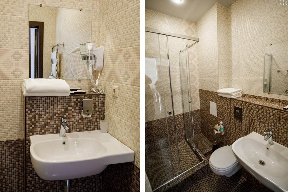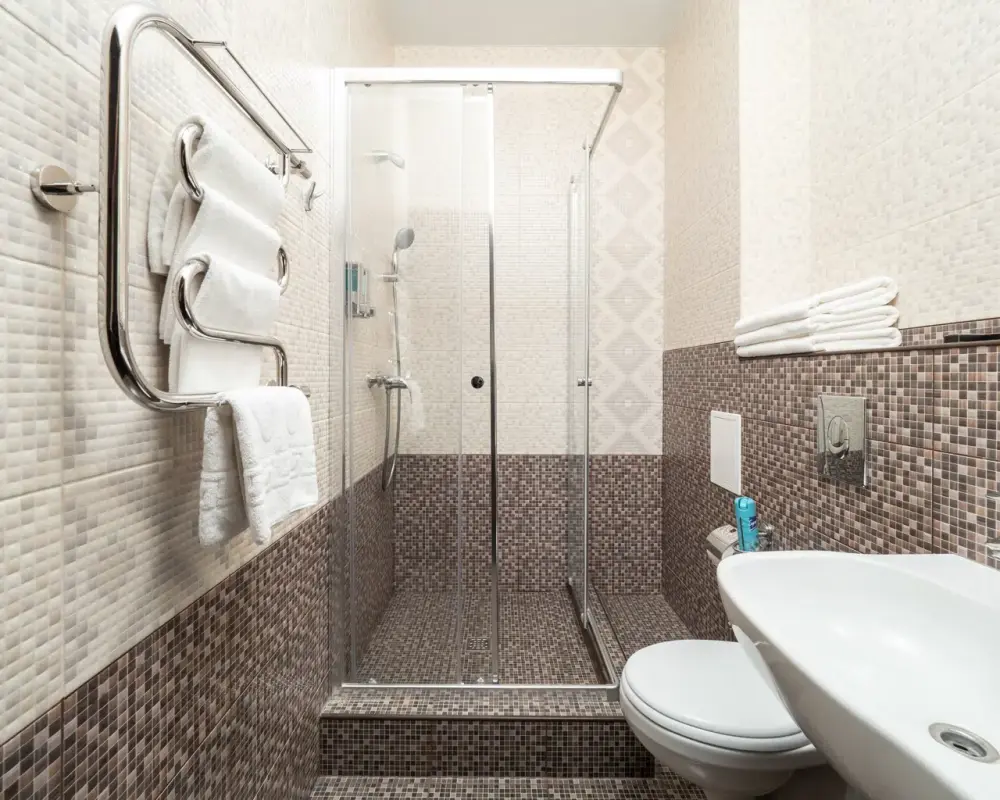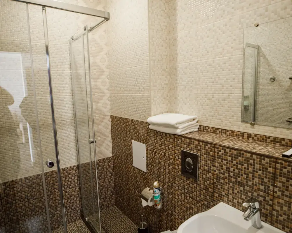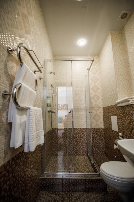 Индивидуальная ванная комната: душ, раковина, туалет.