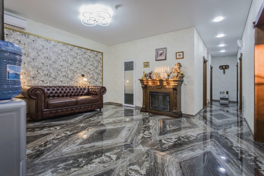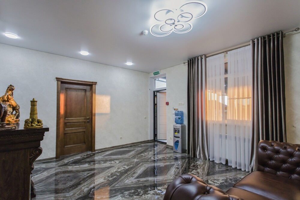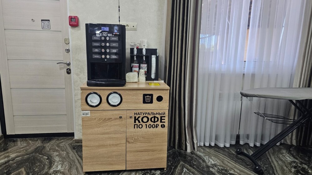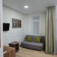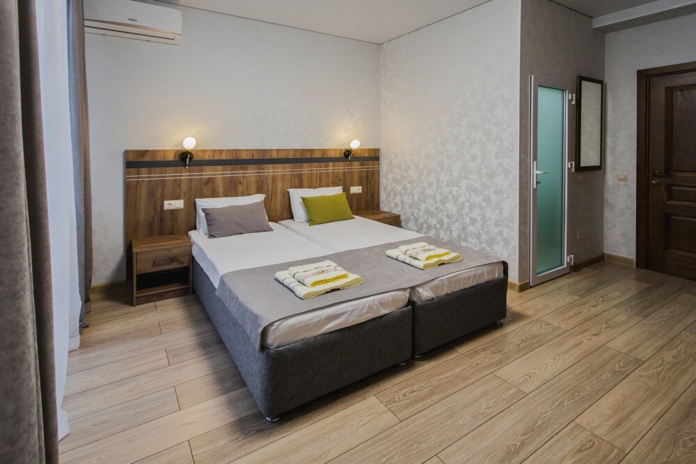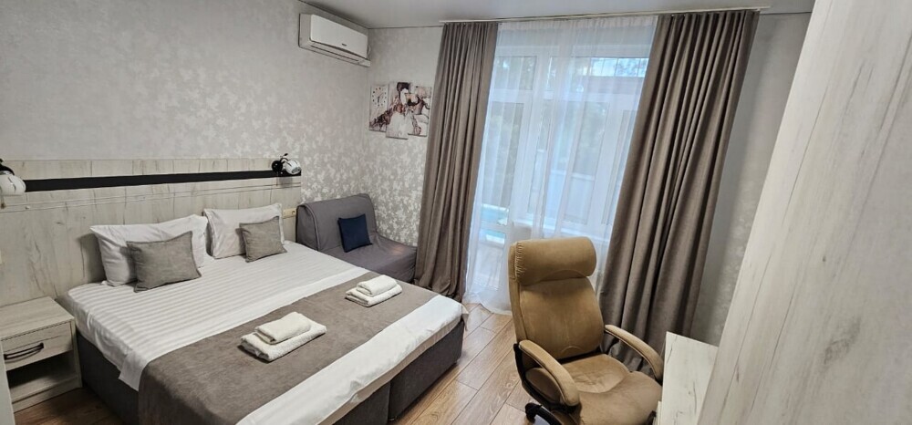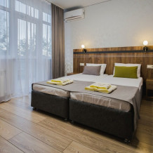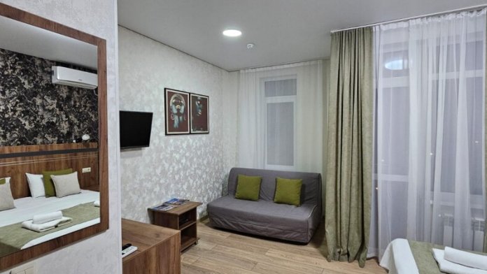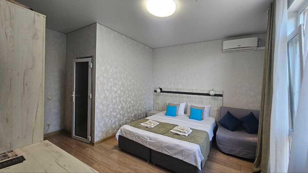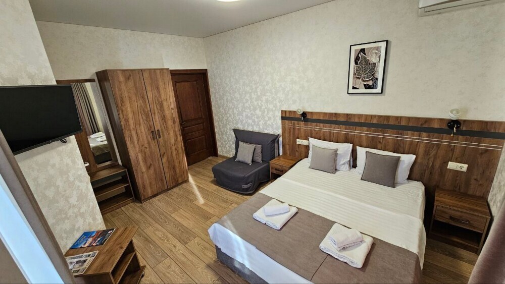 В номере: 1 двуспальная кровать или 2 односпальные кровати, 1 двуспальный диван, 1 кресло - кровать. Имеется телевизор, кондиционер, шкаф, вешалка, зеркало, журнальный столик, холодильник, стулья, корзина для мусора. Индивидуальная ванная комната: душ, раковина, туалет. В стоимость входит: Постельное бельё, полотенца, мыло.