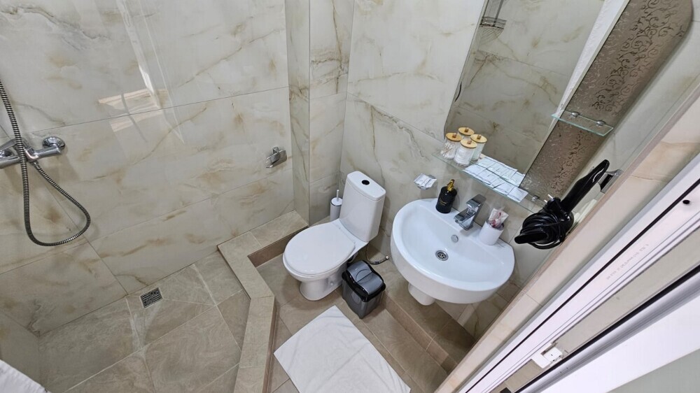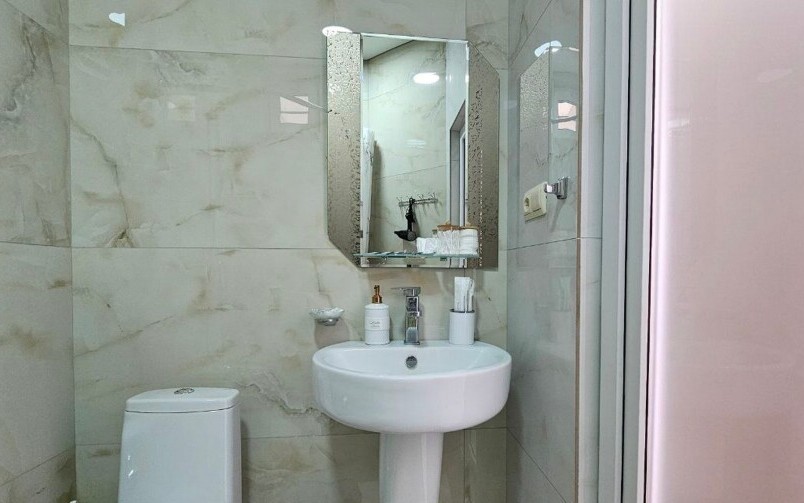Индивидуальная ванная комната: душ, раковина, туалет.