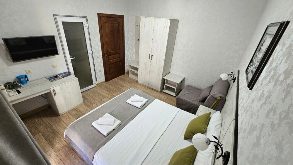 В номере: 1 двуспальная кровать, 1 диван односпальный, 1 еврораскладушка.