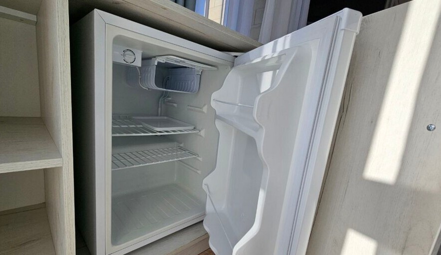 Имеется телевизор, кондиционер, шкаф, вешалка, зеркало, журнальный столик, холодильник, стулья, корзина для мусора.