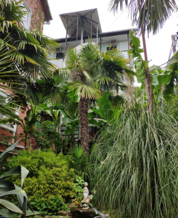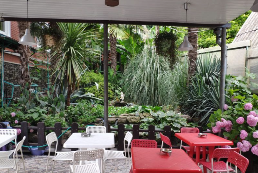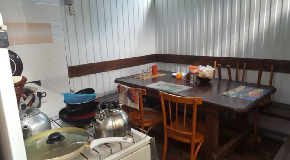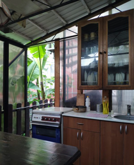 На территории к услугам гостей благоустроенный, зеленый двор, пруд, небольшой бассейн, зоны для отдыха на свежем воздухе, мангал, пять общих кухонь, оборудованных для самостоятельного приготовления пищи.