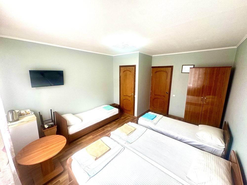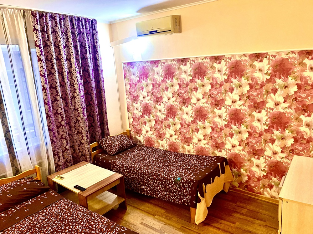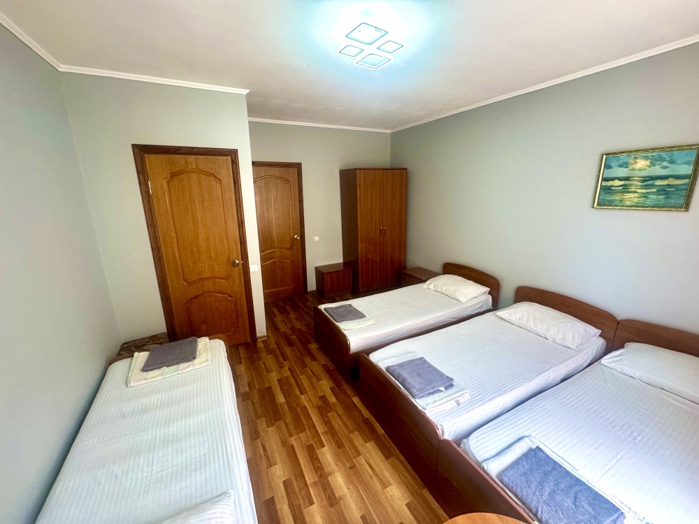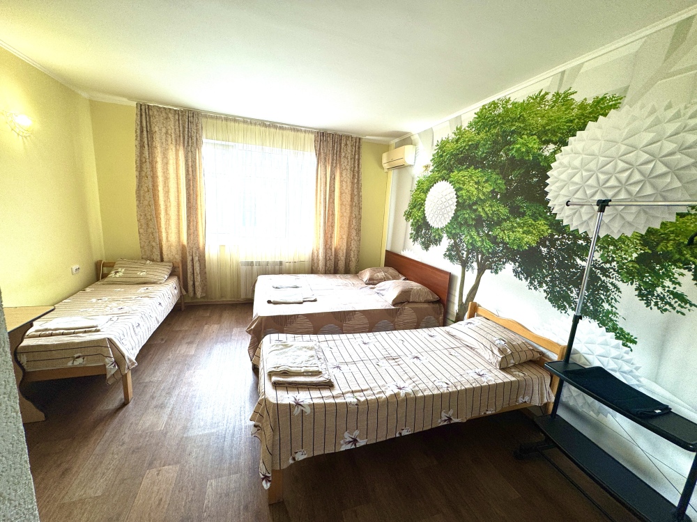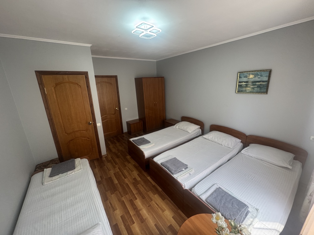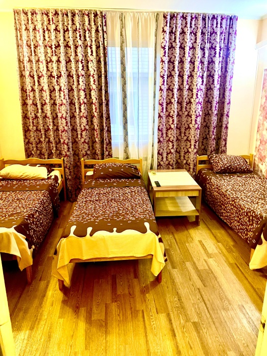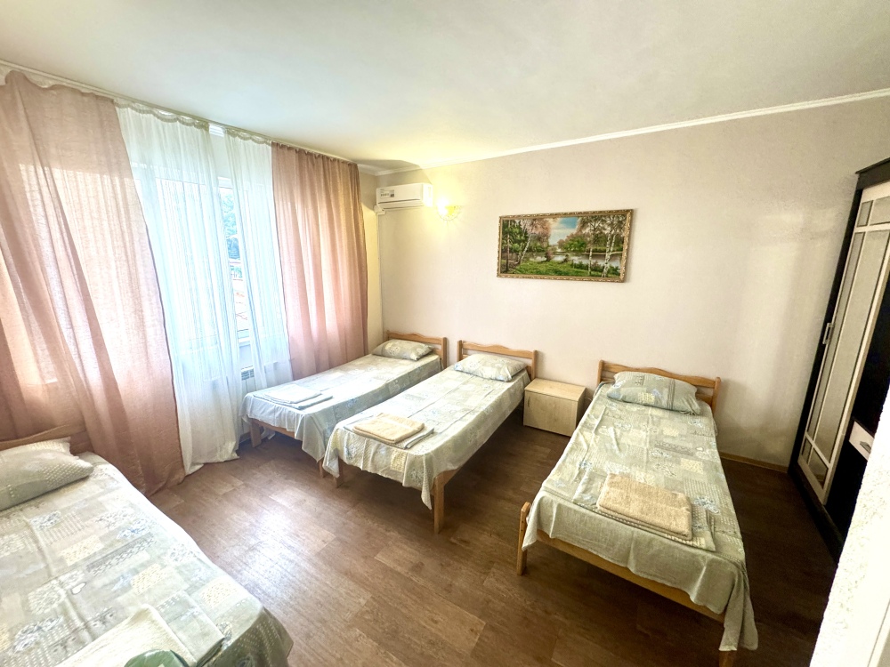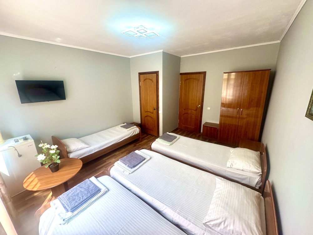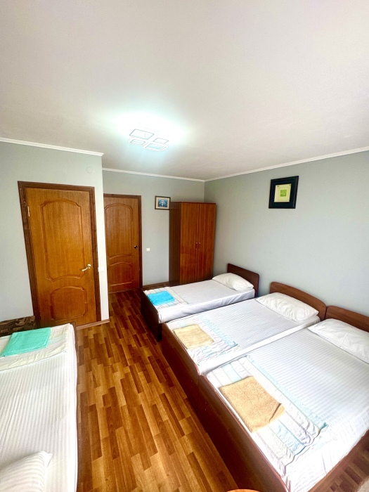 Номер на 4м этаже. В номере одна двуспальная кровать и две односпальные кровати. Или четыре односпальные кровати. Комплектацию номера уточняйте.