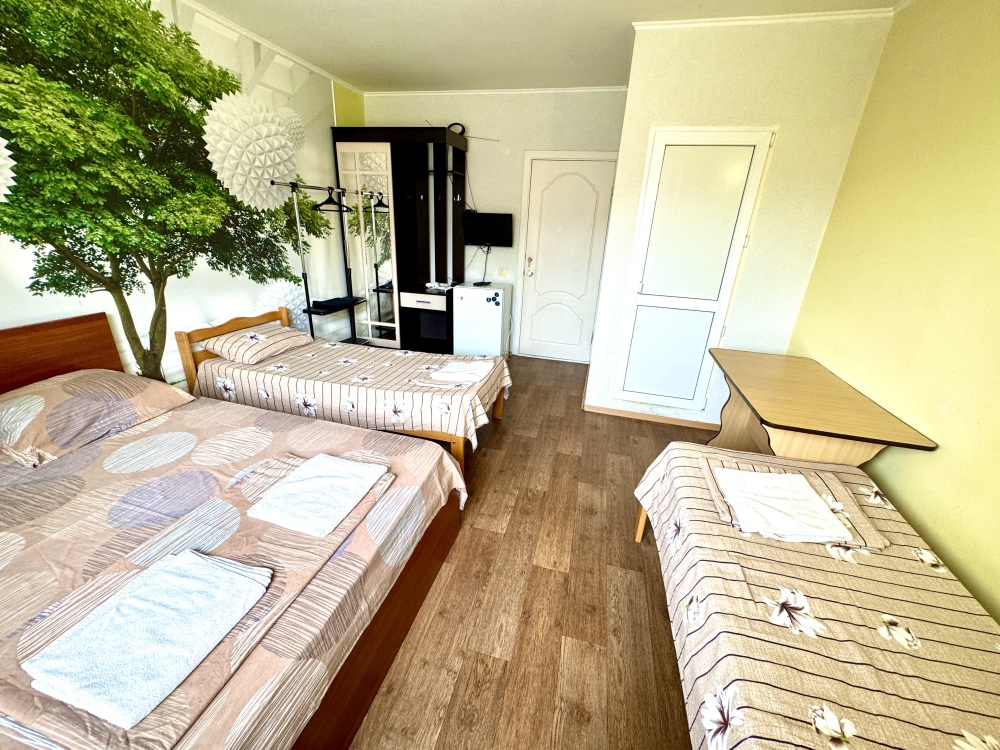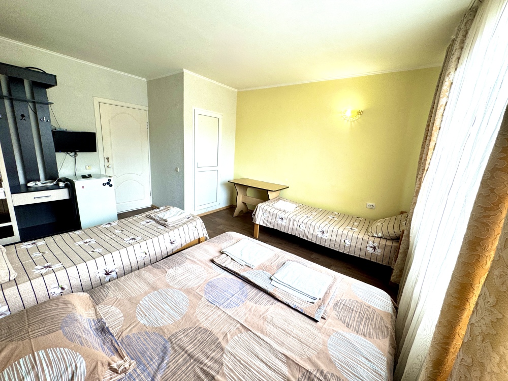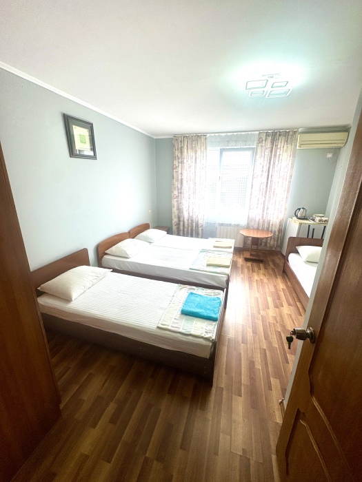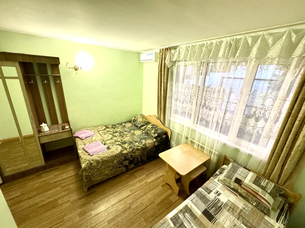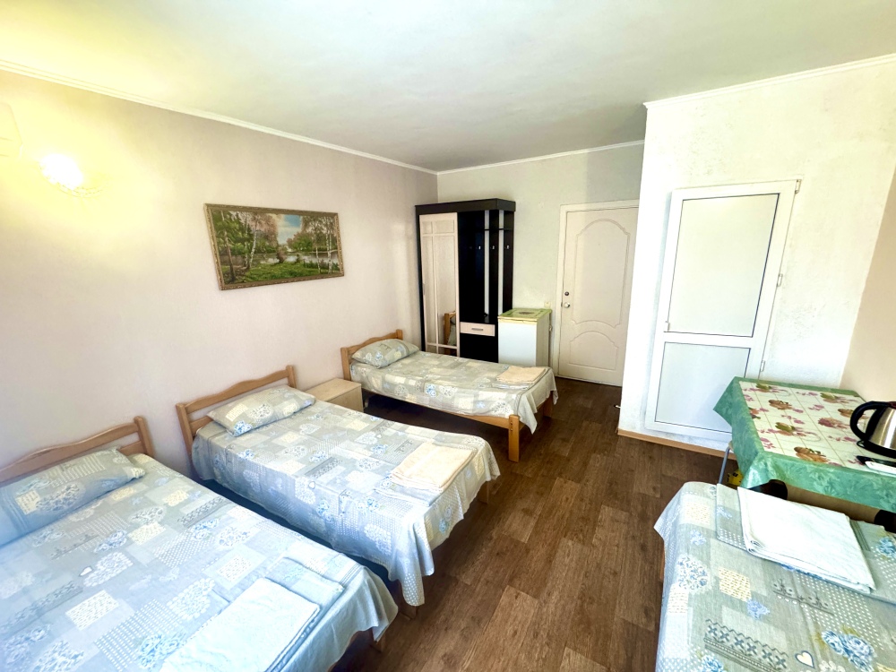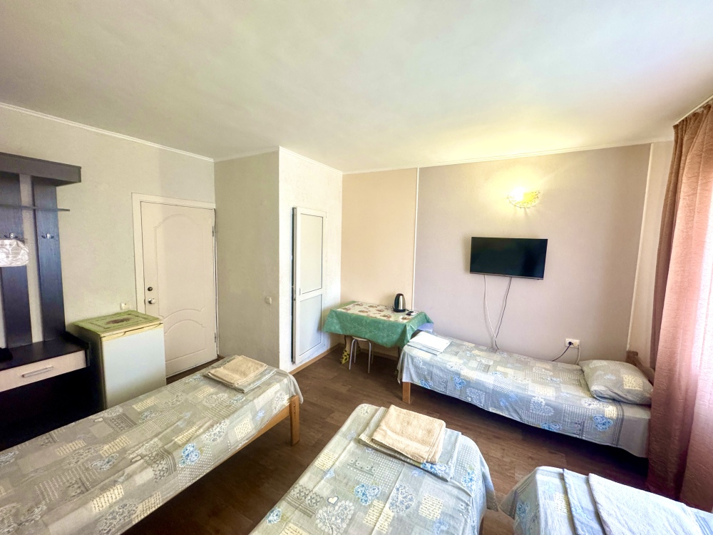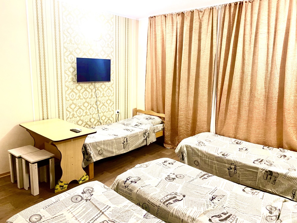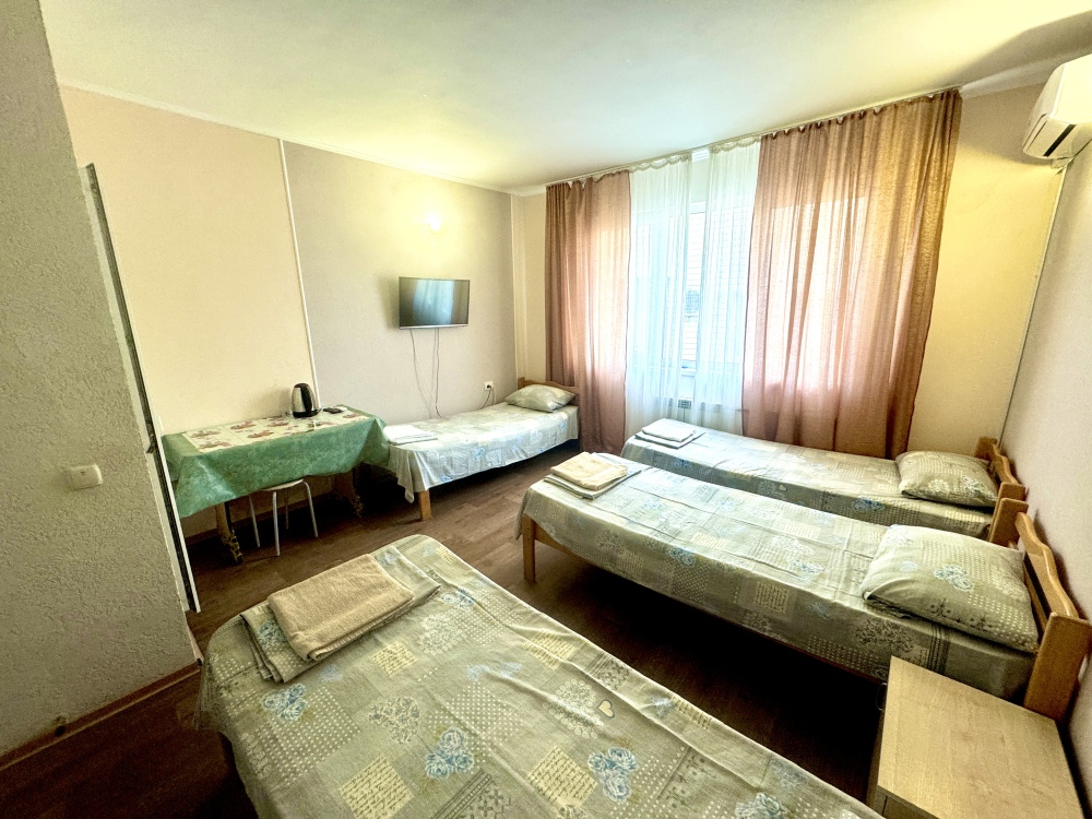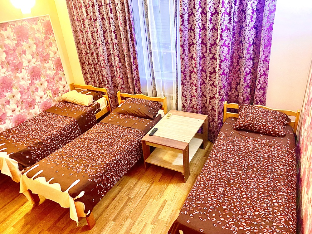Номер на 4м этаже. В номере одна двуспальная кровать и две односпальные кровати. Или четыре односпальные кровати. Комплектацию номера уточняйте.