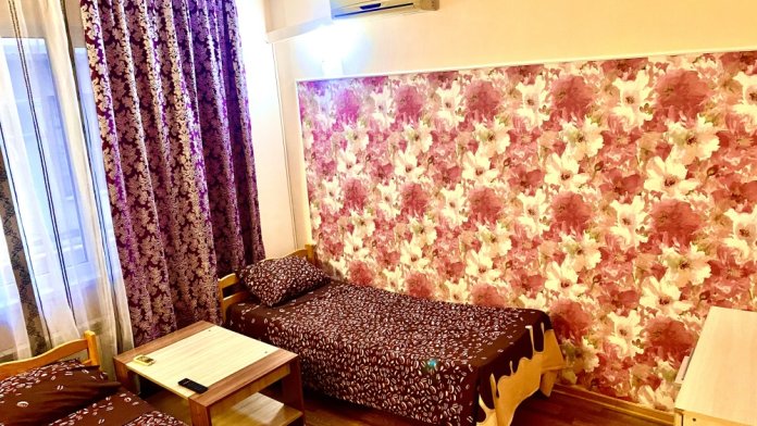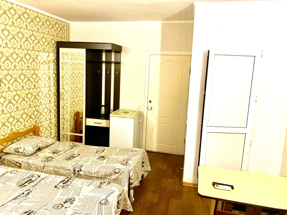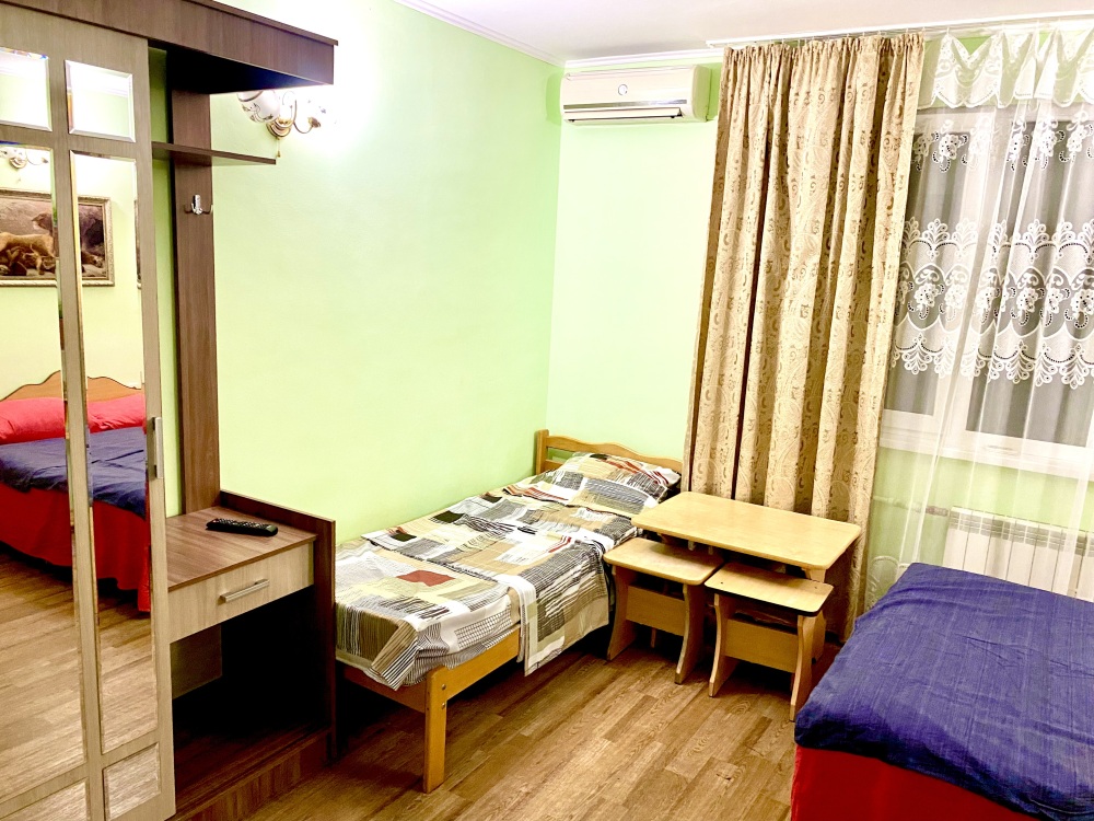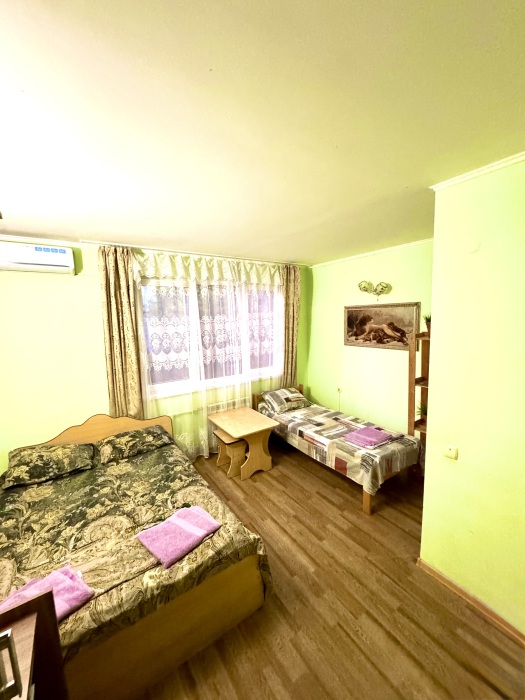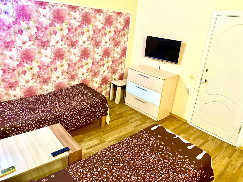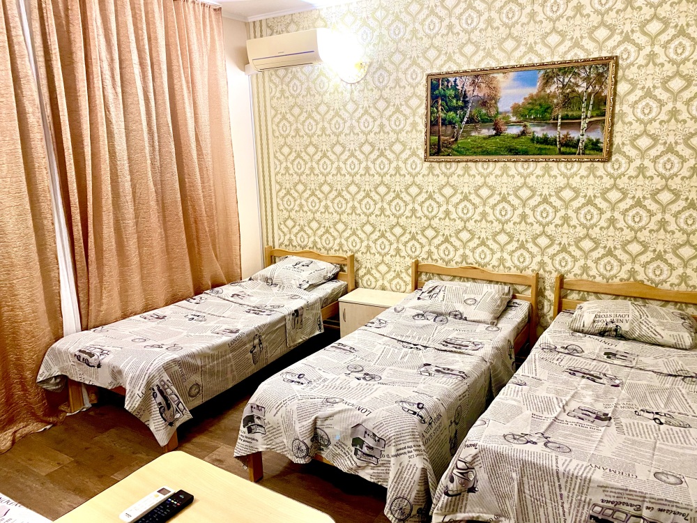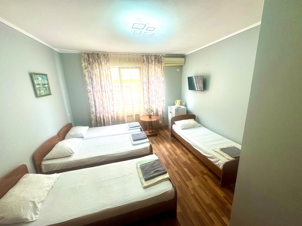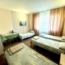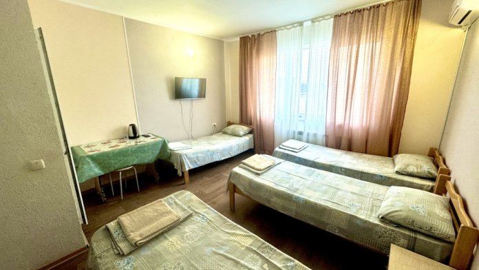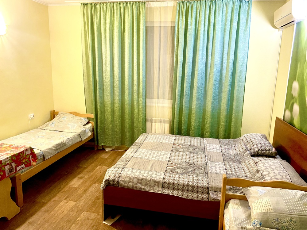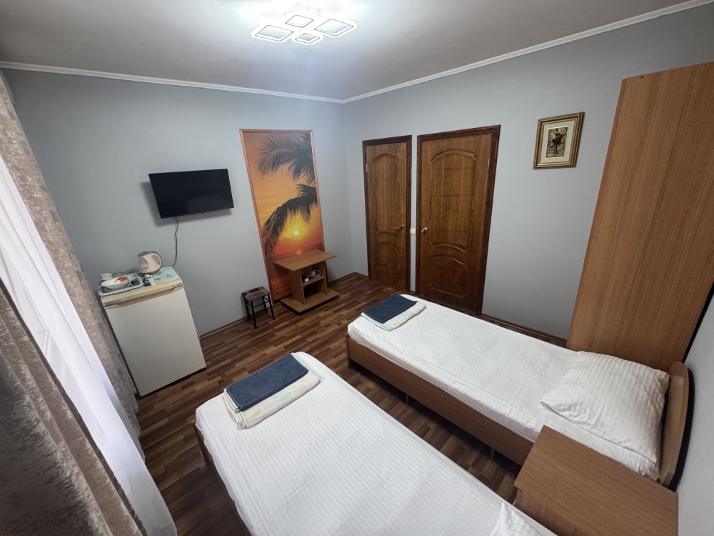 Номер на 4м этаже. В номере одна двуспальная кровать и две односпальные кровати. Или четыре односпальные кровати. Комплектацию номера уточняйте.