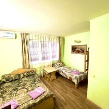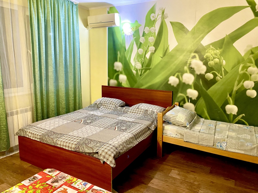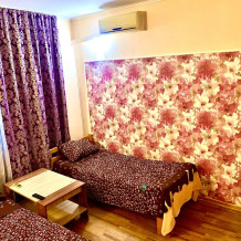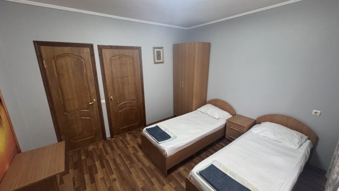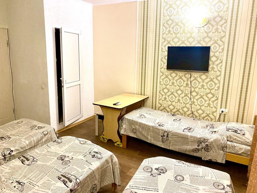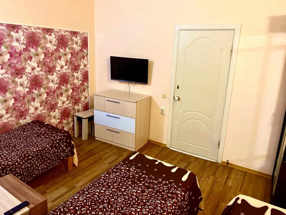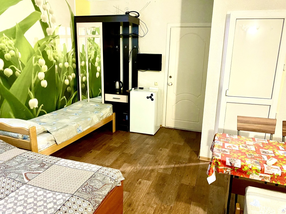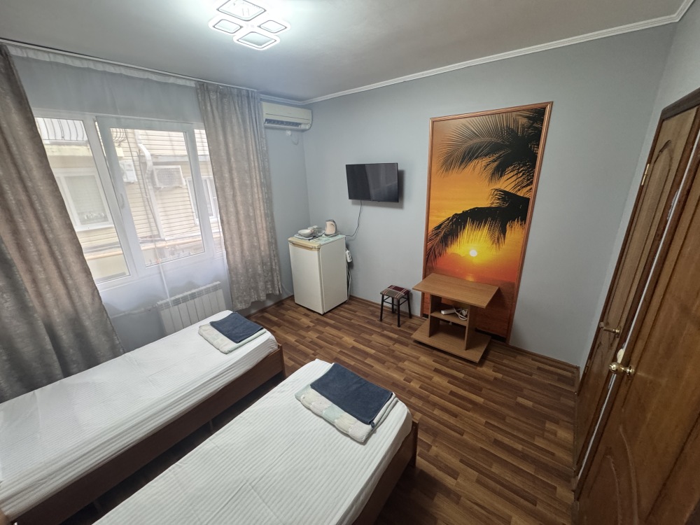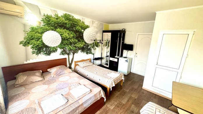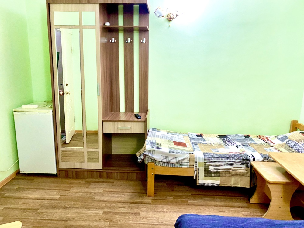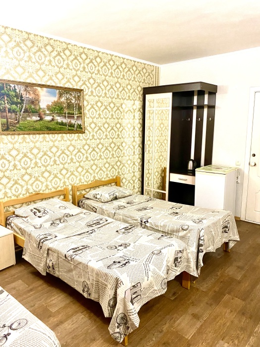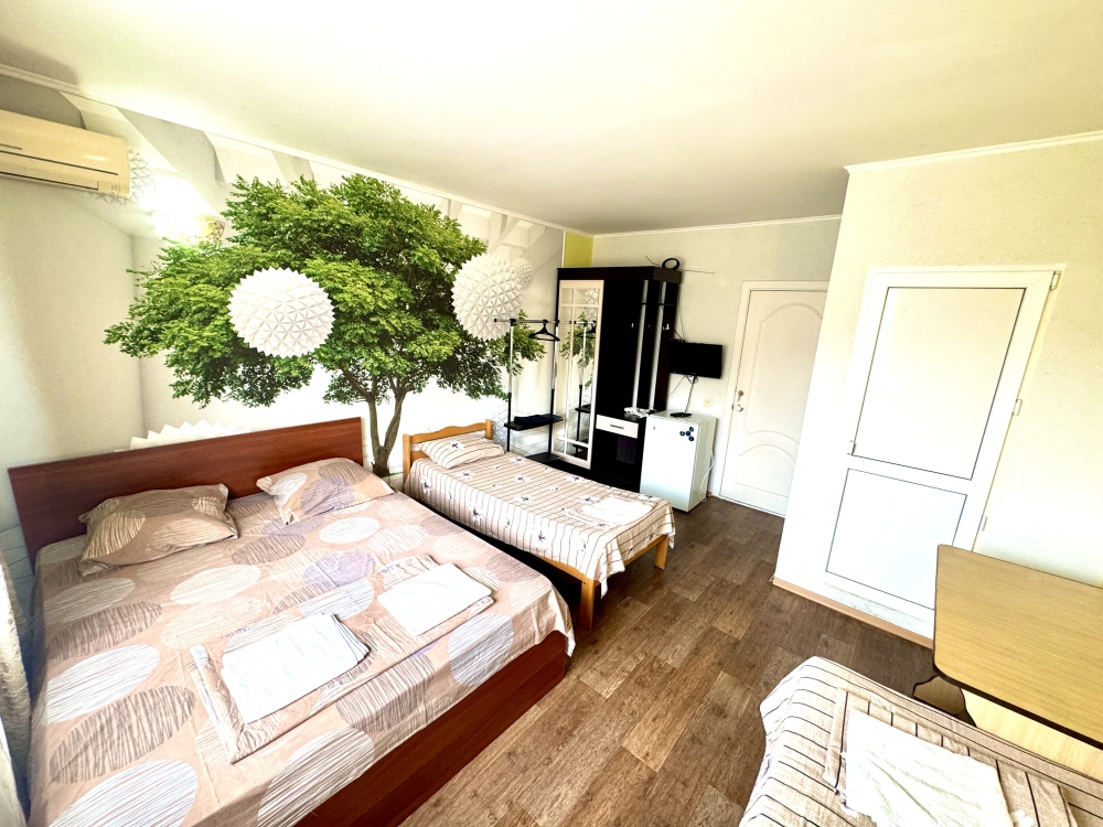 Номер на 4м этаже. В номере одна двуспальная кровать и две односпальные кровати. Или четыре односпальные кровати. Комплектацию номера уточняйте.