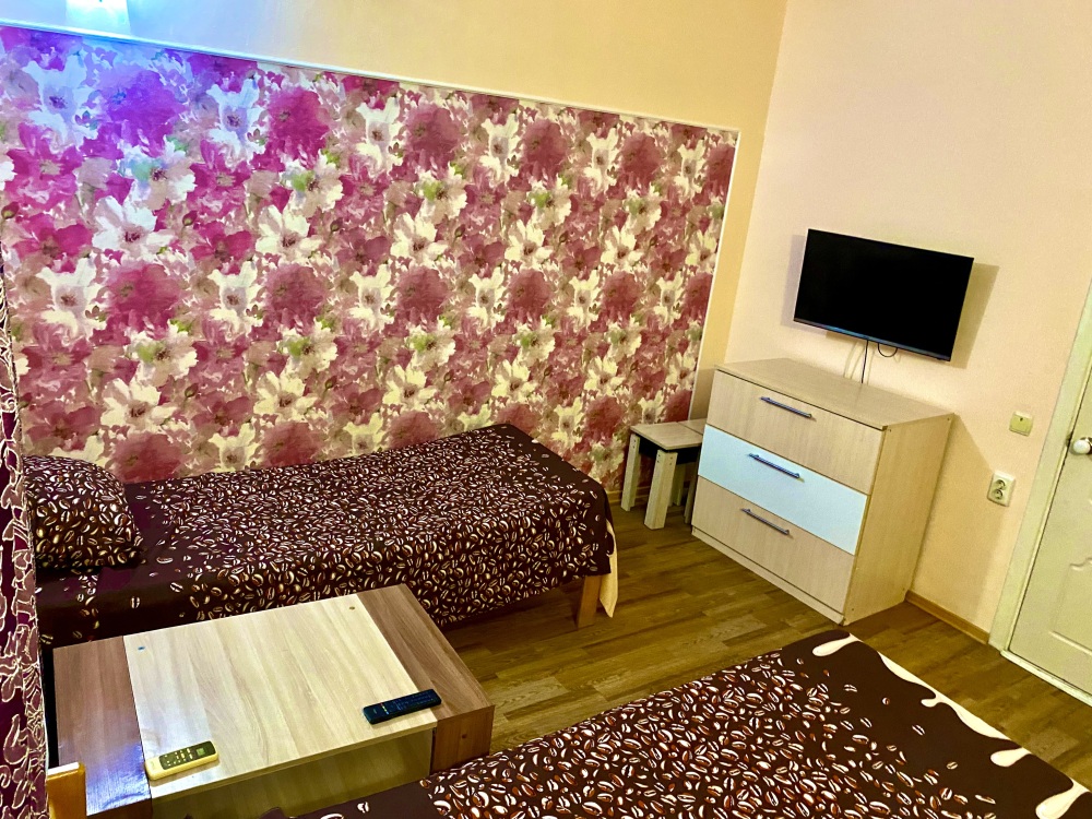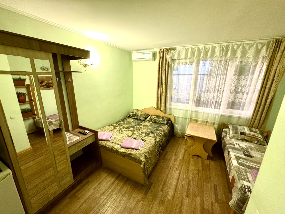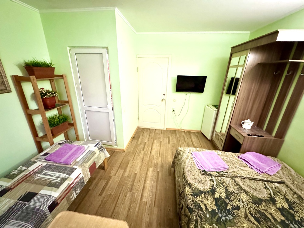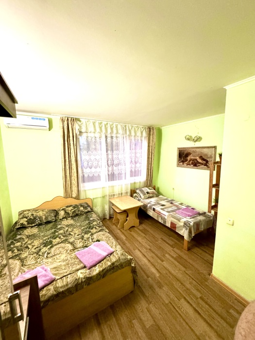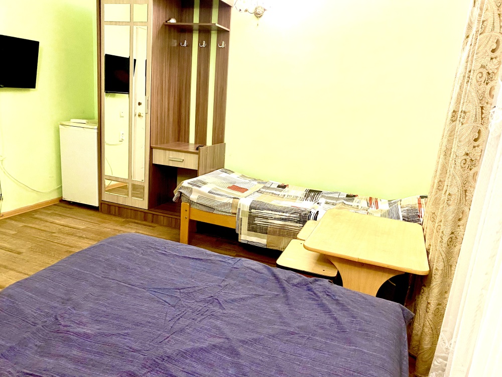 Номер на 4м этаже. В номере одна двуспальная кровать и одна односпальная кровать. Или две односпальные кровати и кресло кровать. Комплектацию номера уточняйте.