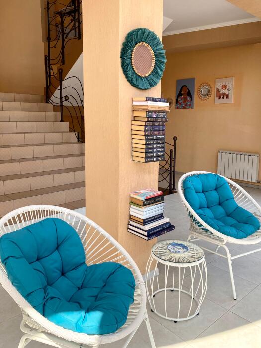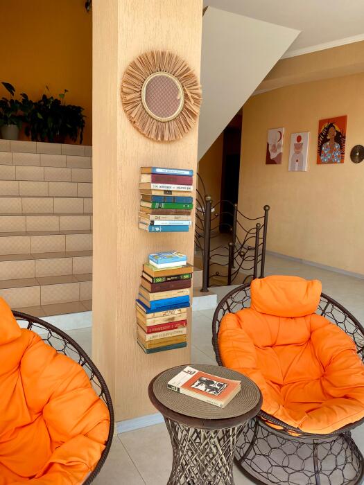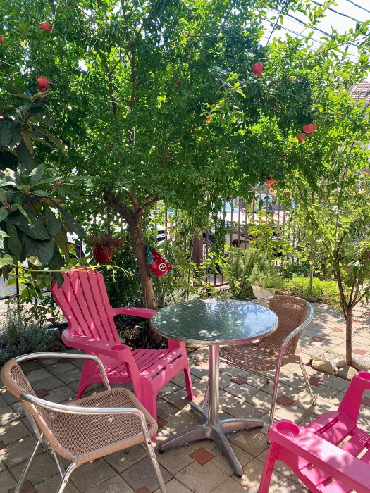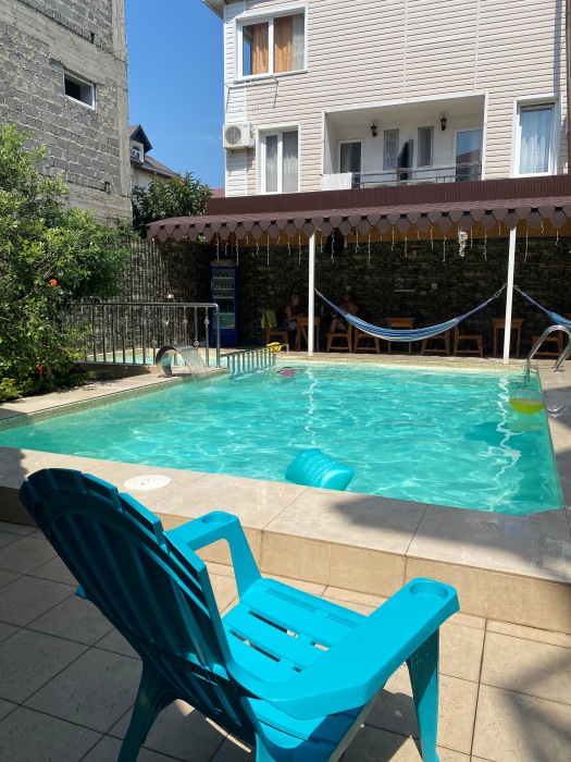 Во дворе мини-гостиницы, имеется огромный бассейн с подогревом. Он состоит из 2 зон: детской и взрослой. Также, для детей предоставляется уголок с домиком и игрушками - что позволит взрослым наслаждаться отдыхом в зоне барбекю, загорать, плавать в бассейне и присматривать за детьми. Рядом с бассейном имеется мангал, множество столов для пикника, качели, гамаки и шезлонги.