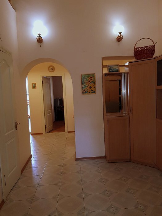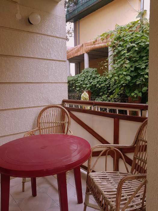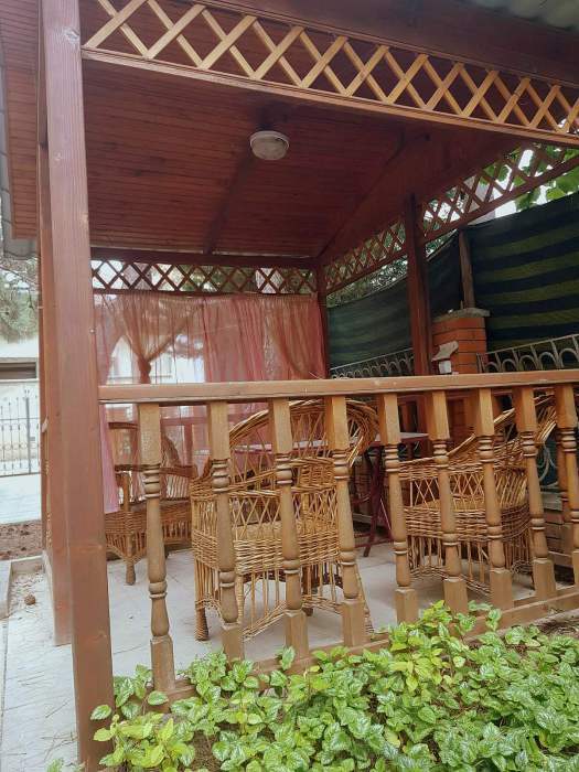 Комфортабельный, на охраняемой территории. Красивый дворик с деревянной беседкой, плетеными креслами и экзотическими цветами, есть мангал. В доме мягкая мебель, оборудованная техникой кухня, 2 санузла, 2 кондиционера, 2 балкона.