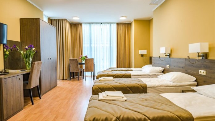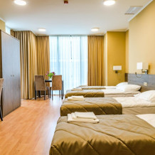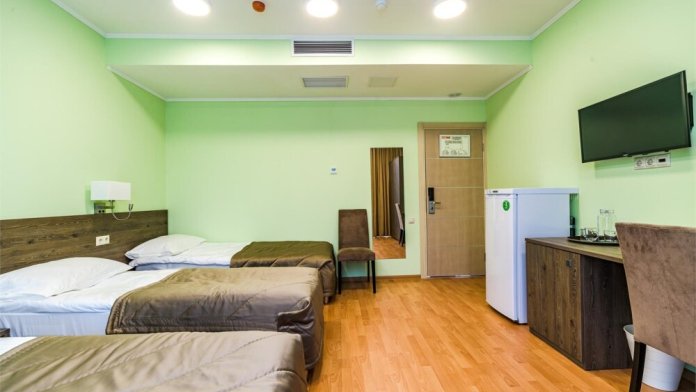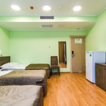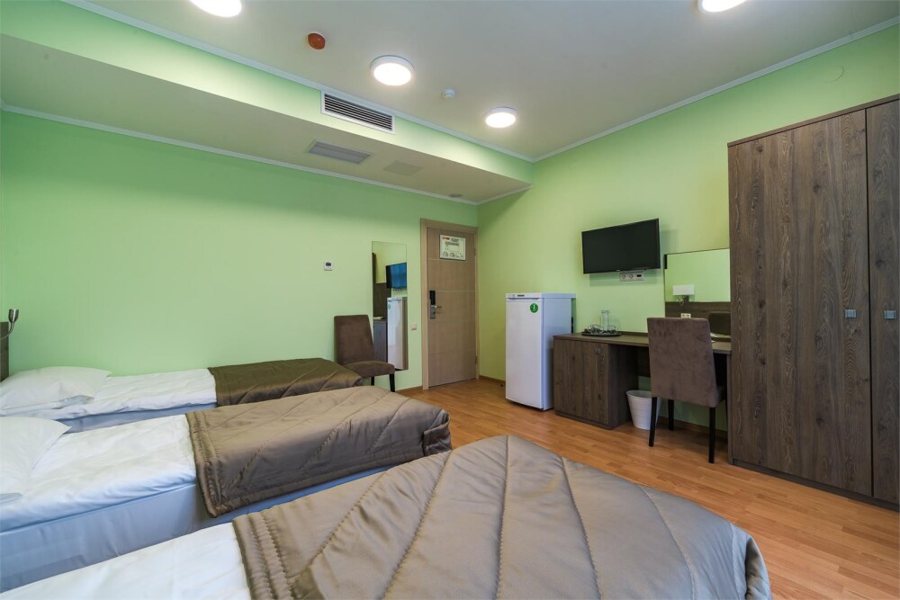 В номере имеются три кровати, 3 стула, туалетный стол с зеркалом, набор посуды (графин и чашки), 3 прикроватные тумбочки, 3 прикроватных бра, телевизор, холодильник, телефон, сейф, шкаф, зеркало настенное, Вешалка для верхней одежды.