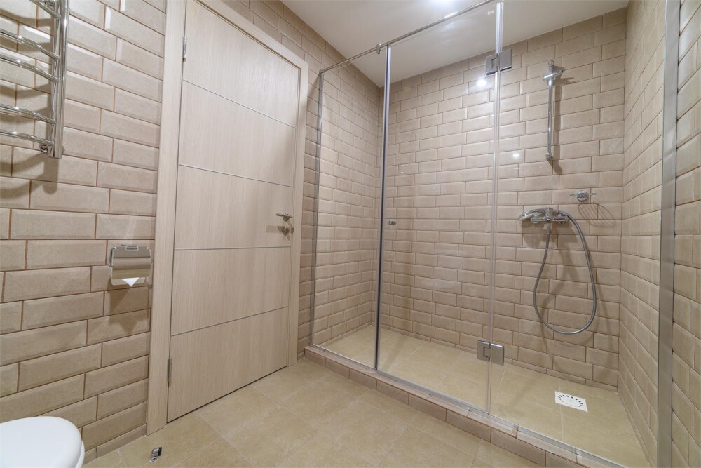 Санузел оснащен душевой кабиной, умывальником, унитазом, зеркалом с подсветкой, феном.