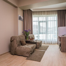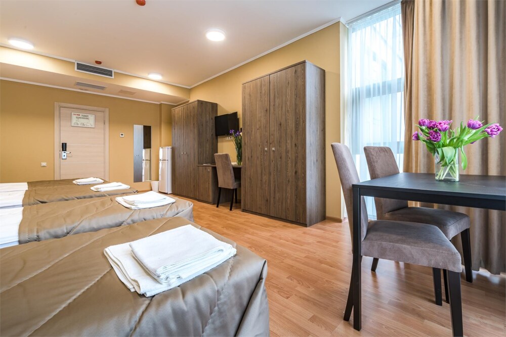 Номер состоит из одной комнаты, санузла, прихожей. В номере имеются 2 кровати, кресло-кровать, стул, 2 стола журнальный, туалетный с зеркалом набор посуды (графин и чашки), 2 прикроватные тумбочки, 2 прикроватные бра, телевизор, холодильник, телефон, сейф, шкаф.