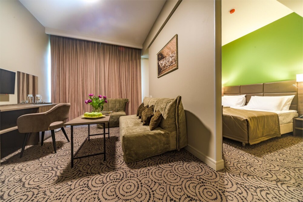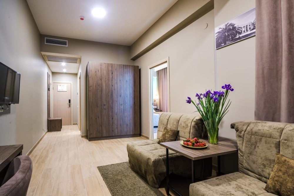 В номере имеются 2 кровати, стул, диван, 3 кресло-кровати, стол туалетный с зеркалом, набор посуды (графин и две чашки), стол журнальный, стол под телевизор; 2 прикроватные тумбочки, 2 прикроватных бра, 2 телевизора, холодильник, телефон, сейф, шкаф. Санузел оснащен душевой кабиной, умывальником, унитазом, зеркалом с подсветкой, феном.