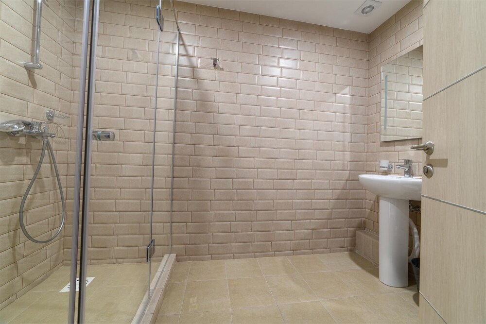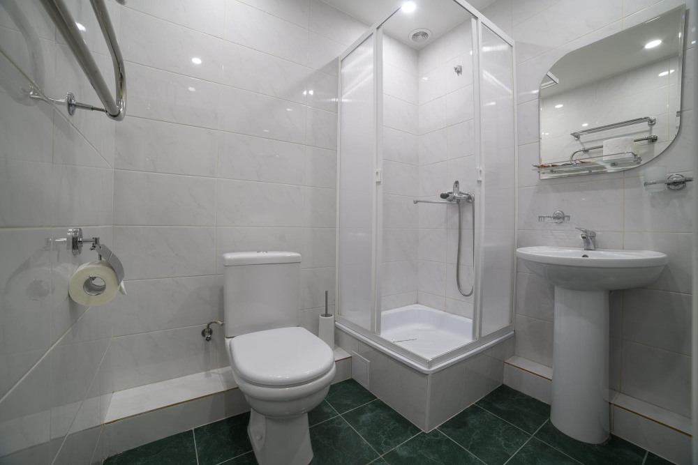 Санузел оснащен: специализированной душевой кабиной, умывальником, унитазом оборудован поручнем, зеркалом с подсветкой, феном.