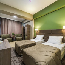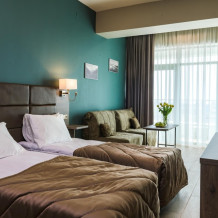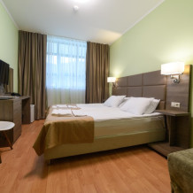 Номер состоит из одной комнаты, санузла, прихожей. В номере имеются 2 кровати, 0/1/2 кресло-кровать стул, стол туалетный с зеркалом, набор посуды (графин и две чашки), 2 прикроватных тумбочки, 2 прикроватных бра, телевизор, холодильник, телефон, сейф, шкаф.